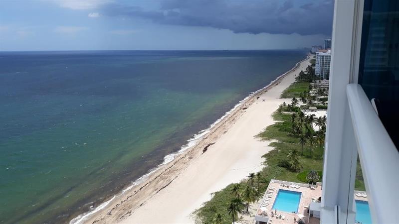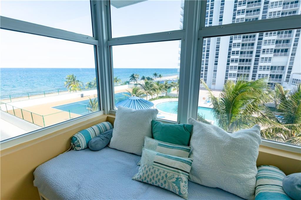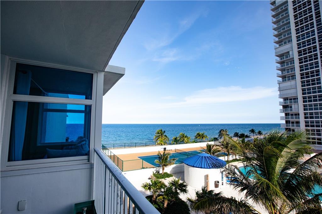 Fabulous unit on the fifth floor in a highly sought after, secure building with guards 24/7. Updated kitchen, all impact doors and windows, an open balcony overlooking the pool, tennis courts and ocean in a building with amenities galore! Amenities include a gym with state of the art equipment, tennis courts, social room, billiards, ping-pong, card room, library, work stations with free internet, heated salt water pool, jacuzzi, beachfront lounge, patio with gas grills and a sky lounge. Unit has hardwood and ceramic flooring, washer/dryer, a window seat, retractable door and beautiful views!
