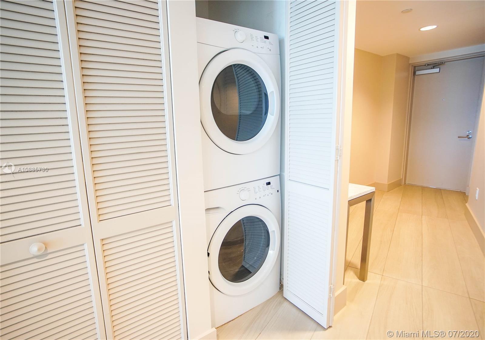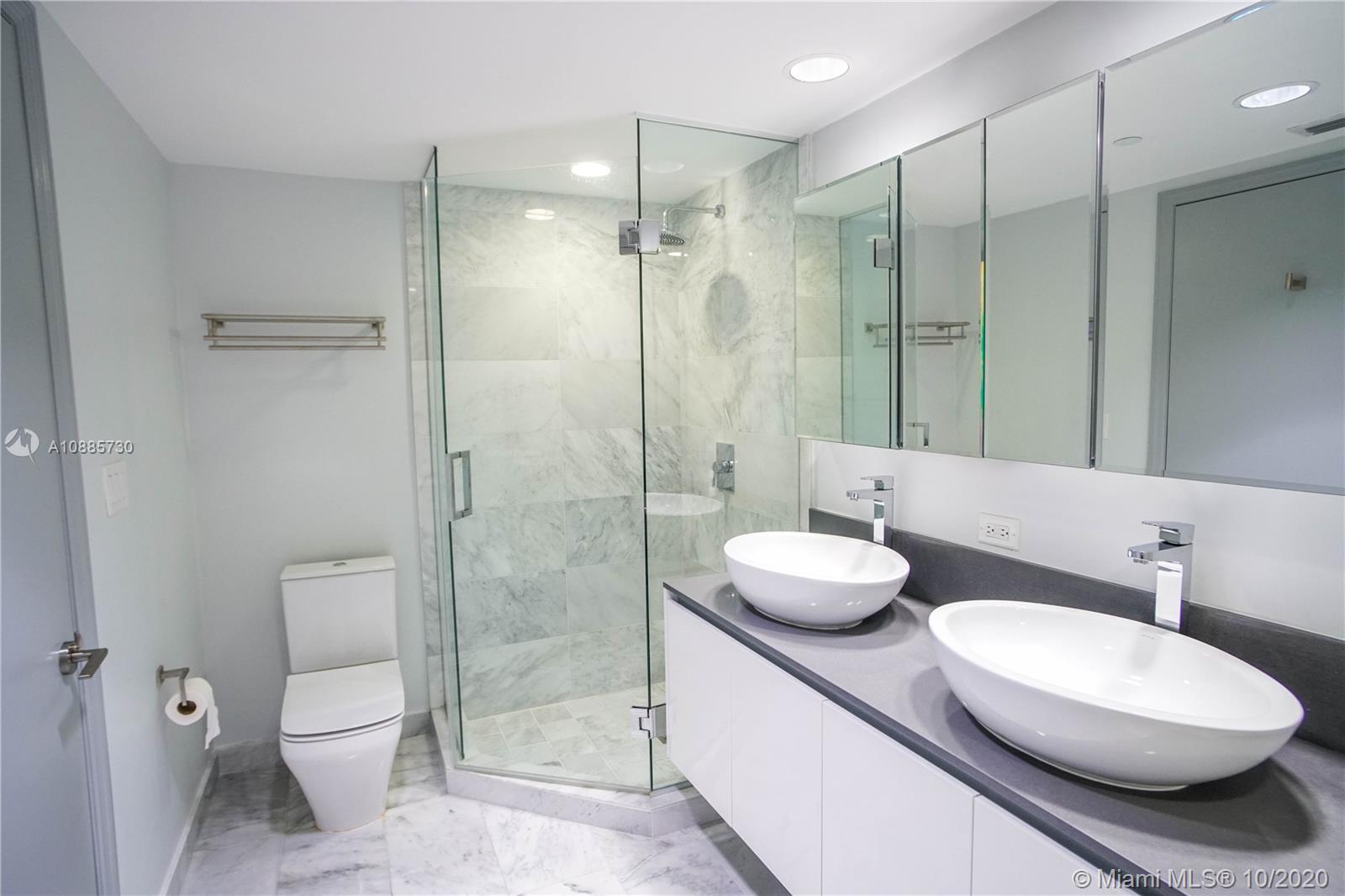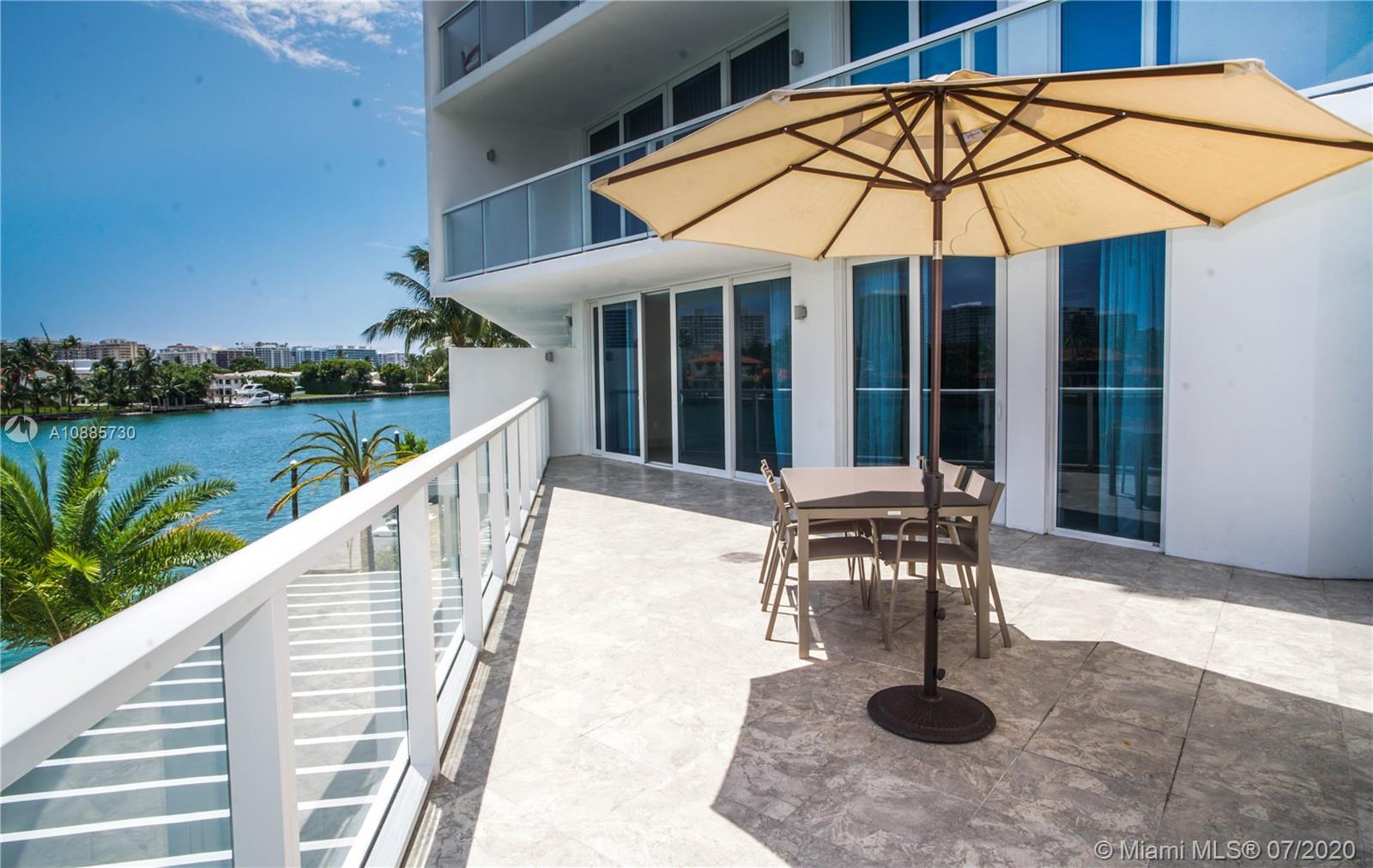 LUXURY INVESTMENT OPPORTUNITY. DIRECT WATER VIEWS from this luxurious 2 bedroom unit at O Residences in Bay Harbor Islands. THIS UNIT HAS THE LARGEST WATERFRONT TERRACE IN THE BUILDING (450 SQFT). Beautiful Italian porcelain floors throughout with marble floors in the bathrooms, updated light fixtures, lots of closet space with built in shelving, floor to ceiling windows, washer and dryer in unit, Viking appliances, quartz counter tops, etc. O Residences offers lots of upscale amenities including BBQ, 2 pools, hot tub, paddle board storage, community dock, gym and relaxing sauna. The HOA includes cable TV and internet. 2 assigned garage and one assigned storage unit. RENTED THROUGH 10/14/22 FOR $3600/MONTH