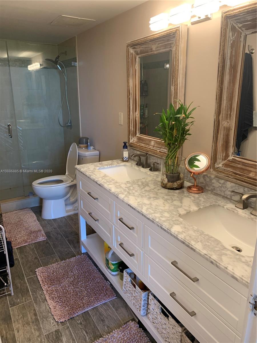 Beautiful corner unit with an unobstructed view of downtown Miami's skyline. This 2/2 split floor plan unit has hurricane impact windows and doors, and a bonus room that could be an office, family room or dining room. The unit was tastefully remodeled with new flooring throughout, double vanity sinks and soft-close shaker kitchen cabinets and a durable quartz counter top. There is attractive white crown molding and base boards throughout the unit. Each walk-in closet has custom shelving for ample storage. This unit is a must-see and will not last long.