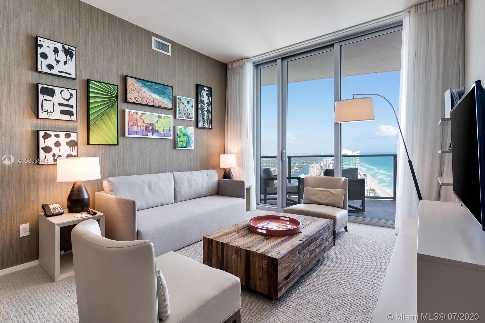 BEST PRICED PENTHOUSE AT PRESTIGIOUS HYDE RESORT & RESIDENCES!! Located on the sand on Hollywood Beach, this 2017, exquisitely furnished, 2 bedroom, 2 in-suite bathrooms unit is the perfect vacation getaway. Enjoy unobstructed ocean and intracoastal views from every room. Floor to ceiling sliding impact glass doors to private furnished terraces, fully equipped modern style kitchen with SS Bosch and Subzero appliances, and granite countertops. Luxurious amenities include: 2 infinity pools, jacuzzi, cabanas, beach and pool services, fitness center, spa, restaurants, bar, coffee shop, room service, concierge. Excellent opportunity for investors: unit in condo hotel program. Easy to show