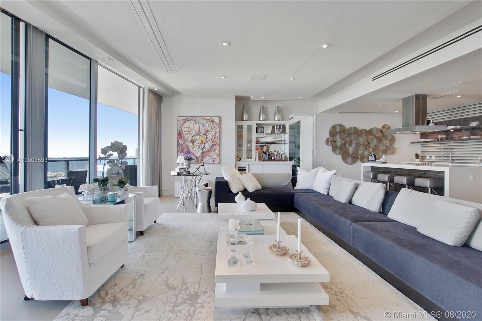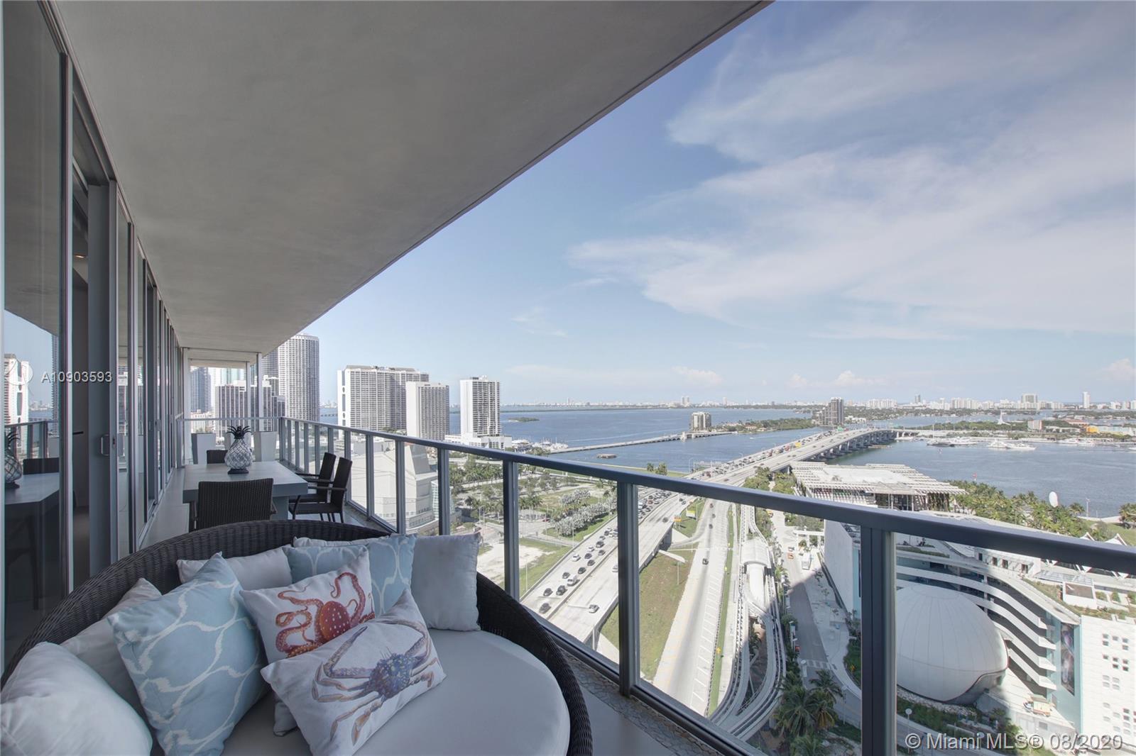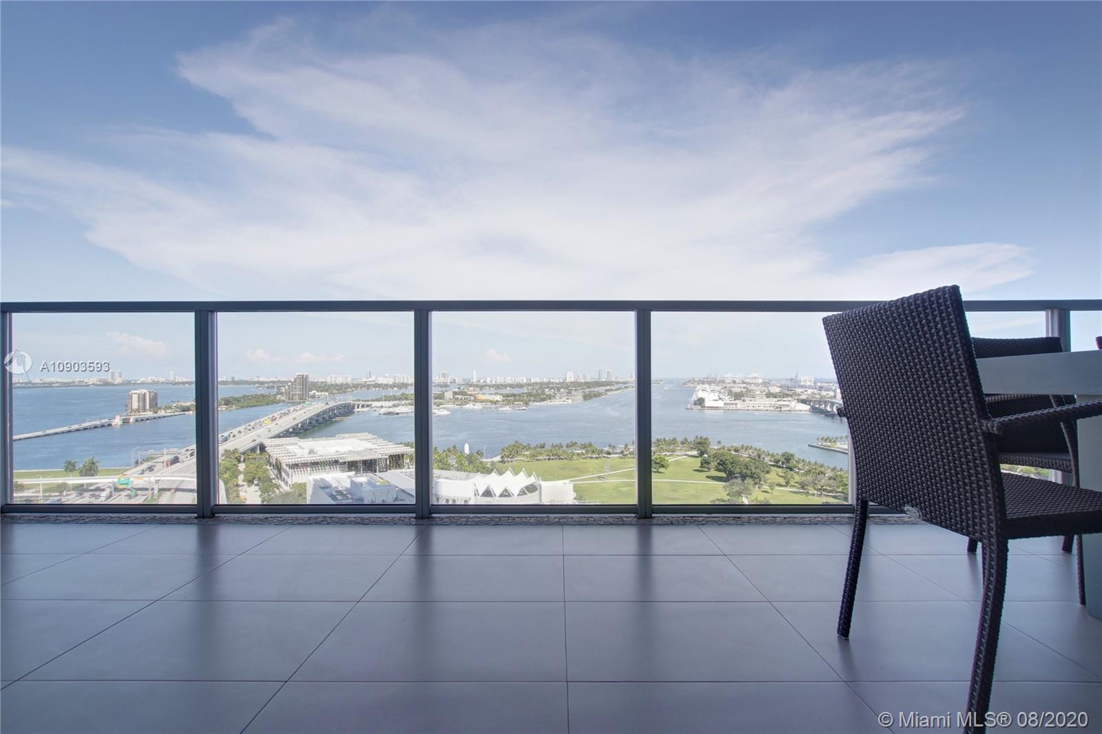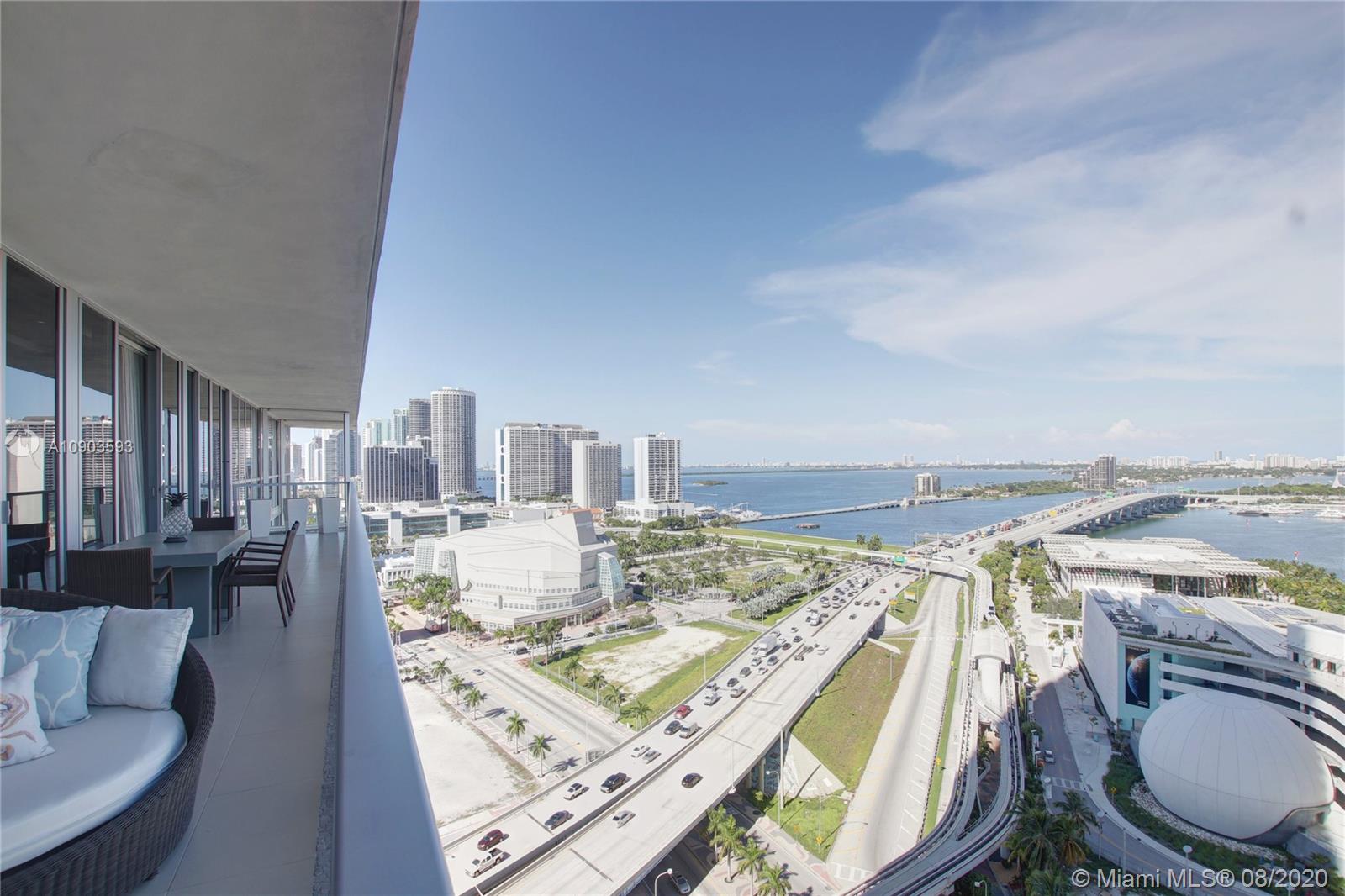 The only one of its kind in the fabulous Marquis Residence.Transitional elegance is personified in this unique Residence.Open floor plan,unobstructed 180' views of bay & ocean.10' ceilings throughout.Three bedrooms (2 master suites),impact-resistant glass door & windows;extra-thick,noise reducing partition walls;porcelain tile flooring,Creston Audio,drapes & lighting,security system,Ilnear diffusers,European Style kitchen (Viking appliances) & quartz countertops,custom built in bar,cove ceiling with fiber optic lighting,private elevator,bathroom with over-sized glass-enclosed showers;24/7 doorman, bellman, security, valet & concierge;smart-building technology;signature spa & fitness center,open-air sky pool deck (14th floor) with hot tubs.Many services are available in building.