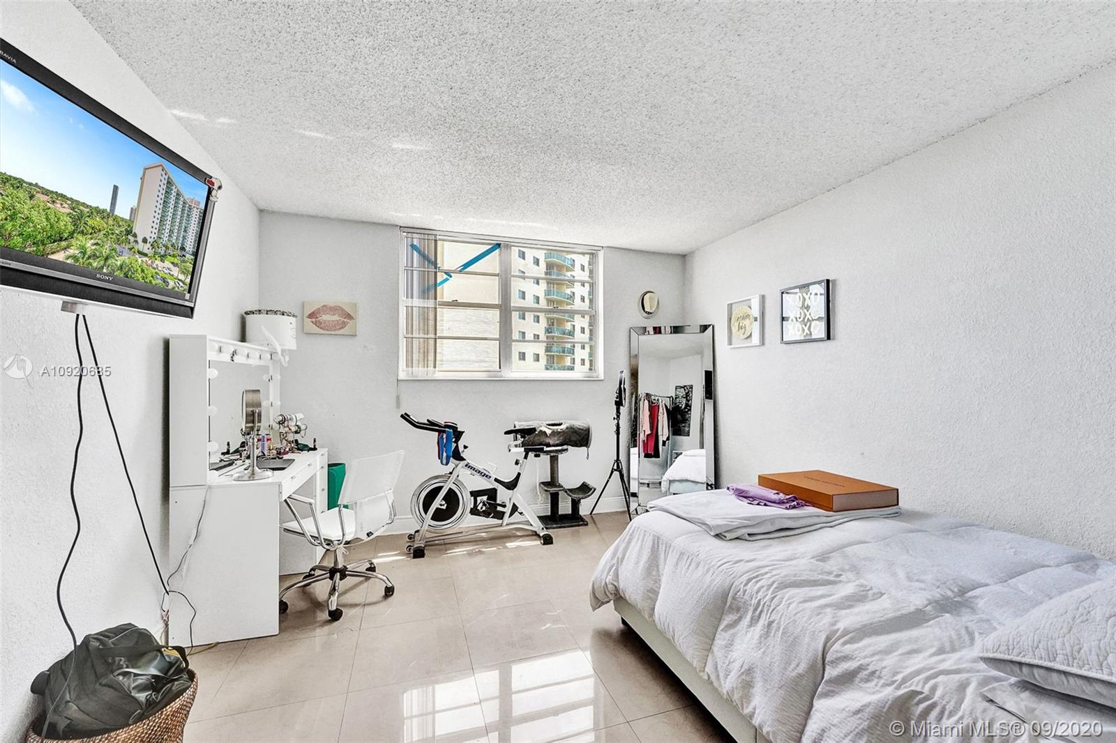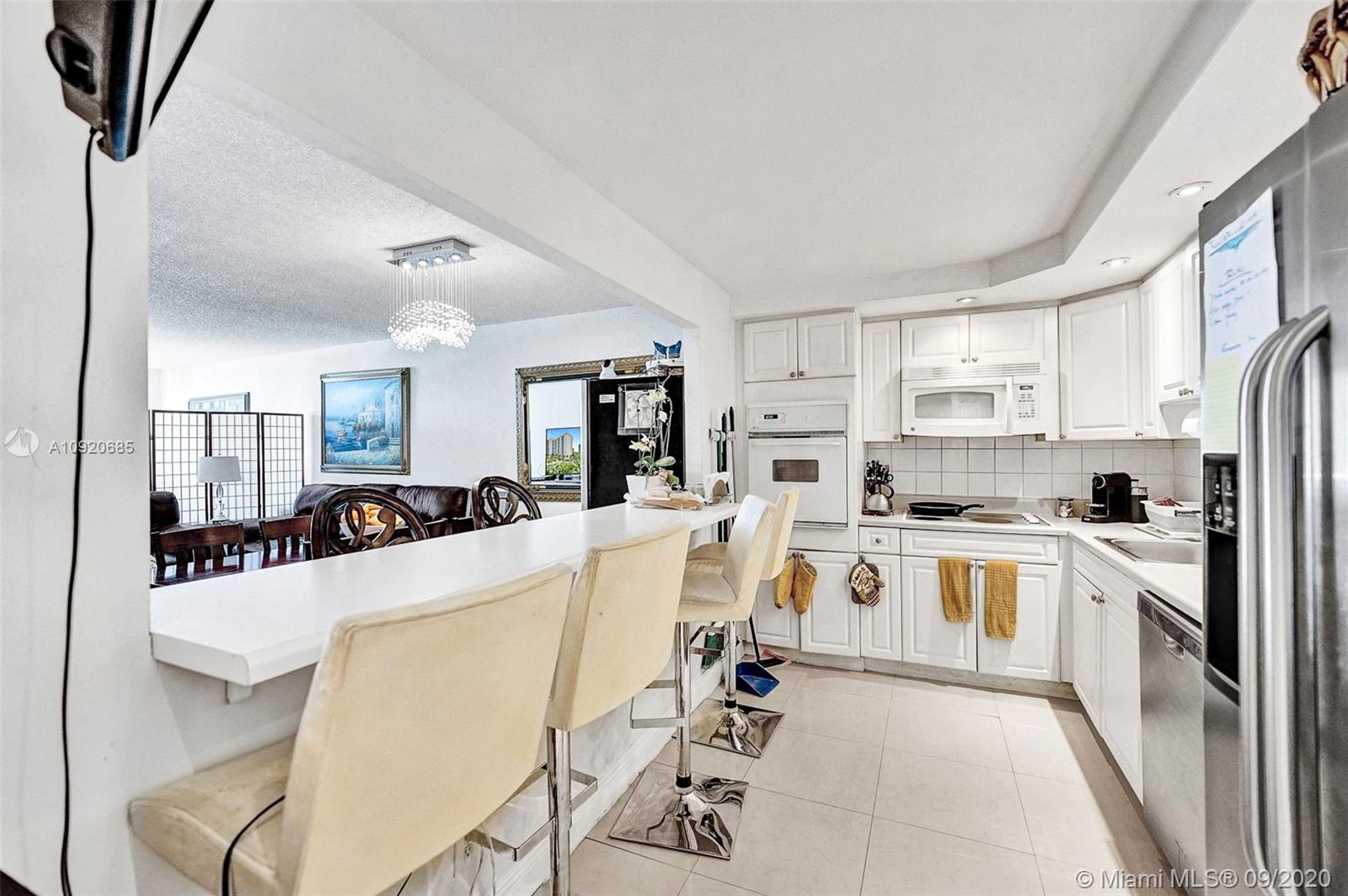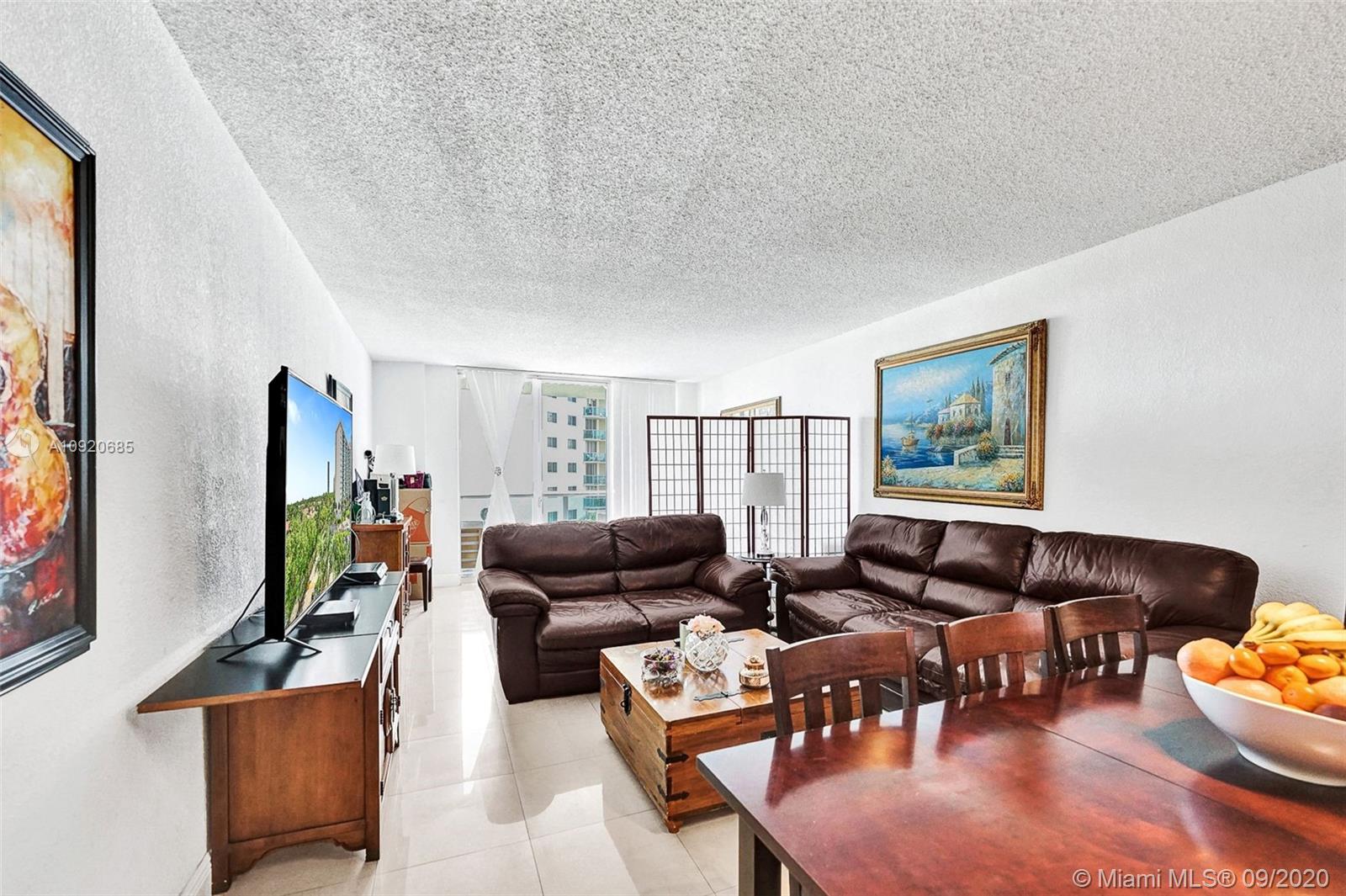 A MUST BUY! Priced to sell! Beautifully renovated unit with tile floors all throughout. Enjoy renovated bathrooms and a large kitchen with an open counter top! Enjoy great views from a very large balcony! A/C, water, Cable TV, Hi speed internet are all covered in the maintenance fee of $872/m. Brand new renovated lobby! Great amenities including barbecue area, mini market, new upgraded gym, heated pool, business center, tennis court, dogie park, concierge, front desk, 24 hr valet & security. Prime location steps away from the beach! Only a few minutes from Rated A+ school, Aventura Mall, restaurants and shops. Hurry this gem will not last! Easy to show.