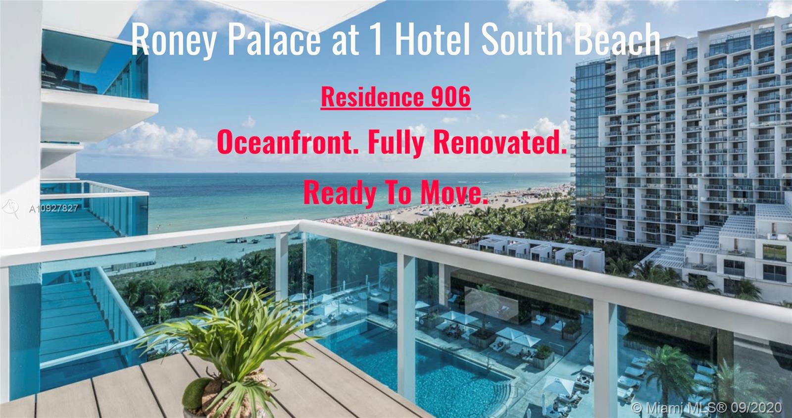 Oceanfront. Fully renovated. Move-in ready. In one of South Beach's most exclusive corners. At South Beach’s most coveted resort and address. This luxury 2-bedroom residence at the Roney Palace at 1 Hotel South Beach is a true gem. Come and see for yourself. Furniture by Artefacto and Italian designers. With south exposure, it offers the best and most desired views at the Roney-1 Hotel complex. Enjoy 600 ft of beachfront and the fantastic amenities of the 1 Hotel South Beach. The renovation of the Roney Palace is progressing and prices are on the rise in the building. This is the lowest priced 2-bedroom with oceanview in the building and is truly the best in the market. The building allows short-term rentals, a rare thing in Miami Beach. Rents are high and income is amazing.