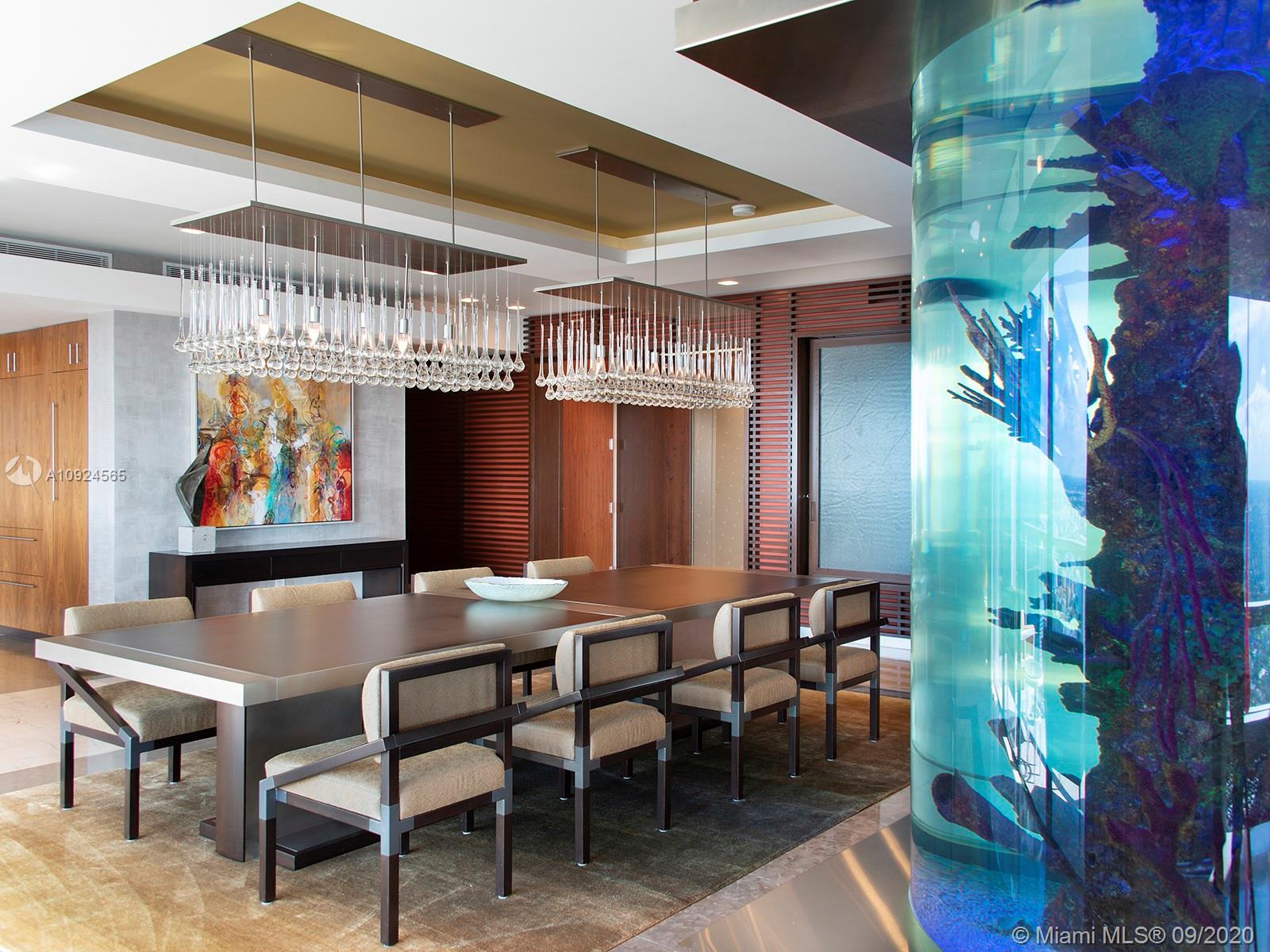Rising 68 stories above the Miami skyline, this extraordinary PH offers sweeping unobstructed views of the bay, ocean, city, & more! Located inside The Four Seasons, one of the city’s tallest & most exclusive luxury condos, you’ll experience living in the heart of downtown’s refined Brickell neighborhood. Stunningly transformed from 4 units into 1; this PH totals 7,438 SF, 3 spacious bedrooms w/ walk-in closets, en-suite baths, & 2 powder rooms. High-end finishes include rich, warm cabinetry, floor-to-ceiling windows, marble & wood flooring throughout. Enjoy formal living & dining area w/ modern chandelier, an elegant chef’s kitchen w/ slab stone marble countertop, a display wine cellar, an aquarium, conference room, theatre & media rooms. Incl. 4 parking spots, valet available for guests.