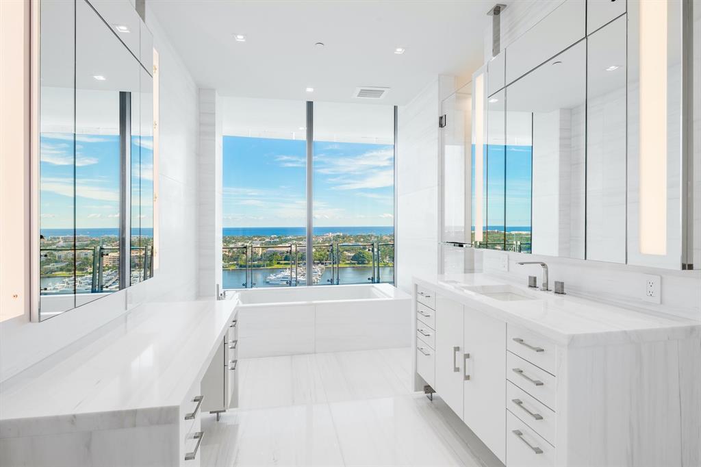 THE ONLY AVAILABLE LISTING WITH A PRIVATE, ENCLOSED GARAGE. One-of-a-kind, high-floor 4 bedroom, 5.5 bathroom home at The Bristol. Residence 1802 has been customized to create a truly spectacular owners suite with an expansive dressing room, separate owners-bathrooms with Fantini fixtures and panoramic intra-coastal, Palm Beach Island and Ocean Views. Spanning over 6,100 total square feet, residence 1802 features wide-plank oak flooring throughout, a chef's kitchen with a full suite of Gaggenau appliances, a gas range, marble countertops, and expansive outdoor living spaces. Amenities include a waterfront fitness center, his & her spas, a private beauty salon, a business center, a commercial laundry facility and a full building generator