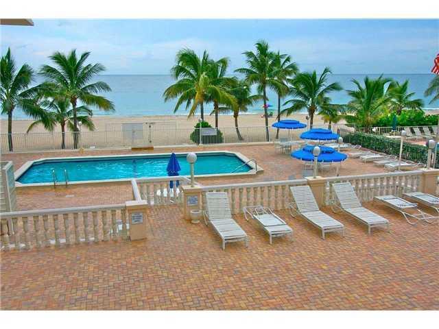 Come live in an oceanfront condo set right on the beach in Pompano. This unit has been updated thru out. The kitchen has cherry cabinets, stainless appliances & granite countertops. The sunny south facing balcony is accessible from the kitchen & the dinin g room. Travertine tile runs thru out, except for the 2 carpeted bedrooms.Unit comes with an extra storage room & sought after 1st level underground parking.Beachfront pool deck, bbq, clubroom, with kitchen, gym, sauna, billiards, 24/7 security. Location!