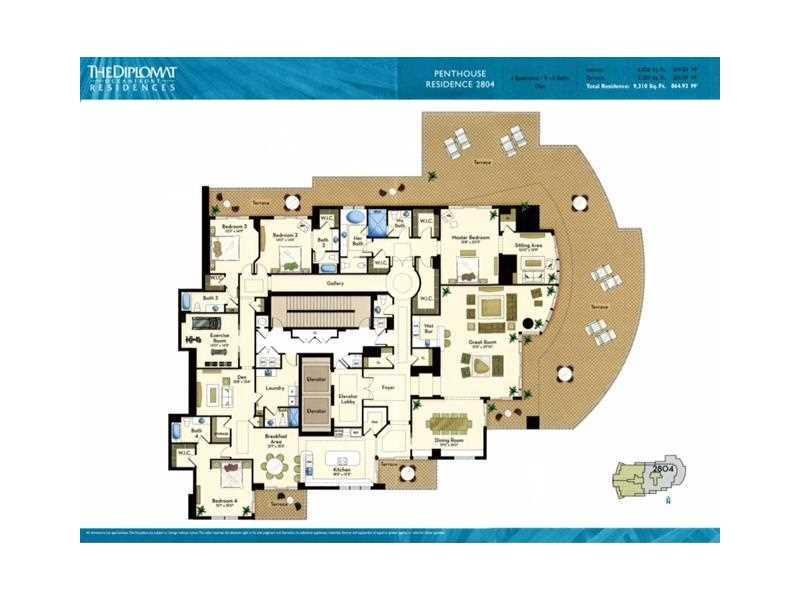 White Palace in the sky with breathtaking panoramic ocean views from over 3000 SF of deep wrap around terraces. Perfect for world class entertaining & watching magnificent sunrises & sunsets. The interior living space in excess of 6000 SF is a true canvas for an interior designer to create a master piece of art. Presently there are 4 large bedrooms and 5 1/2 bathrooms with numerous other areas to create huge closets, a home theater, office and exercise room. Chef's kitchen has top of the line appliances.