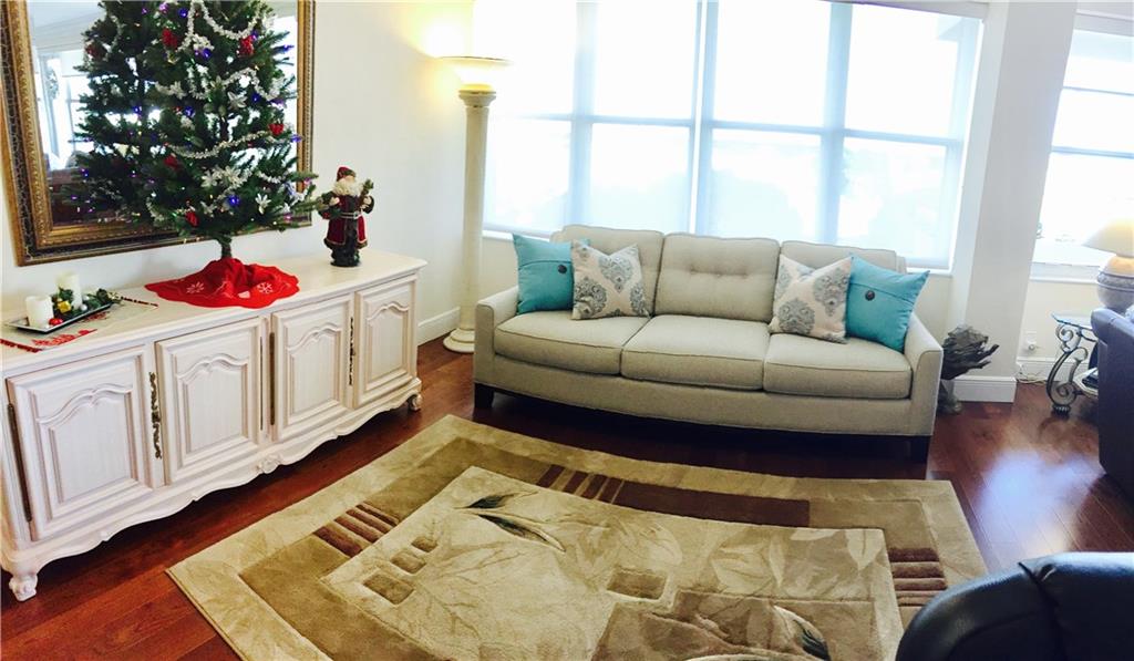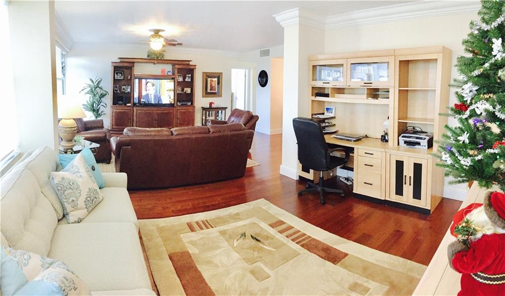 Open the door to a bright and completely remodeled open space. Designer kitchen, bathrooms, wood floors, central AC and impact windows. 3rd bedroom was opened up, making a very generous great room with many light filled windows. Amenities include pool, work out area, gym, library, meeting room, bingo and a community center where you can throw your own parties on the intracoastal! Socially active building, Close to the beach, many shops, and restaurants. Virtual tour/ Drone flight orientation.