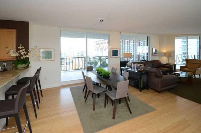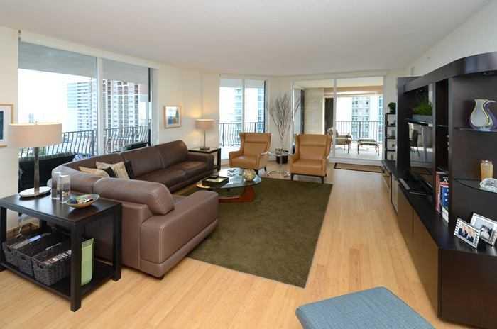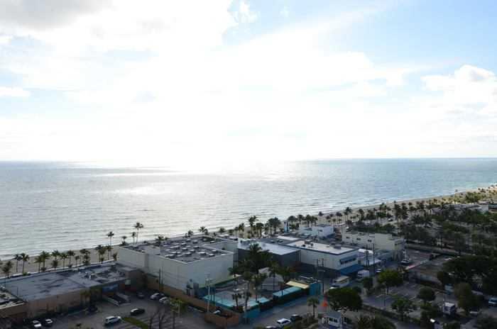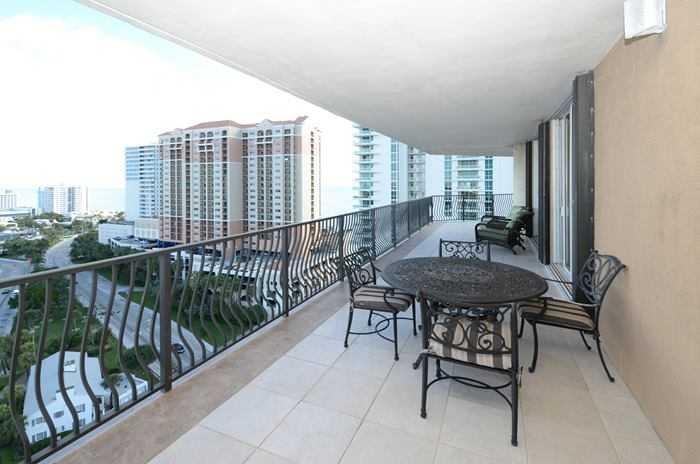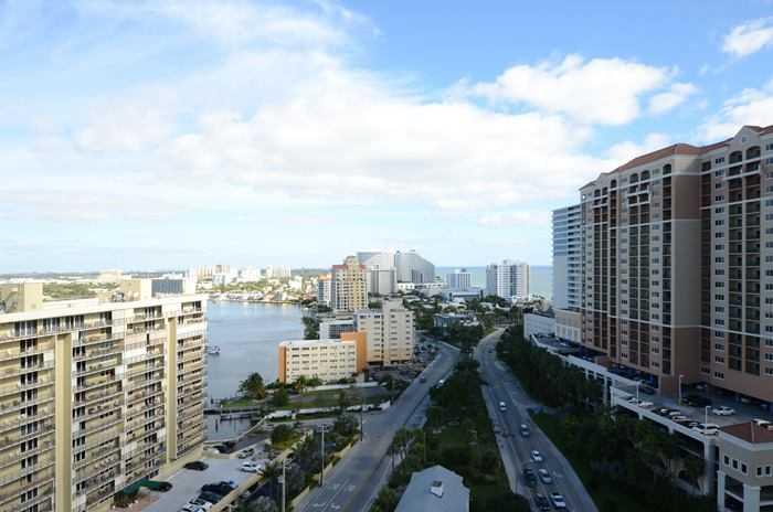 Enjoy the "wow" factor! Chic & sophisticated NE corner residence offers sweeping views from ocean to Intracoastal. Direct elevator service from lobby/garage into the unit which features beautiful bamboo floors, crisp decor & 2 gracious bedrooms plus a den , which could be used as 3rd bedroom. Enjoy twinkling lights and sunsets from huge 1,125 sq ft wraparound balcony, perfect for entertaining. The building offers world class amenities, 2 parking spaces, just blocks from the ocean & Las Olas. Pets welcome!