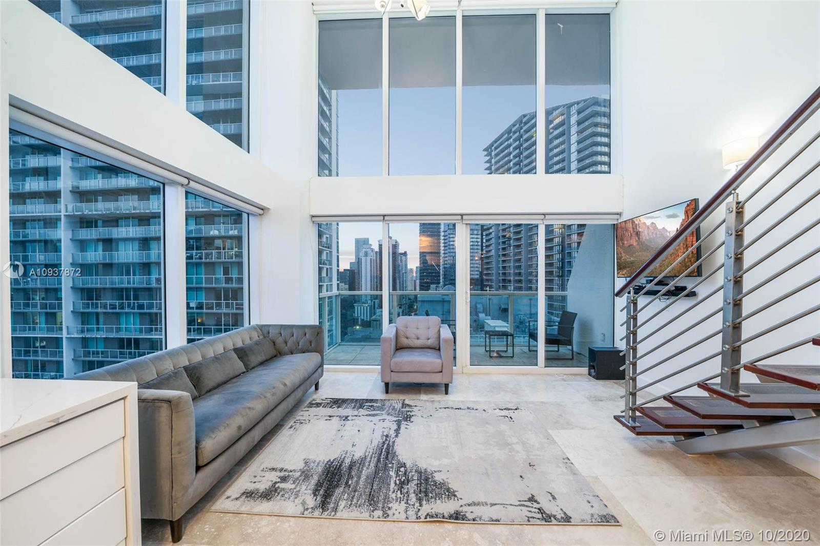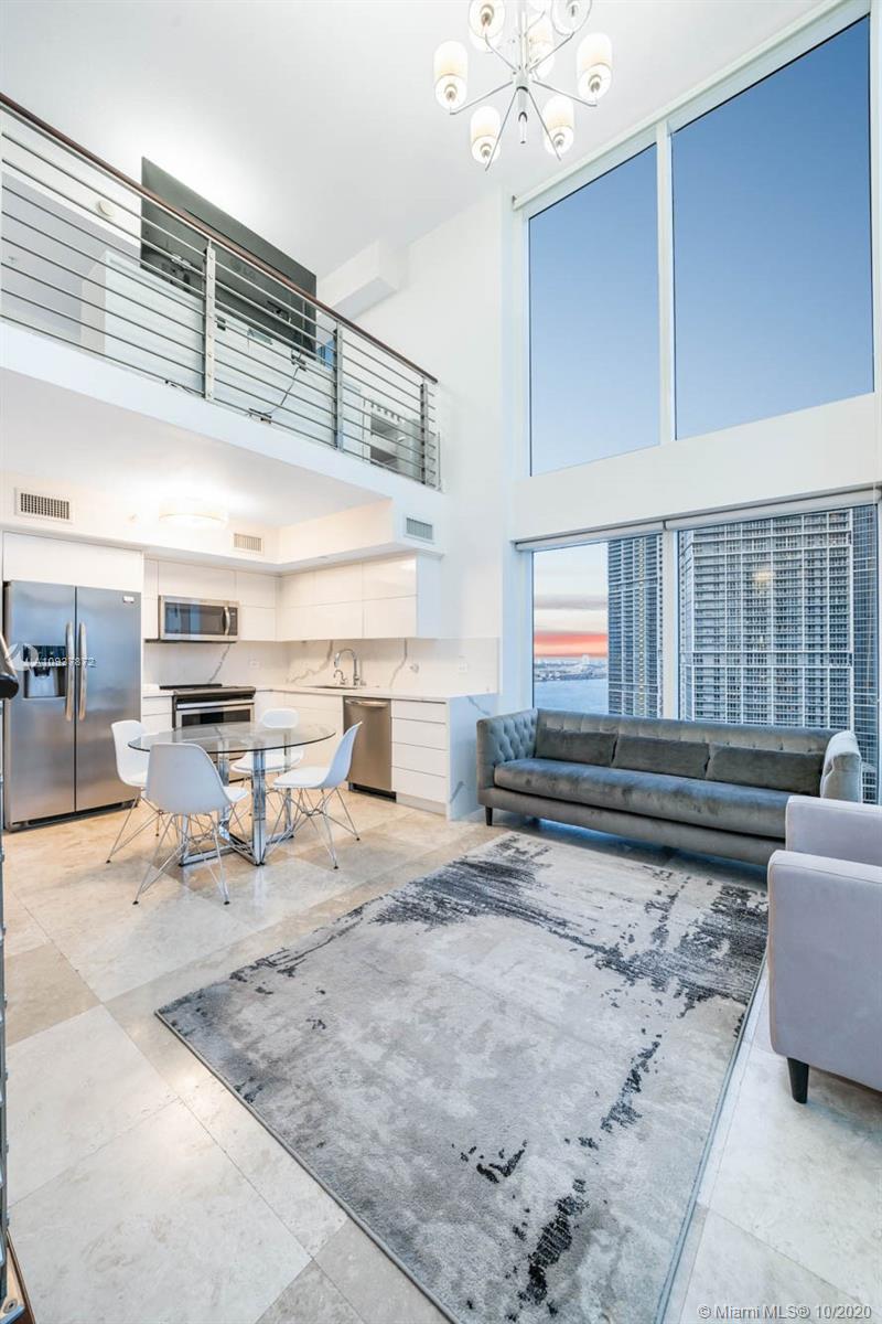 Live Limitlessly in a soaring 2/2 loft in Brickell on the River. This contemporary corner unit stands out from the rest because of the thoughtful upgrades the sellers made. A fully-renovated, all-white kitchen features a marble waterfall countertop & backsplash and plenty of sleek cabinets. Take the floating staircase up to the master suite to find the renovated master bathroom & custom built walk-in closet. Plus, the sellers built out the 2 downstairs closets and added an extra storage cabinet that blends seamlessly into the foyer. Let's talk about these views - double height ceilings make this unit 34 stories up, and with 2 balconies you'll never miss a second of the sunrise or sunset. Brickell on the River is centrally located, walking distance to Brickell City Centre & Downtown Miami.