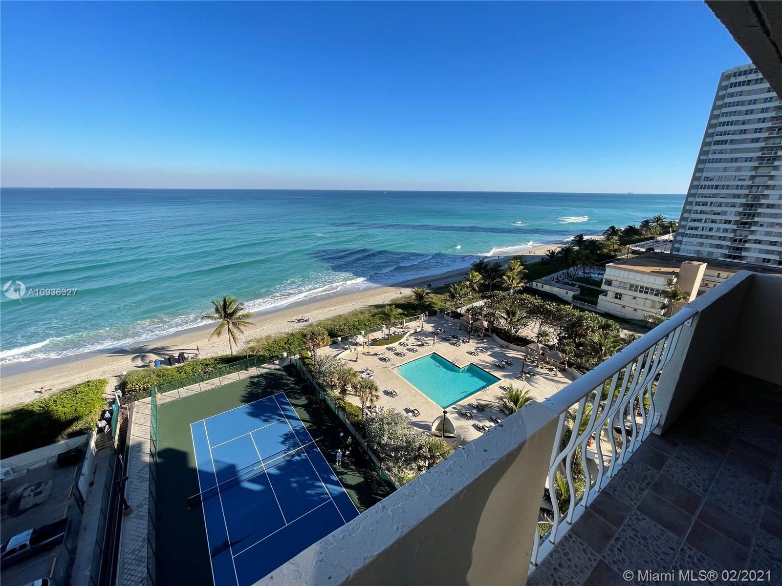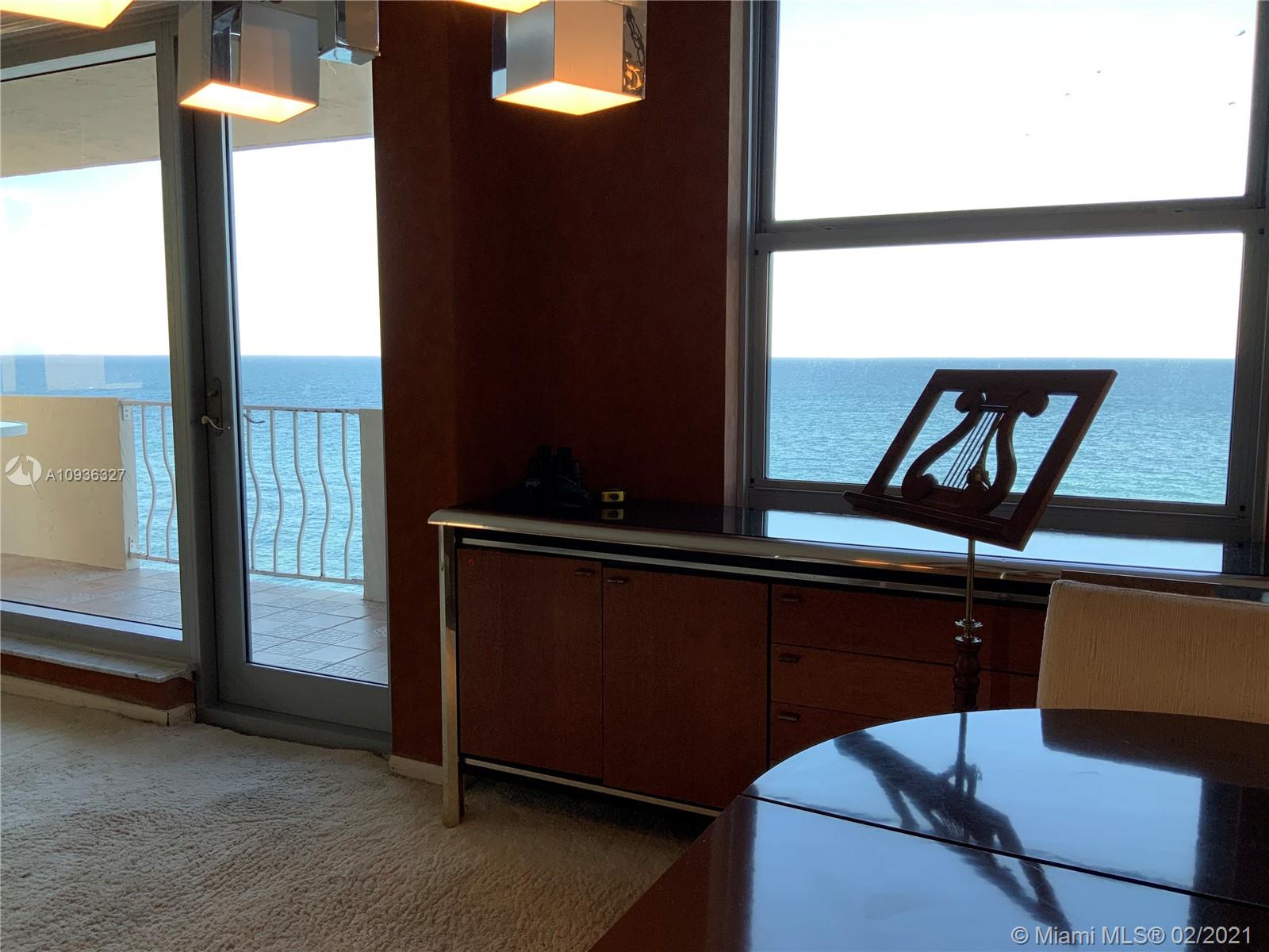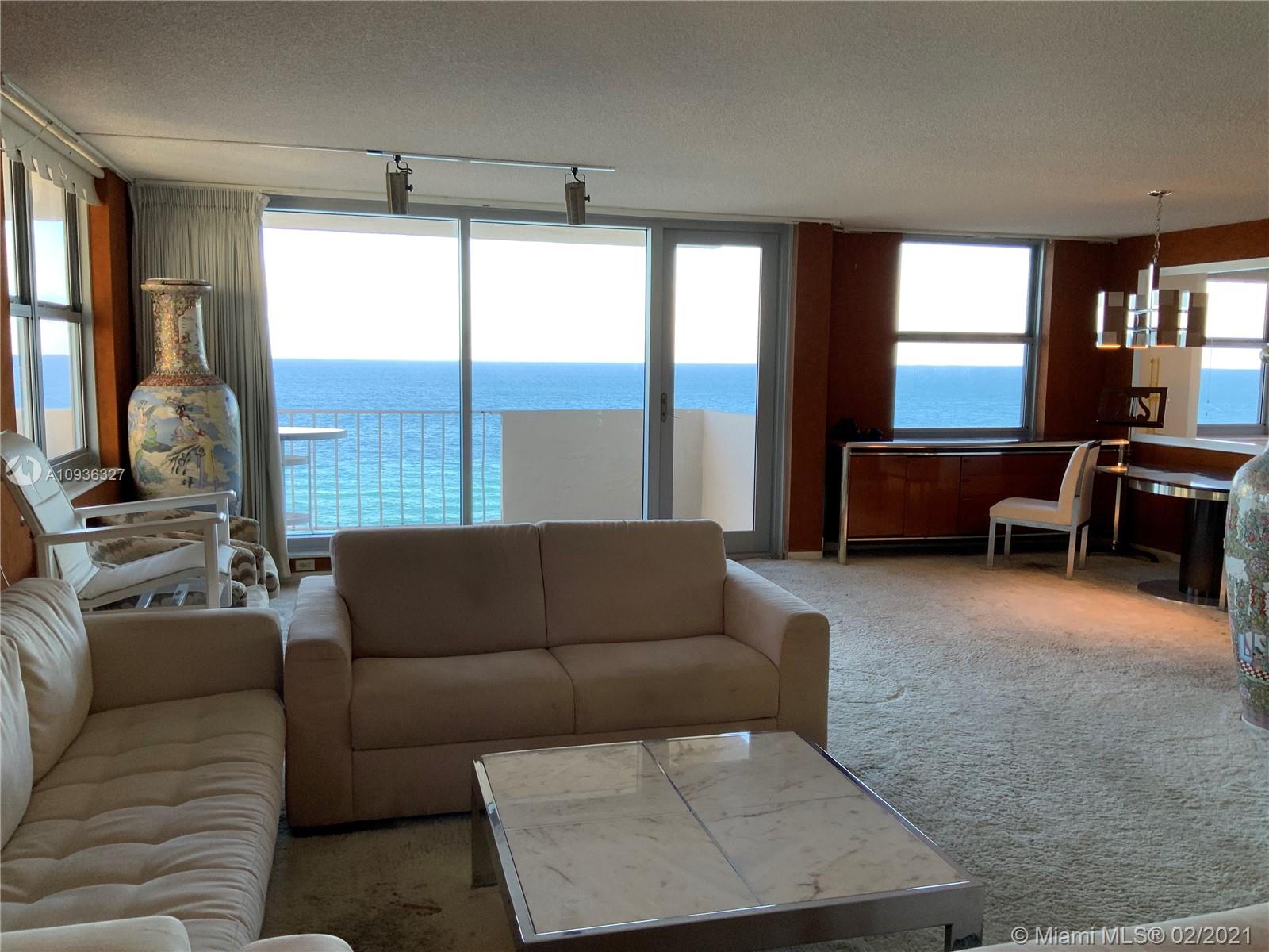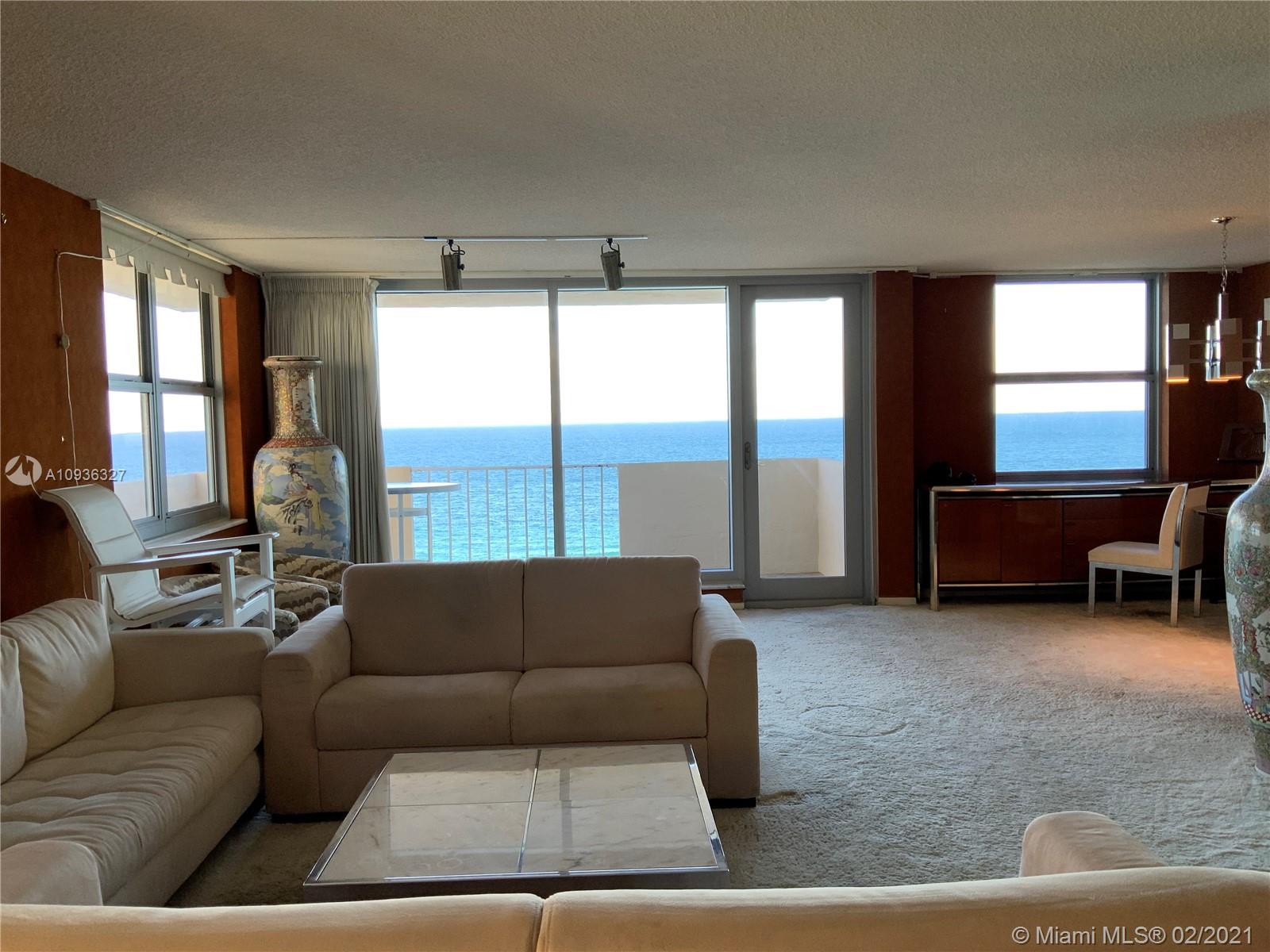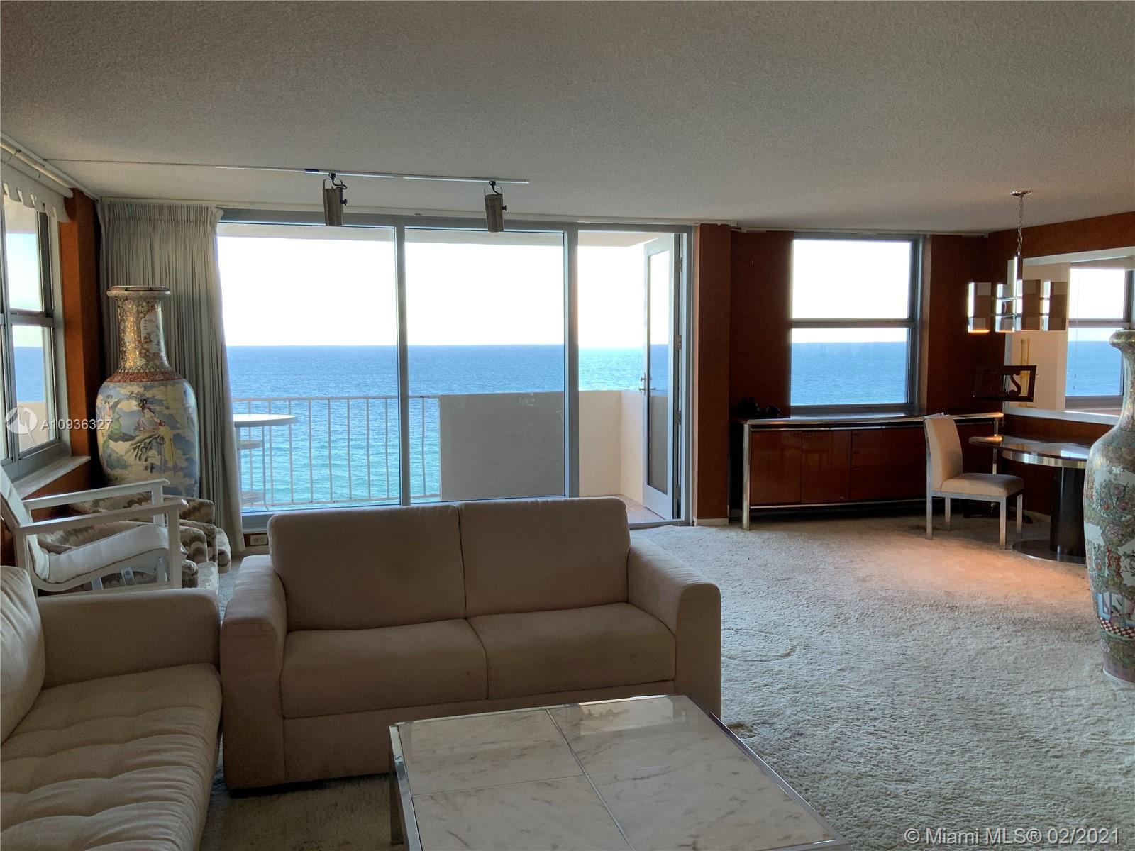 Amazing Direct Ocean views. Large 2 bed room and 2 full bathrooms apartment. North East Corner unit almost 2,000 sq ft. Ocean views from all rooms. Only 4 Apartments per floor. Each bed room has 2 walking closets. Laundry machines inside apartment. Huge corner wrap around balcony. New High Impact Hurricane windows. Amenities include: cable TV and HBO, Beach service, Large Heated swimming pool with Jacuzzi and Cabanas, BBQ Grills, GYM, Tennis court, Party room with kitchen, 24 hours Security, Reception and Complementary Valet Services. Walking distance to stores. Apartment needs complete Remodeling and has lots of potentials for Interior Design. With open kitchen remodeling would have Direct Ocean view. Covered parking. Apartment is vacant and easy to show ask Listing Agent for showing.