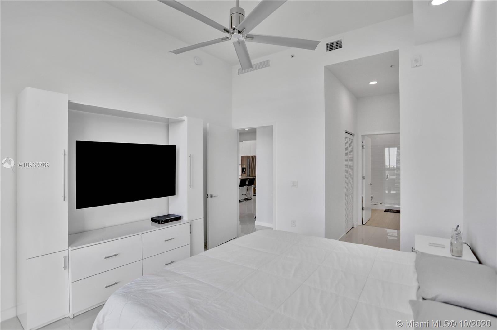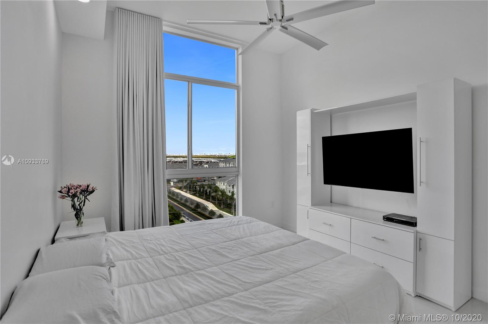 Fully Renovated PENTHOUSE For Sale in Midtown Doral. This 2 Bedrooms/2 Baths unit features High ceilings with porcelain tile floors. Modern designer kitchen with quartz countertops, new Bosch and Samsung stainless steel appliances, and European finishes. Bathrooms remodeled with quartz countertops and fresh tiles. NEW washer and dryer. Soundproof panels. No Expense Spared! Large balcony with private views of the Miami skyline. Two assigned parking spaces. Low HOA! TURN KEY ready.