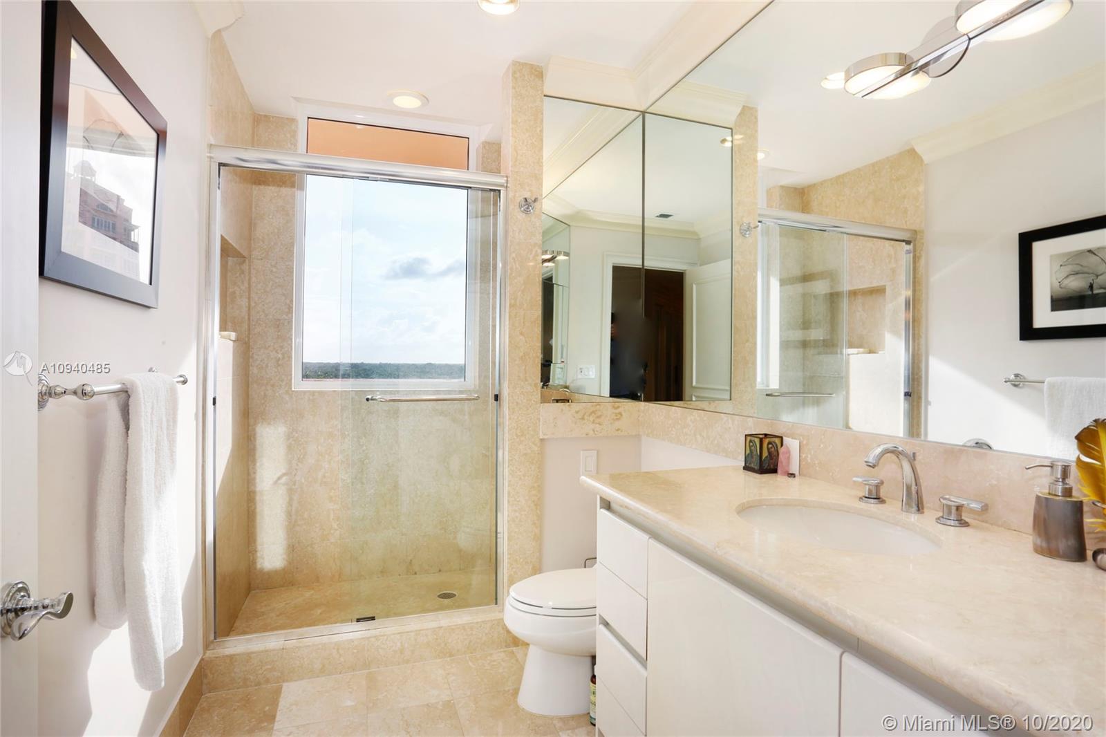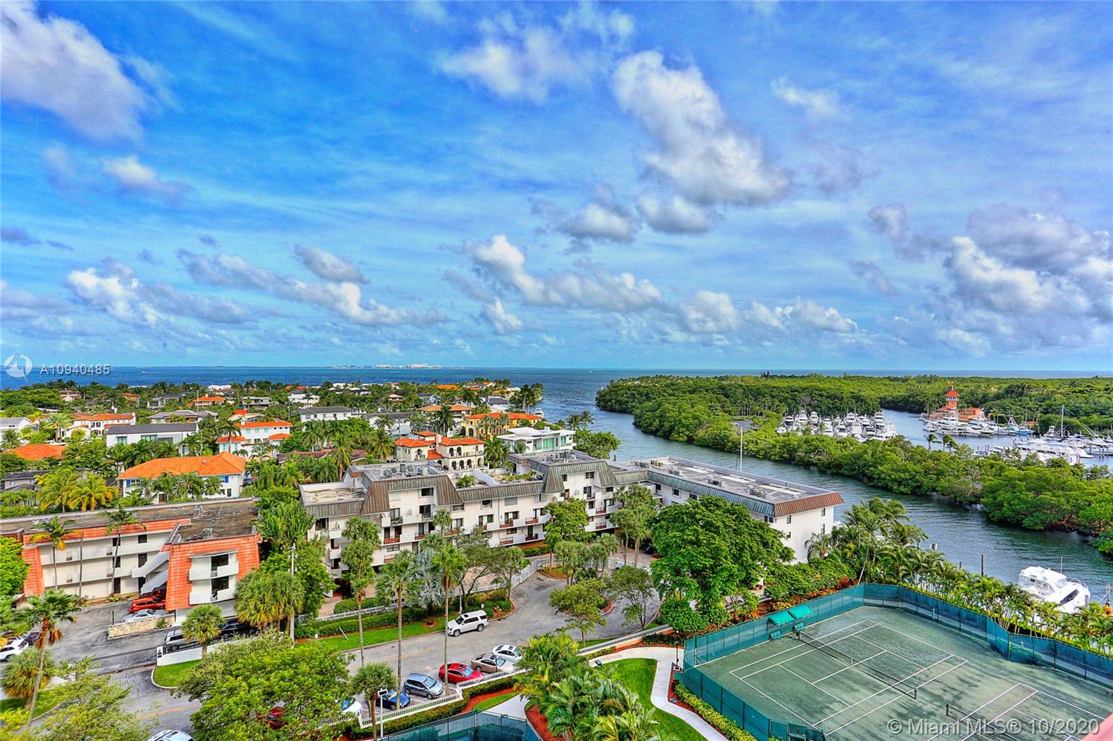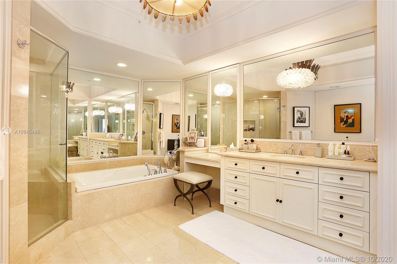 The Gables Club is the epitome of sophisticated condo living & this wonderful 3 BR/4 BA unit is no exception! A private elevator whisks you to the 10th flr foyer entrance that leads to open liv & din areas & deep balcony w/sweeping views of the Bay, Downtown, & Gables Waterway. The clean, white kitchen boasts breakfast area, island, glass-front cabinets, abundant workspace & storage. The master suite is a respite from it all & includes 2 private BAs w/ elegant finishes, dressing area, 2 large walk-in closets, & balcony access. 2 remaining bedrooms also step out to the balcony to enjoy the gorgeous views! Laundry rm, 2 assigned parking spaces, sailboat slip, impact windows & doors, & amenities like tennis cts, exercise rm, putting green, heated pool, valet, guard gate, & more!