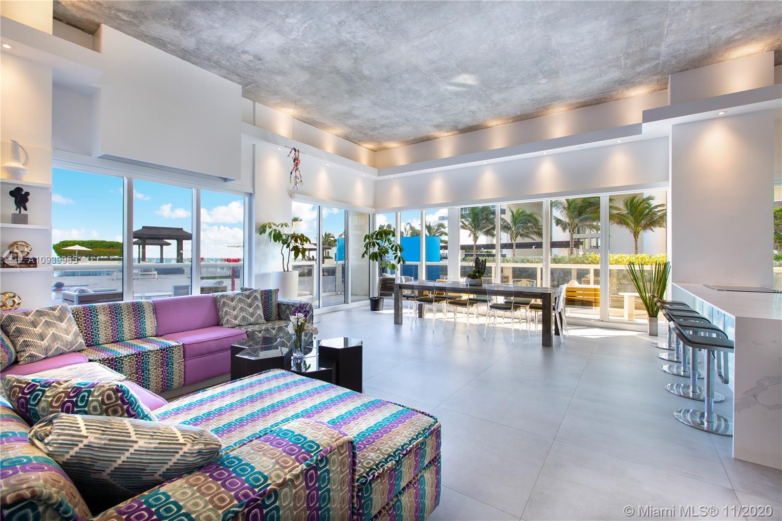 Spectacular direct oceanfront designer LOFT. Completely remodeled from top to bottom with soaring 14 foot exposed concrete ceilings, large format stone floors, custom kitchen with Sub Zero refrigerator. Luxurious master bath with floating tub and shower with rain shower head. Built-ins and automated shades throughout including all three bedrooms. Large wraparound patio. Simply step outside and choose from four oceanfront pools or take a dip in the ocean. The Beach Club offers amenities galore including two level gym/spa, 7 pool and 6 Jacuzzis, 24 hour security and valet. Must see!
