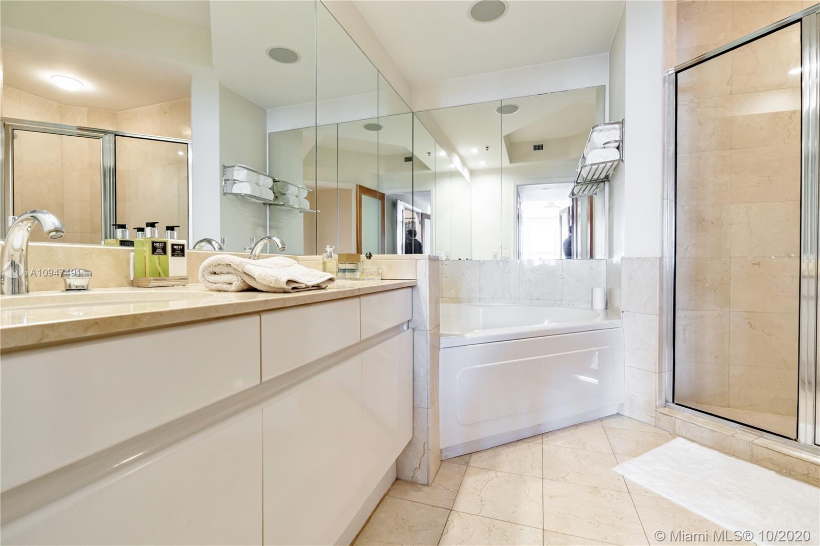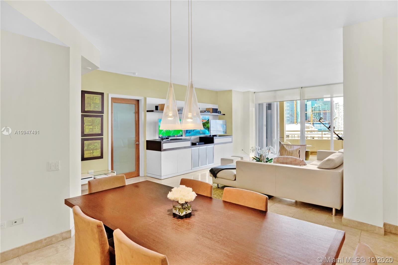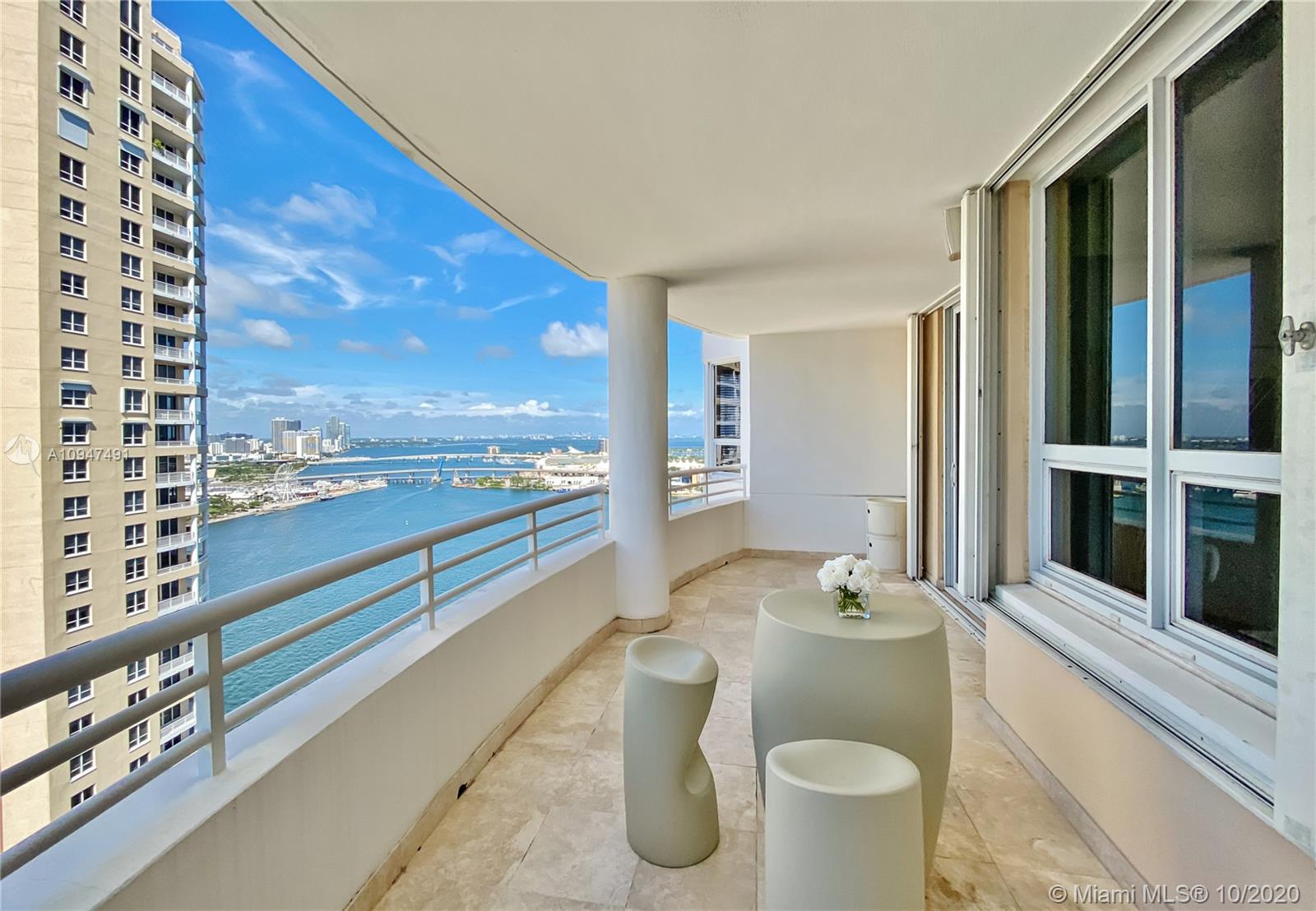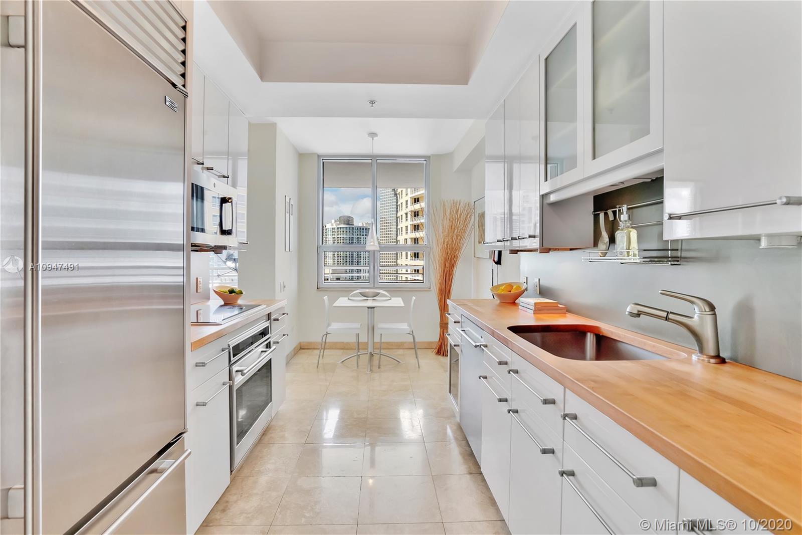 Live in the elegant Two Tequesta Point on Brickell Key - This rare high floor unit has stunning city/bay views from a massive balcony giving you amazing day/night views. The kitchen was remodeled w/ clean line cabinets, a chef's sink, under cabinet lighting, Sub-Zero/Wolf/Asko appliances & custom butcher block countertops. This smart home has Nest, a newer AC, Lutron dimmers, & surround sound TV/Audio. Other upgrades are Italian light fixtures, shades throughout (including blackout in bedrooms), & designer walk-in closets & doors. Two Tequesta has a renovated lobby/elevators, tennis, one of the nicest fitness centers in Miami, a bayside resort style pool with hot tubs, a BBQ area, a new Party room, conference rooms, a kids room, free common area wifi, free 24/7 valet, 24/7 security, & more