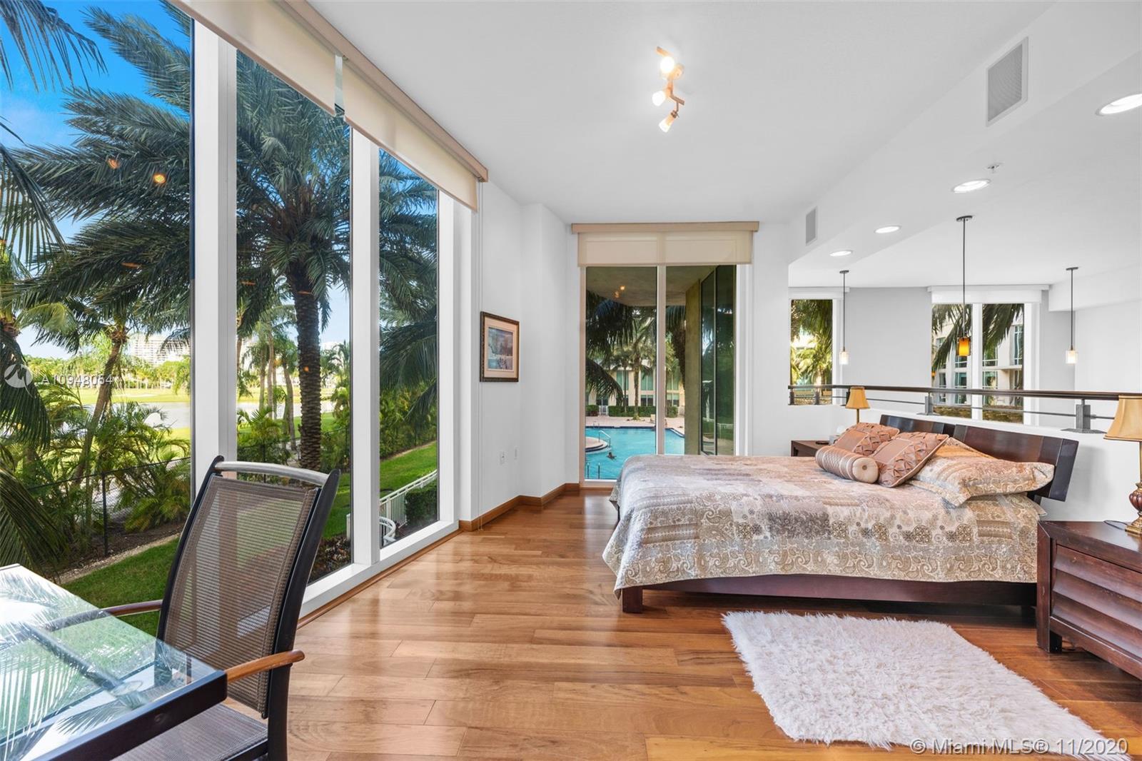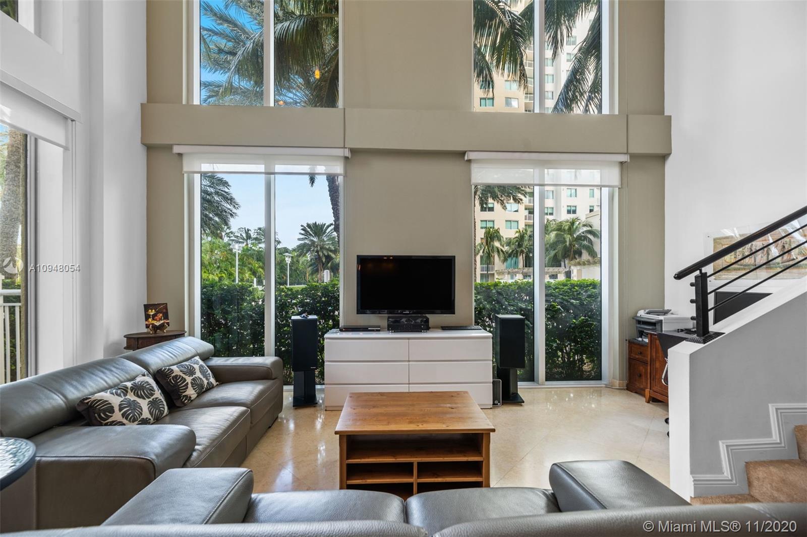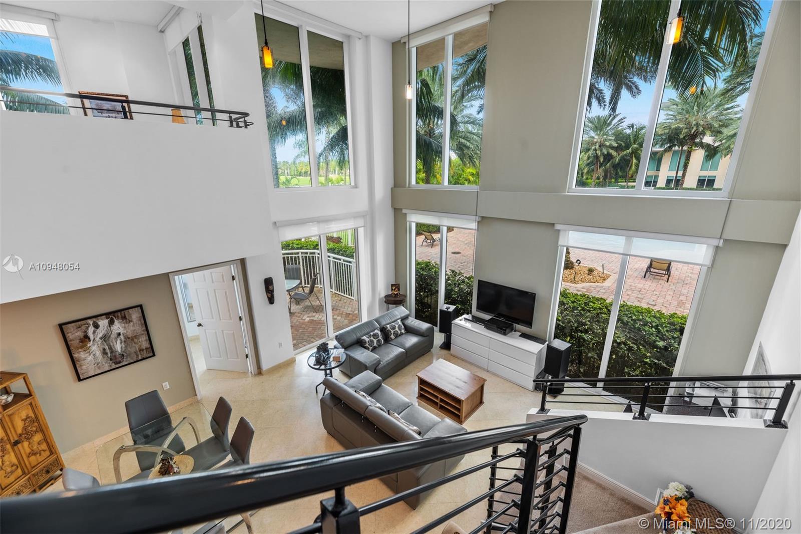 Exceptional, rarely available 2-story corner townhouse with pool, lake, & golf course views. This fully updated 2/2.5 condo has large private outdoor terrace leading to pool. Dramatic 20 ft. vaulted ceilings throughout spacious living area, & floor to ceiling impact windows maximize your views & natural light. Fully equipped modern kitchen is perfect for entertaining with granite countertops, SS appliances and wood cabinetry. Marble and Brazilian hard wood floors. Convenient 2nd floor laundry room & 2 assigned parking spaces plus valet. Amenities include 24 hr. sec., business center, theater, tennis, spa & fitness center, jogging path, heated pool, billiard & party room. Walk to the beach, coffee and shops. Maint. INCLUDES cable/internet, H2O/sewer/trash/appliance contract. Broker remarks.