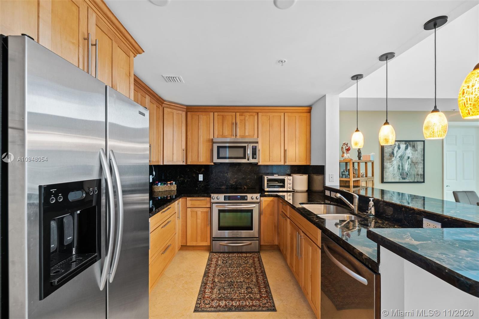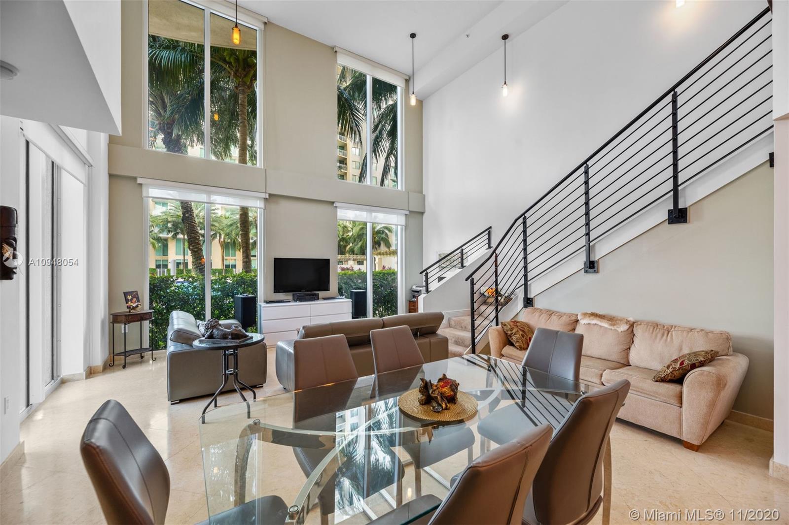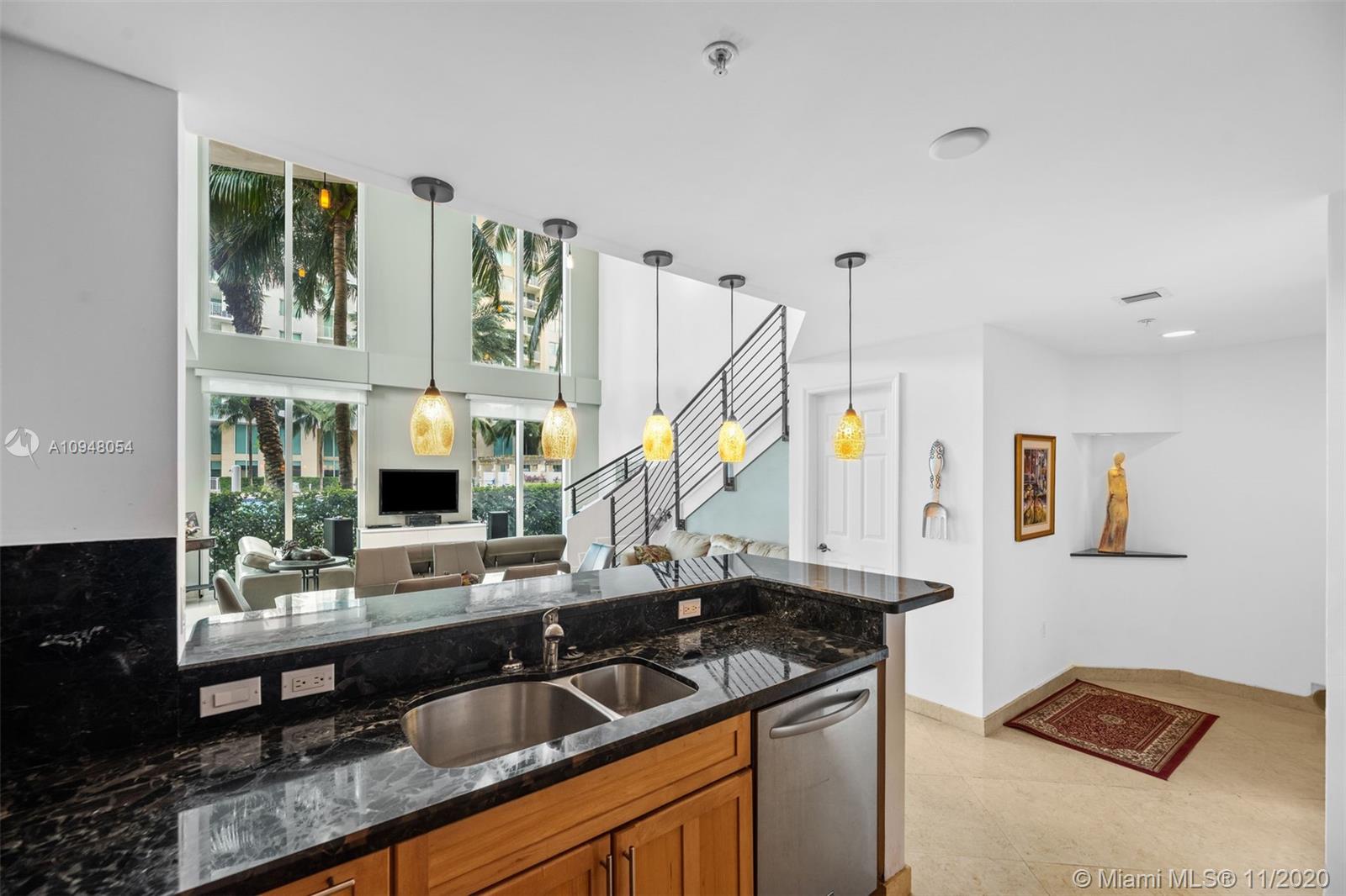 Exceptional, rarely available 2-story corner townhouse with pool, lake, & golf course views. This fully updated 2/2.5 condo has large private outdoor terrace leading to pool. Dramatic 20 ft. vaulted ceilings throughout spacious living area, & floor to ceiling impact windows maximize your views & natural light. Fully equipped modern kitchen is perfect for entertaining with granite countertops, SS appliances and wood cabinetry. Marble and Brazilian hard wood floors. Convenient 2nd floor laundry room & 2 assigned parking spaces plus valet. Amenities include 24 hr. sec., business center, theater, tennis, spa & fitness center, jogging path, heated pool, billiard & party room. Walk to the beach, coffee and shops. Maint. INCLUDES cable/internet, H2O/sewer/trash/appliance contract. Broker remarks.