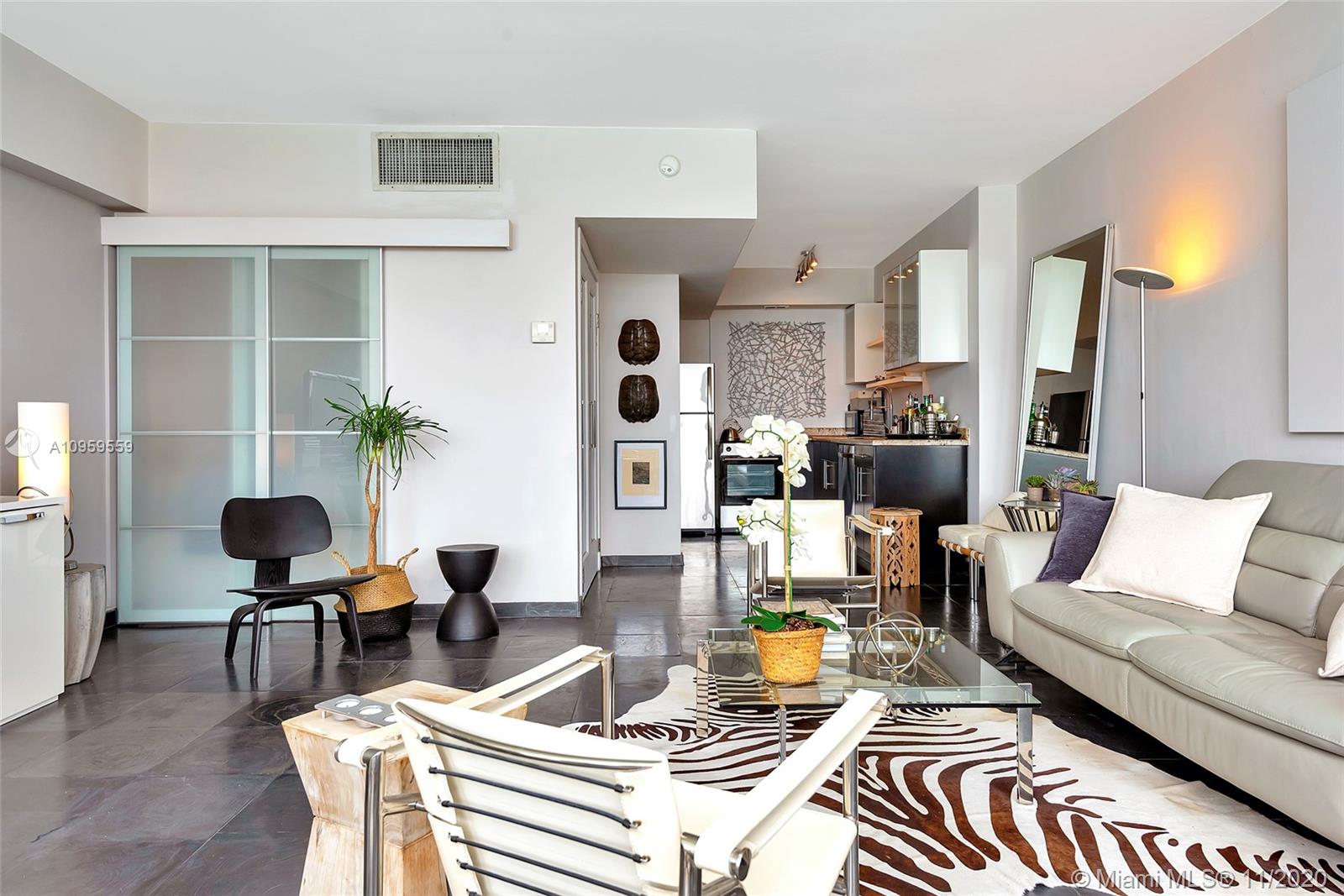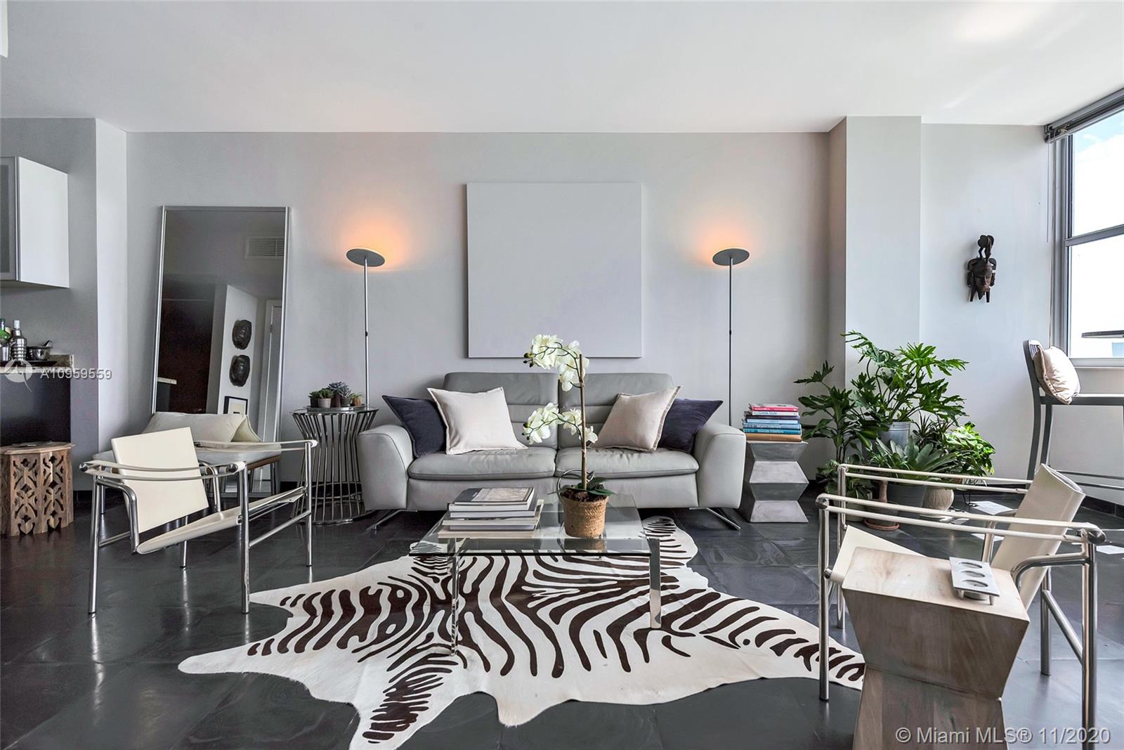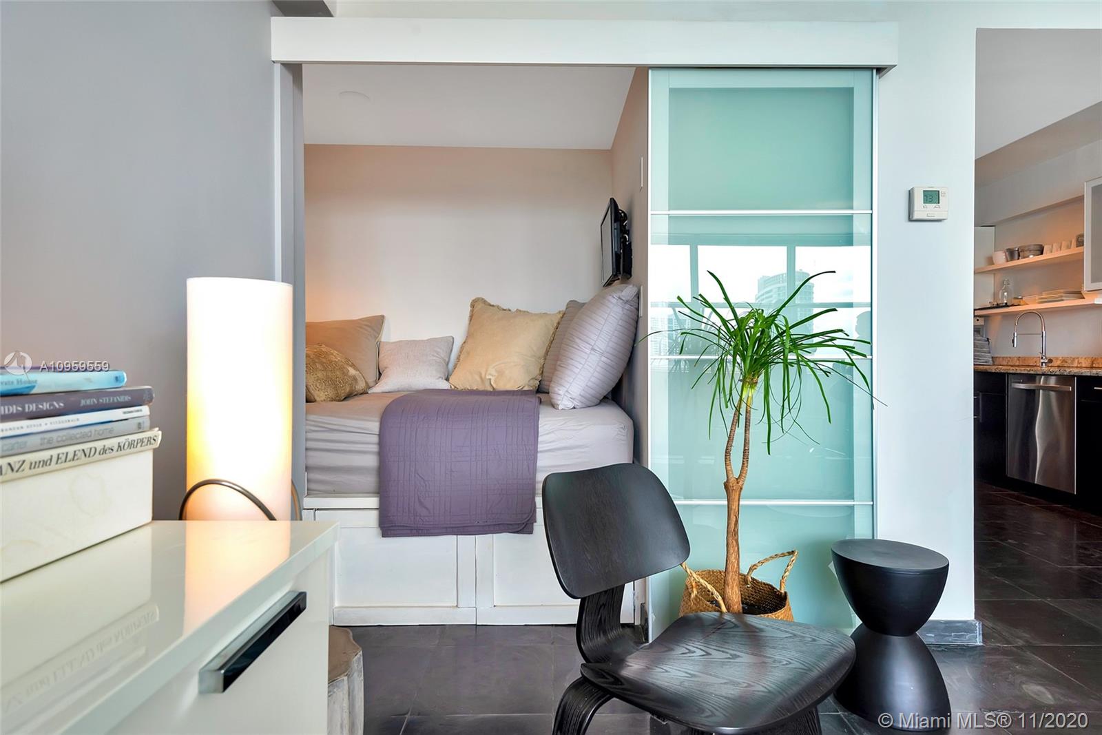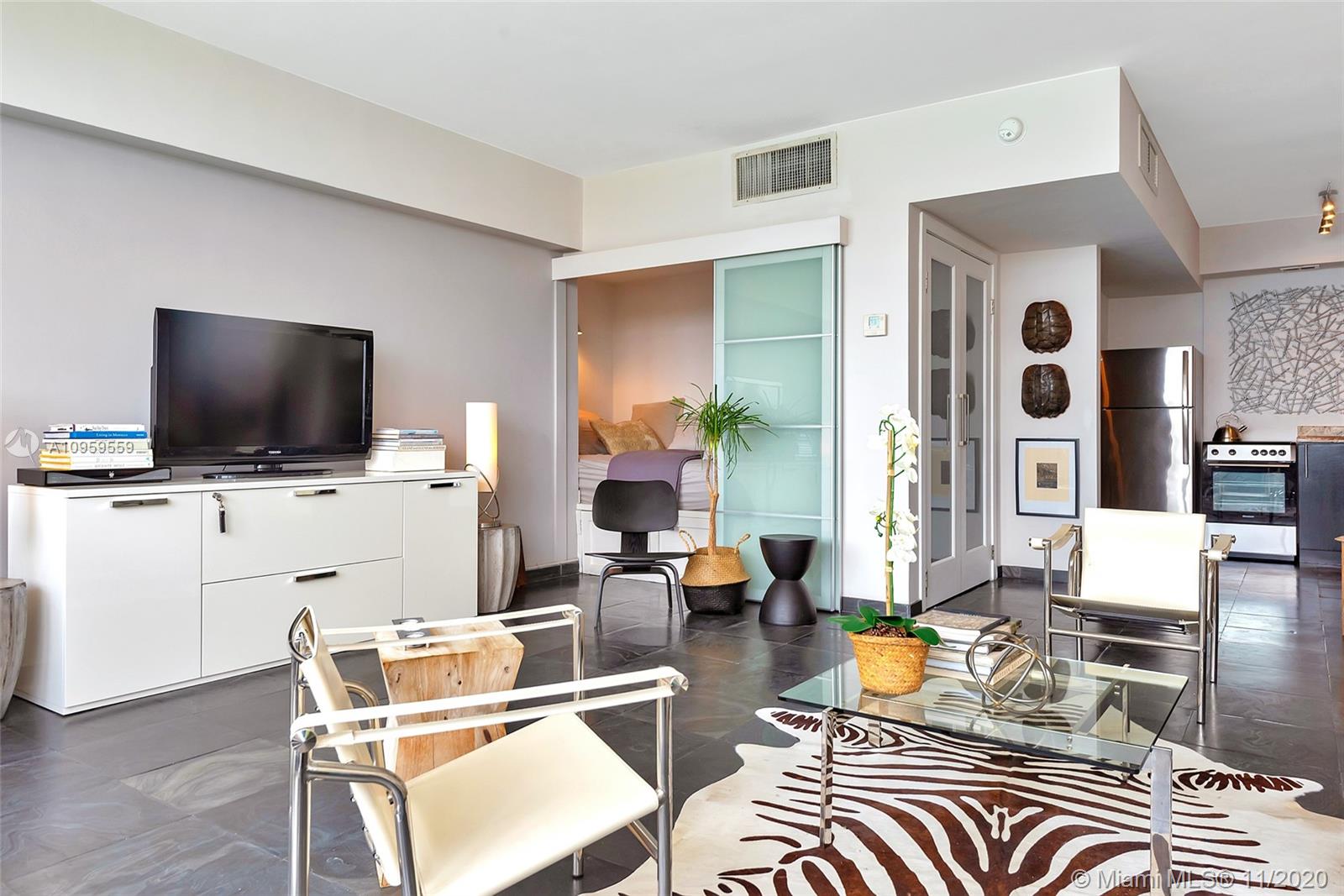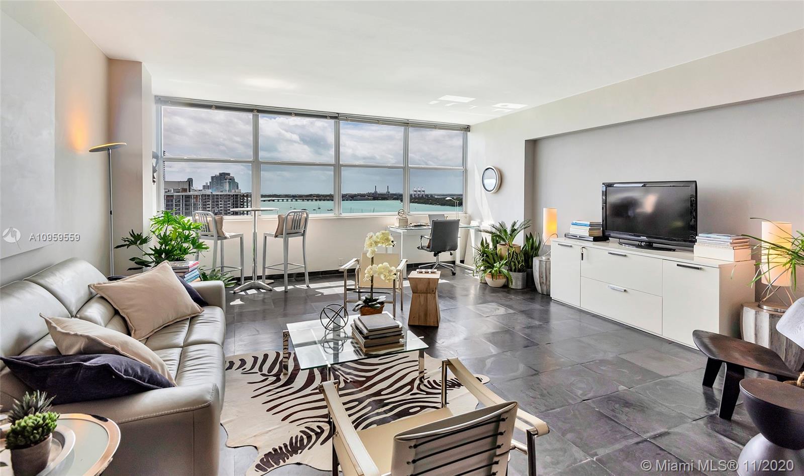 Best studio on Belle Isle! Top floor, wall of windows provide full bay and ocean views from Lincoln Road to Brickell and south to Key Biscayne and Port Miami from this rarely available 12 line. Totally reconfigured to include an entry way and inviting alcove sleeping area complete with flat screen TV, shelves, reading light, with views to sky and South Beach skyline. Concealed from the large living area by frosted sliding glass doors. Open kitchen, great closet space, glass enclosed shower, impact windows. Newly remodeled large gym with bay views, heated pool and jacuzzi, 2 separate foliage enclosed BBQ areas directly on the water. One parking space. Newly refurbished Wimbledon blue tennis court. Full service building, doorman, valet, vast lobby overlooking pool. A must see.