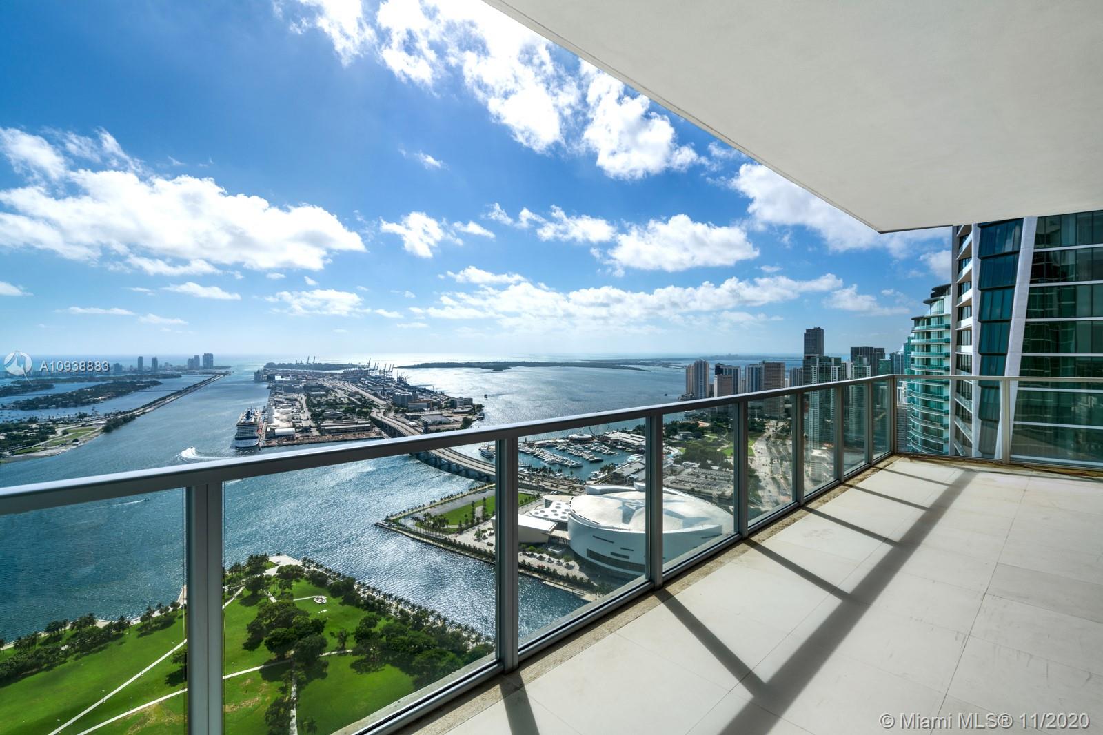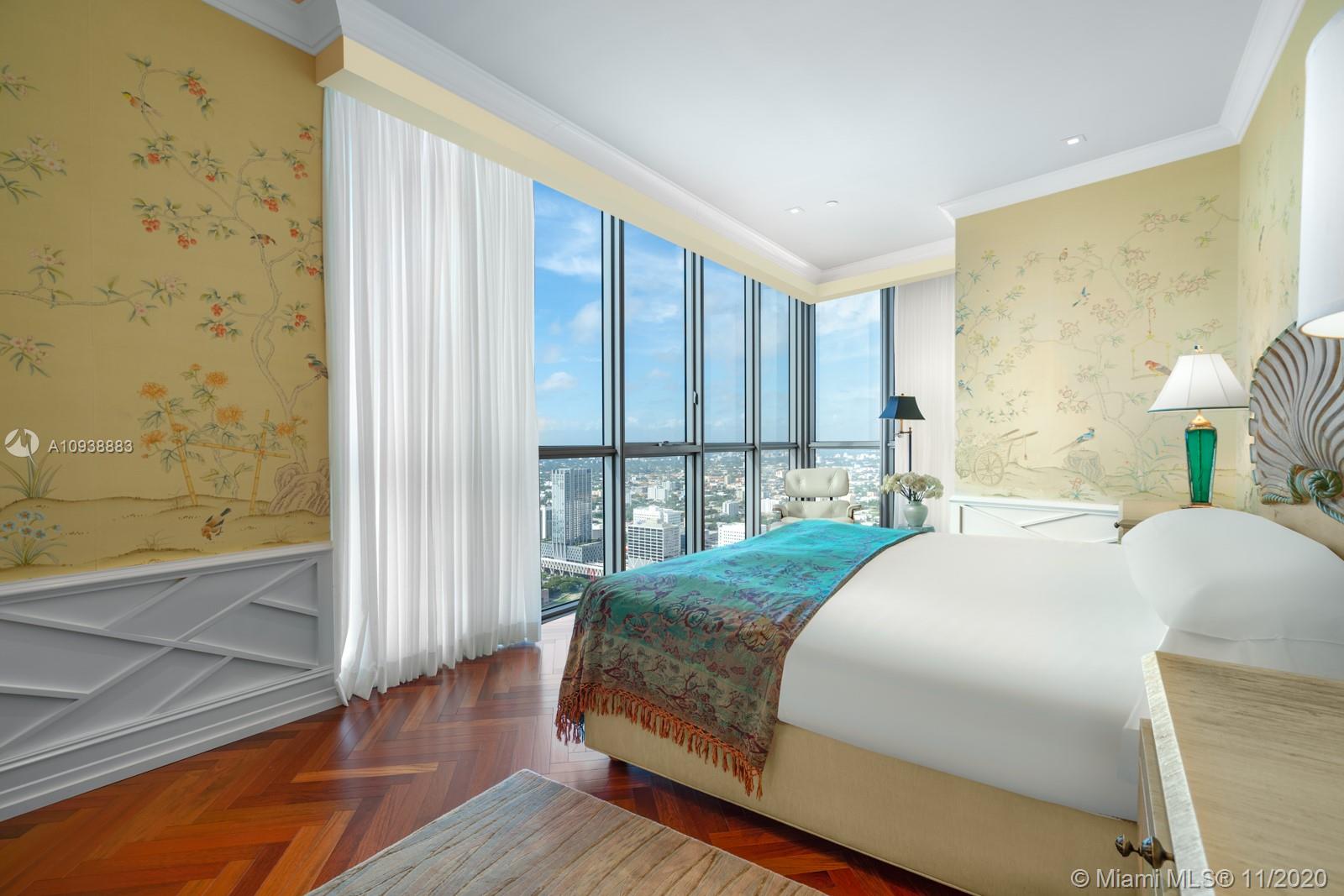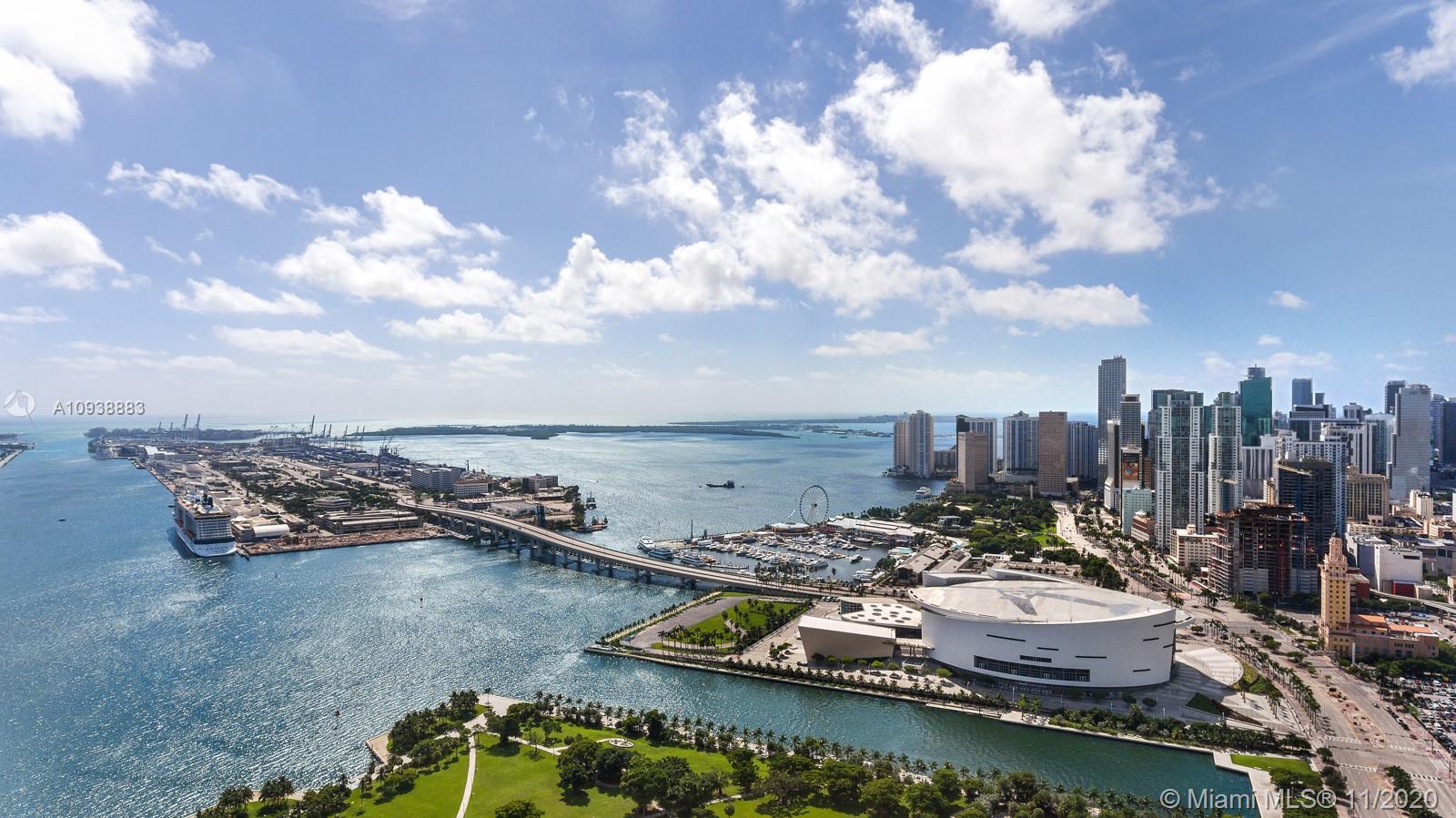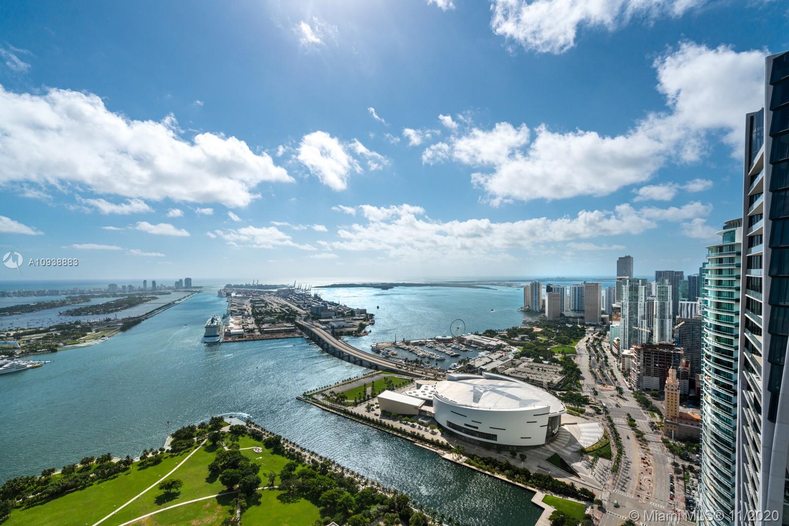 Views, Views and Views from this unique south corner residence at Marquis. Enter the foyer through a private elevator and enjoy expansive views of Biscayne Bay, Miami Beach and the Miami Skyline from its bright and open double wide living room with floor to ceiling glass windows. Professionally remodeled, this residence has been converted into a 1-bedroom master suite that connects to a second room perfect for a home office, gym or lounge. Custom kitchen has Viking appliances, cream leather wallpapers, black marble floors and backsplash, with walk-in pantry. Marquis offers the ultimate lifestyle with unparalleled access to the Design District, the Adrienne Arsht Center, Museum Park, the American Airlines Arena, Joe’s Stone Crab, Miami Airline Terminals, and Metro Mover station.