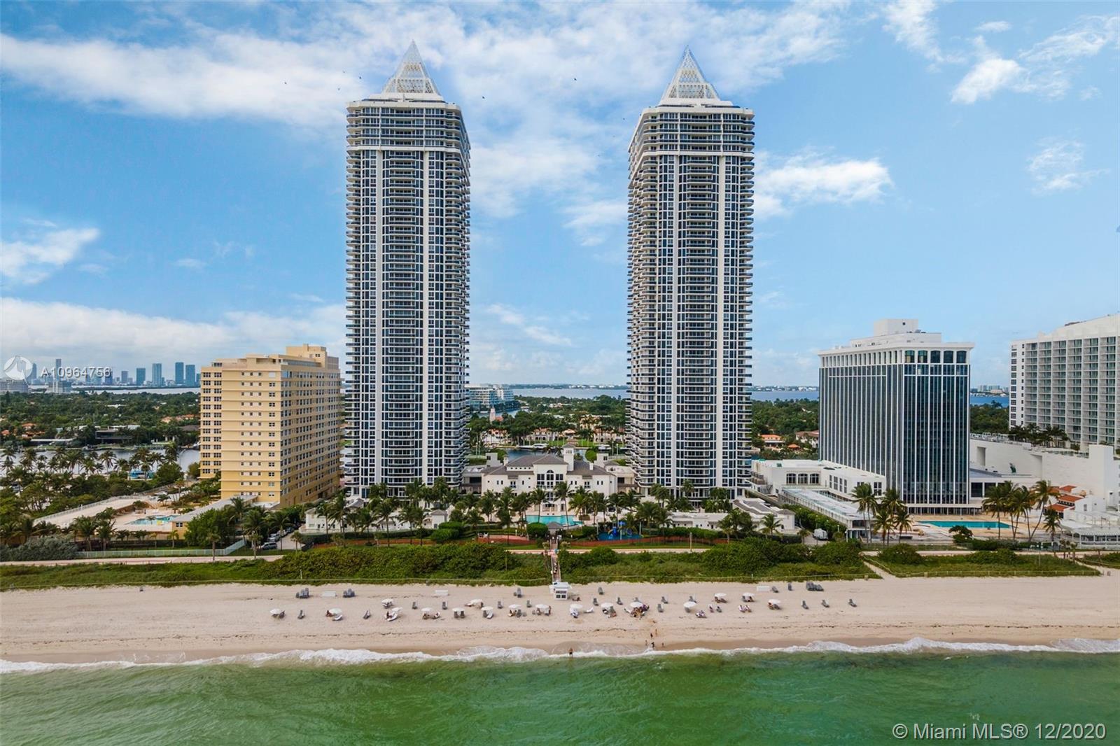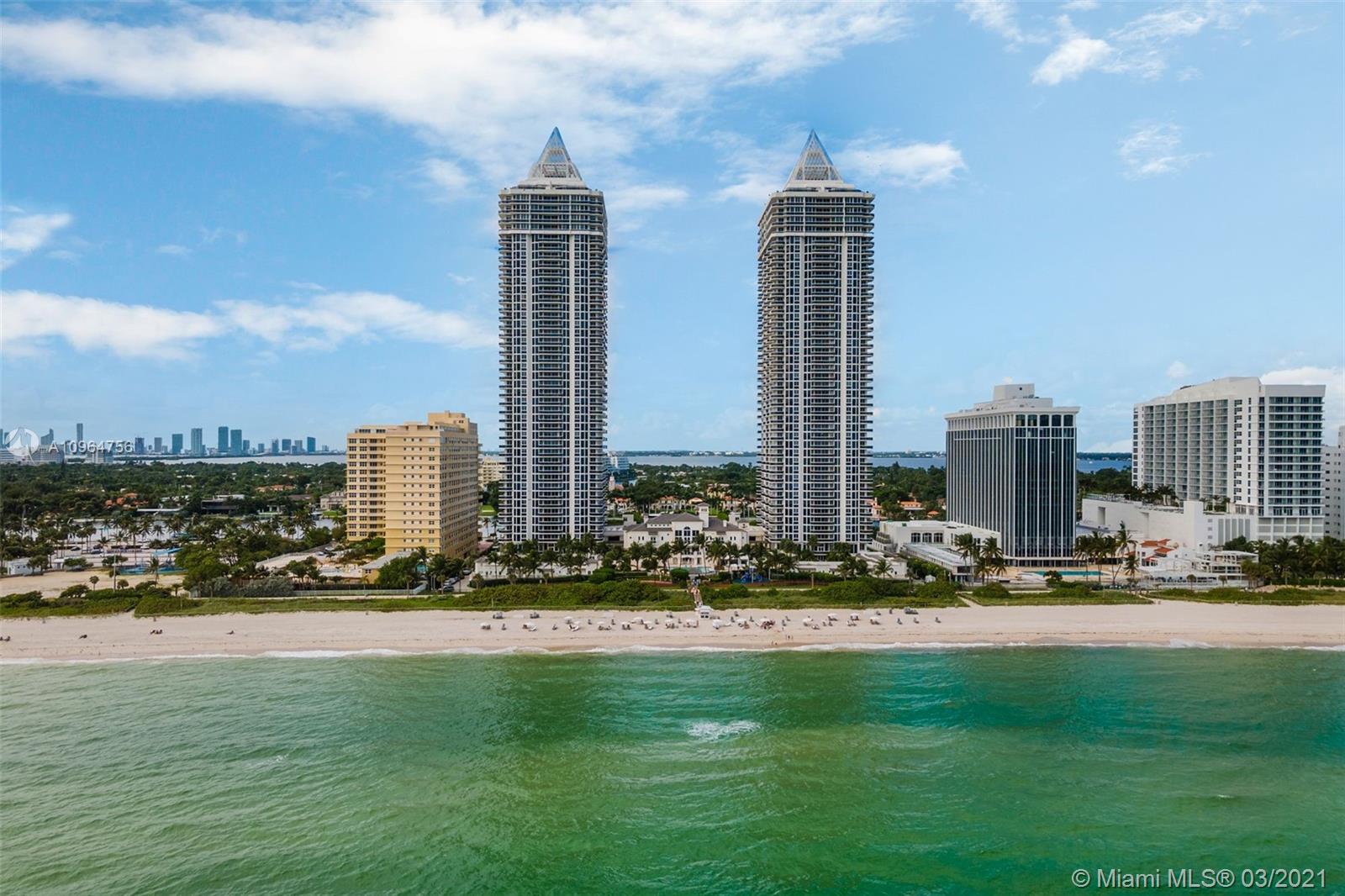 The Green Diamond along Miami Beach’s famous Millionaire’s Row. The apartment features spectacular breathtaking unobstructed south views of the ocean, bay, and the city from every room. With extra-large balcony wrapping around the entire length of apt accessible from every room. Enjoy 1st class luxury beach front living. Amenities: 24hr security, valet, concierge, tennis, pool, towel service, cafe/market w/room service, a 16,000sf oceanside clubhouse/spa, lighted tennis court, fitness center equipped with the latest technology, personal trainers, free workout classes, steam/ saunas, hot tubs, card & party rooms, nursery, playroom, billiards, business center, beach attendant, and more! Just minutes from SOBE, MIA Airport, Midtown, Wynwood, Performing Arts & Bal Harbour Shops.