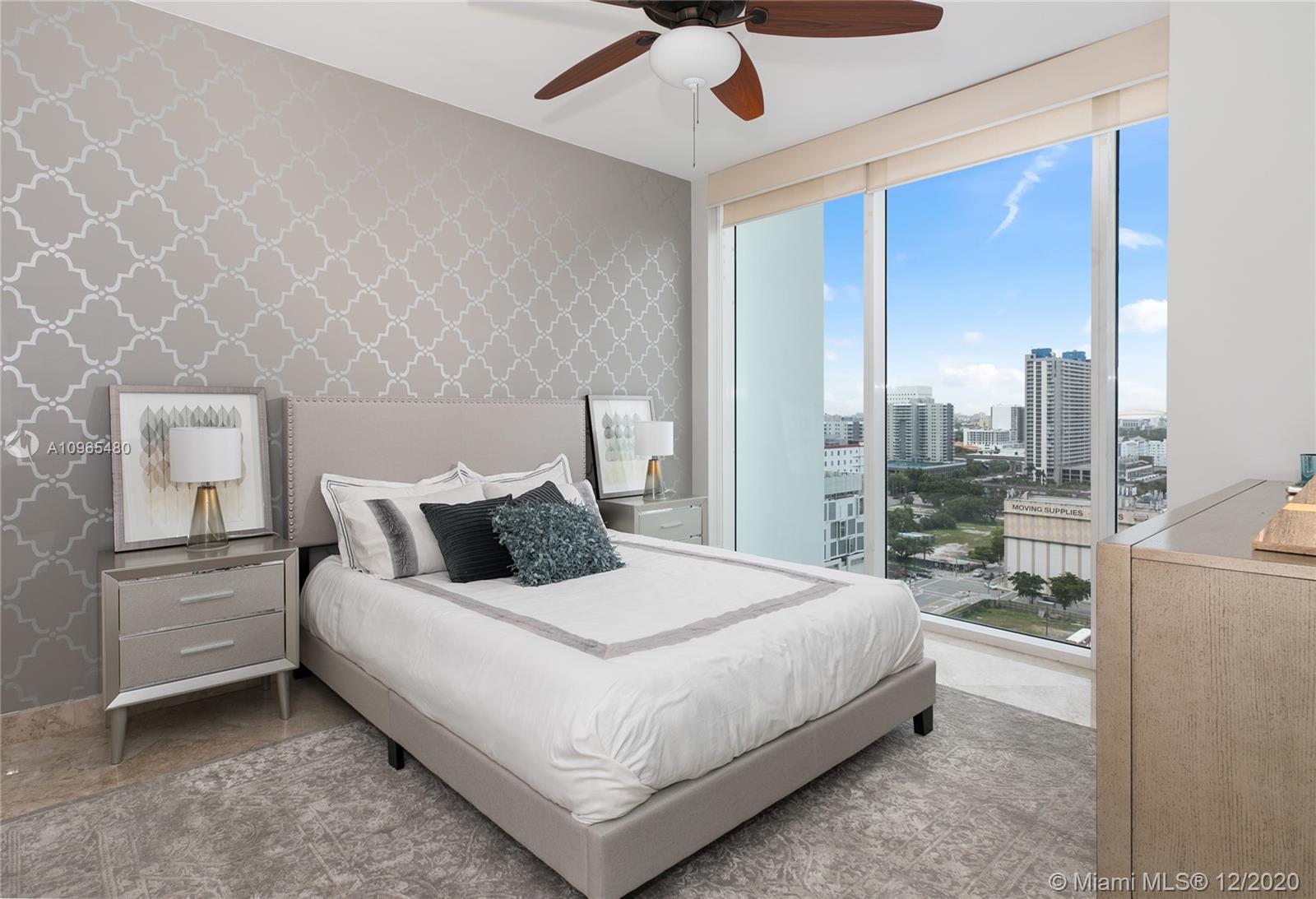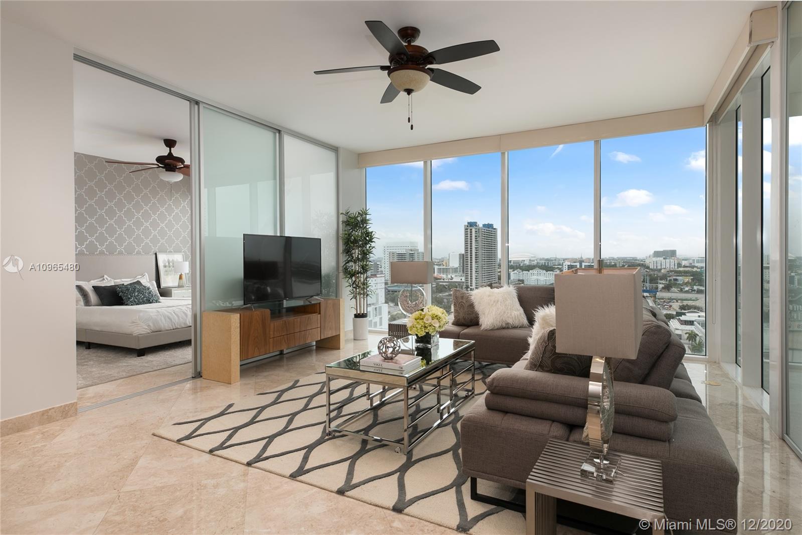 Unit 1506 at Ten Museum park is a FULLY furnished corner two bed and two bath condominium home with north west exposures overlooking the city's skyline. The unit is exquisite light-filled and professionally decorated, marble floors, spa-like master bathroom, airy kitchen featuring high-end stainless-steel appliances. The entrance foyer leads you to an open concept surrounded by glass impact windows overlooking the city. Ten Museum park is a boutique building bringing exclusivity, comfort and state of the art services to it's residents encompassing fitness center, spin studio and yoga room, full-service spa equipped with steam room, snow room and treatment rooms - pool deck with resistance and plunge pools, lounge chairs, and hot tub. Perfect primary residence, pied-a-terre or investment.