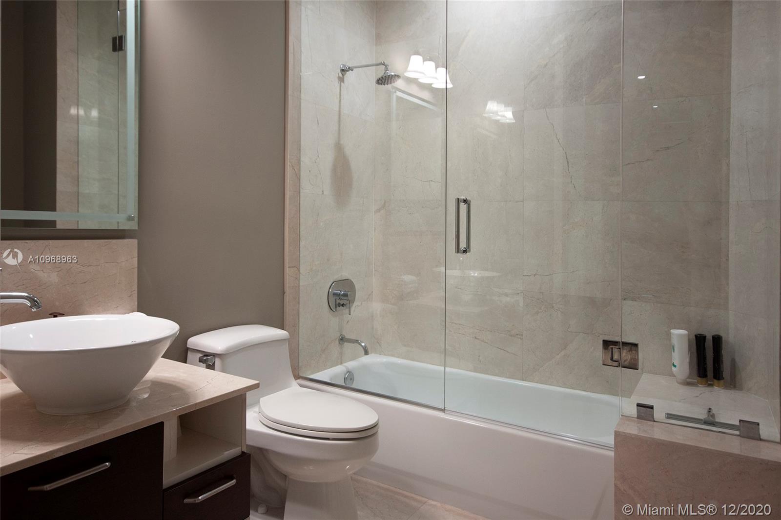 This Tower Suite at Emerald features a unique curve-of-the-earth panoramic views of Biscayne Bay and city skyline. The 10 ft high impact floor-to-ceiling glass windows connect the modern interior space with the private 447 sq ft wrap-around balcony that serves as a fabulous city and ocean lookout for a total area of 2,041 sq ft. The unit features stainless steel Sub-zero appliances, European kitchen cabinets, marble & laminate wood floors and private balcony on 2nd bedroom. Upscale resort-style amenities with 24 hrs. security, valet parking, concierge, rooftop infinity edge pool & spa overlooking the city and bay, state-of-the-art fitness center. Located in the heart of Brickell financial district, just minutes from AAArena, Brickell City Centre, Bayside Marketplace, Miami Airport.