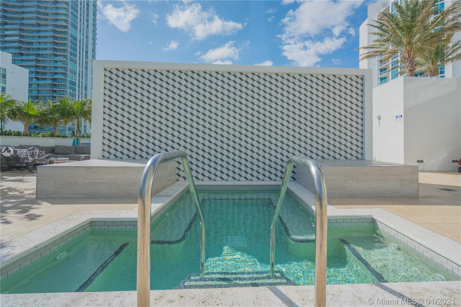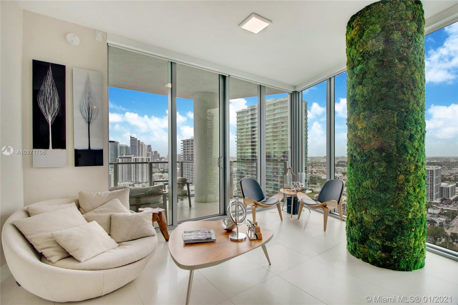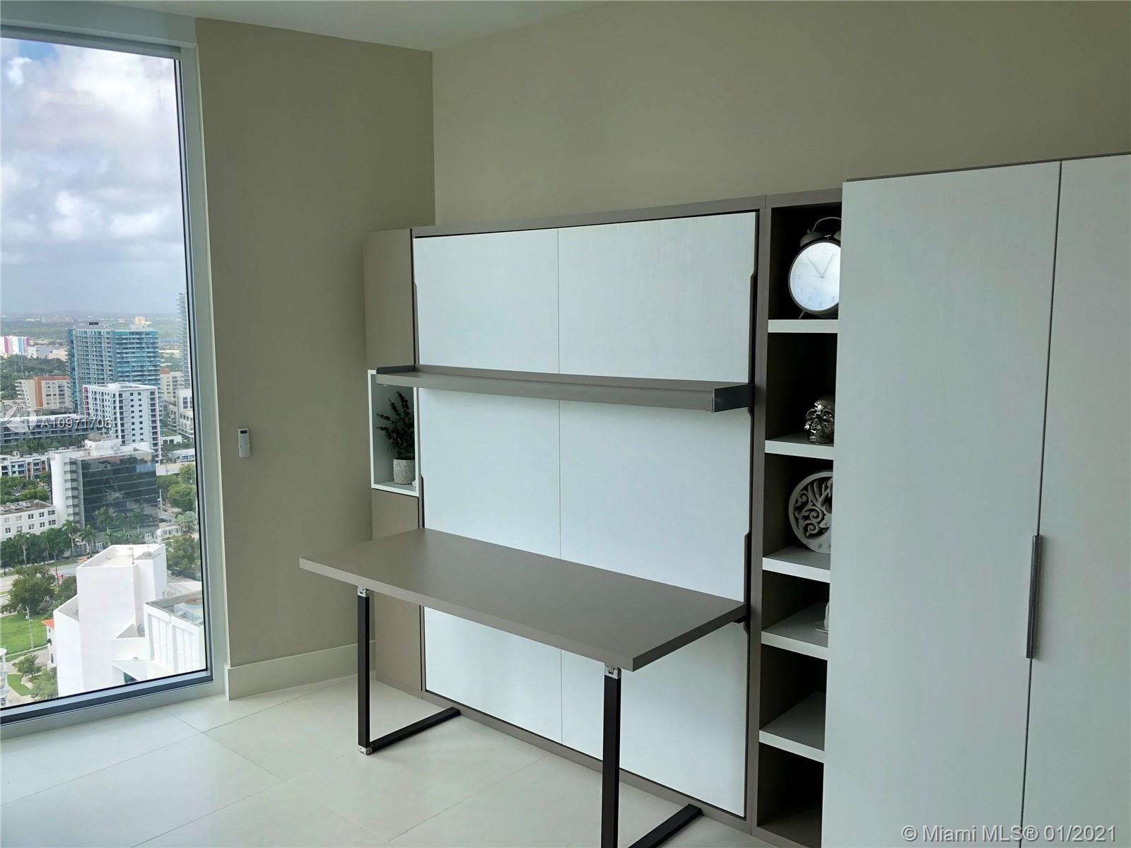 Beautiful upgraded 1 bed + den (enclosed with murphy bed) and 2 baths at luxury building. Professionally decorated by Brazilian designer Myrna Porcaro. Upgrades include kitchen island and wine fridge, wallpaper, vertical garden pillar, murphy bed, & electric shades. Tile floors throughout. Beautiful VIEW OF BISCAYNE BAY, Edgewater & Downtown Skyline, and sunset view. Private Elevator with private foyer entrance; Snaidero Kitchen with Miele appliances; 10 ft ceilings with floor to ceiling glass windows; spacious balcony. Amazing AMENITIES with a Beach Club, elevated sand/beach area, bayfront pool, sauna & steam room, 2 massage rooms, tennis & basketball courts, beach volleyball court, state of the art gym, 6th floor with 2nd pool, bbq area, 2 party rooms. Assigned parking (#233)