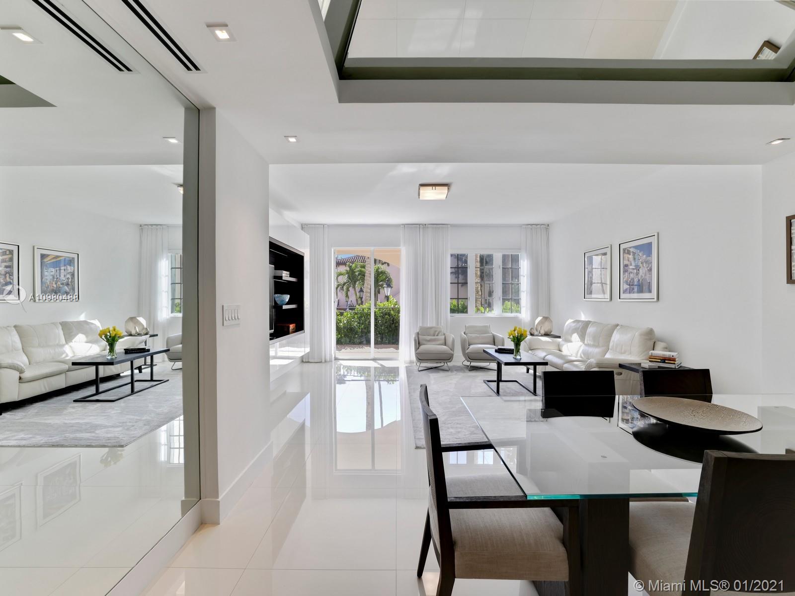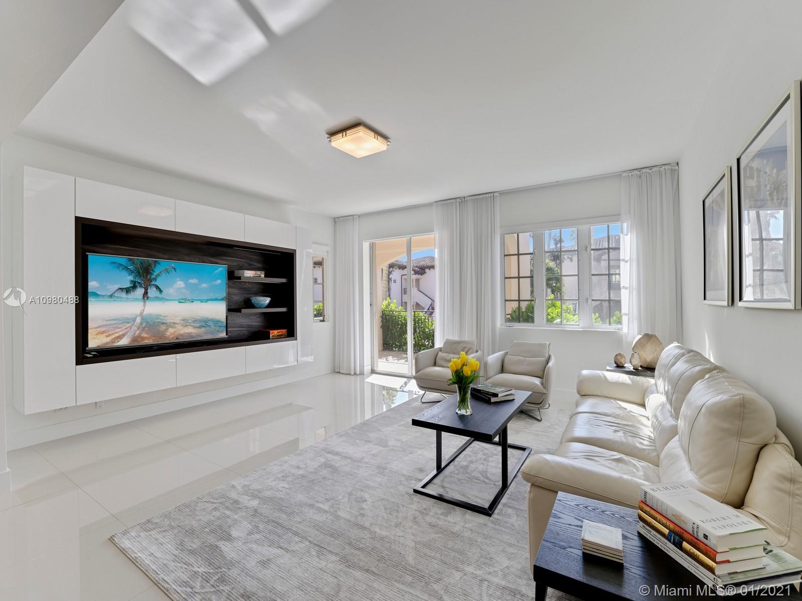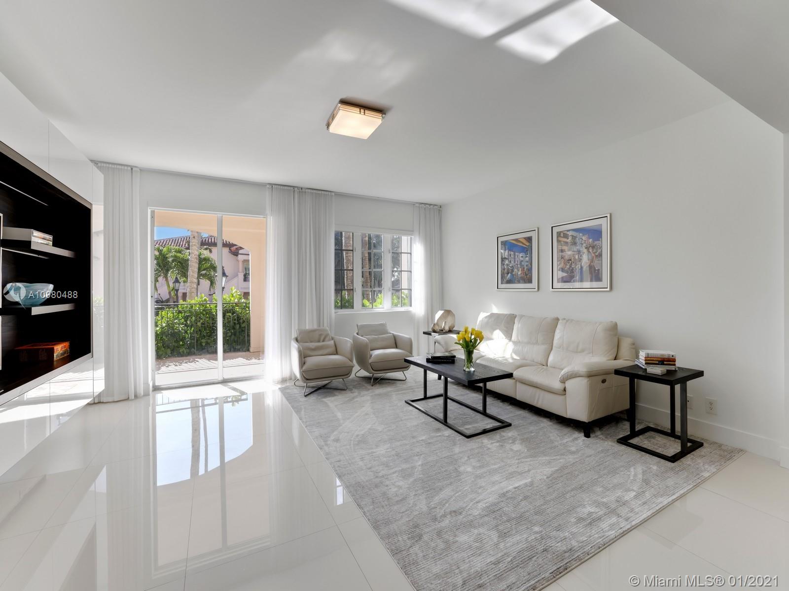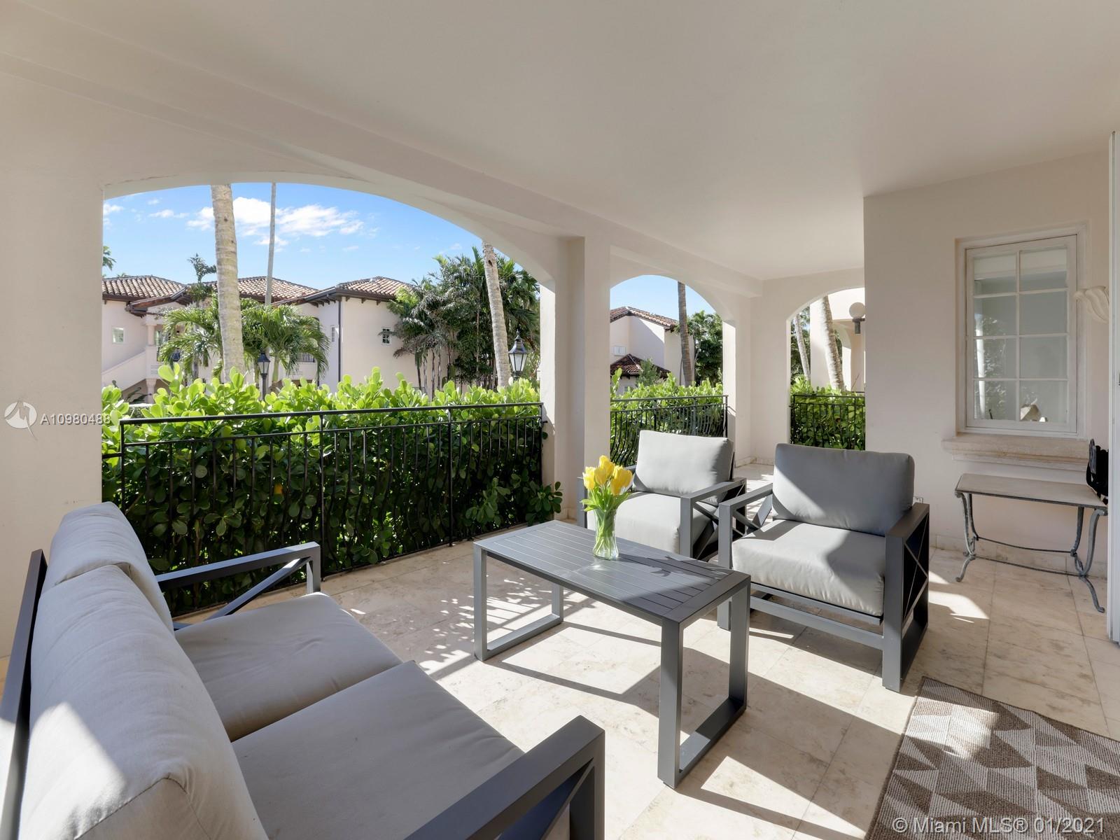 Modern renovation offered fully furnished w/ brand new contemporary décor. White, bright open floor plan w/ chic Italian kitchen and master bath. Desirable ground floor location next to the Beach Club, Spa, tennis courts and members’ beach. The ideal floor plan in this pied-a-mer for personal occupancy and short or long term rental. Boasts 1 garage parking space, storage room & golf cart. Perfect move-in condition - start enjoying the lifestyle of Fisher Island immediately.