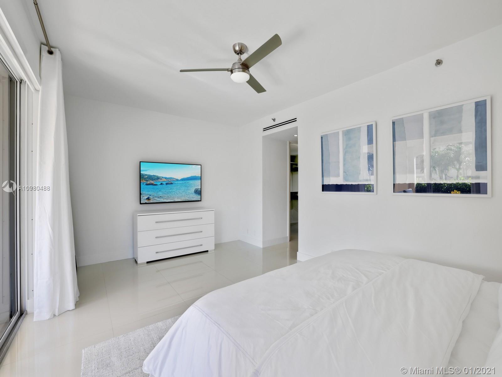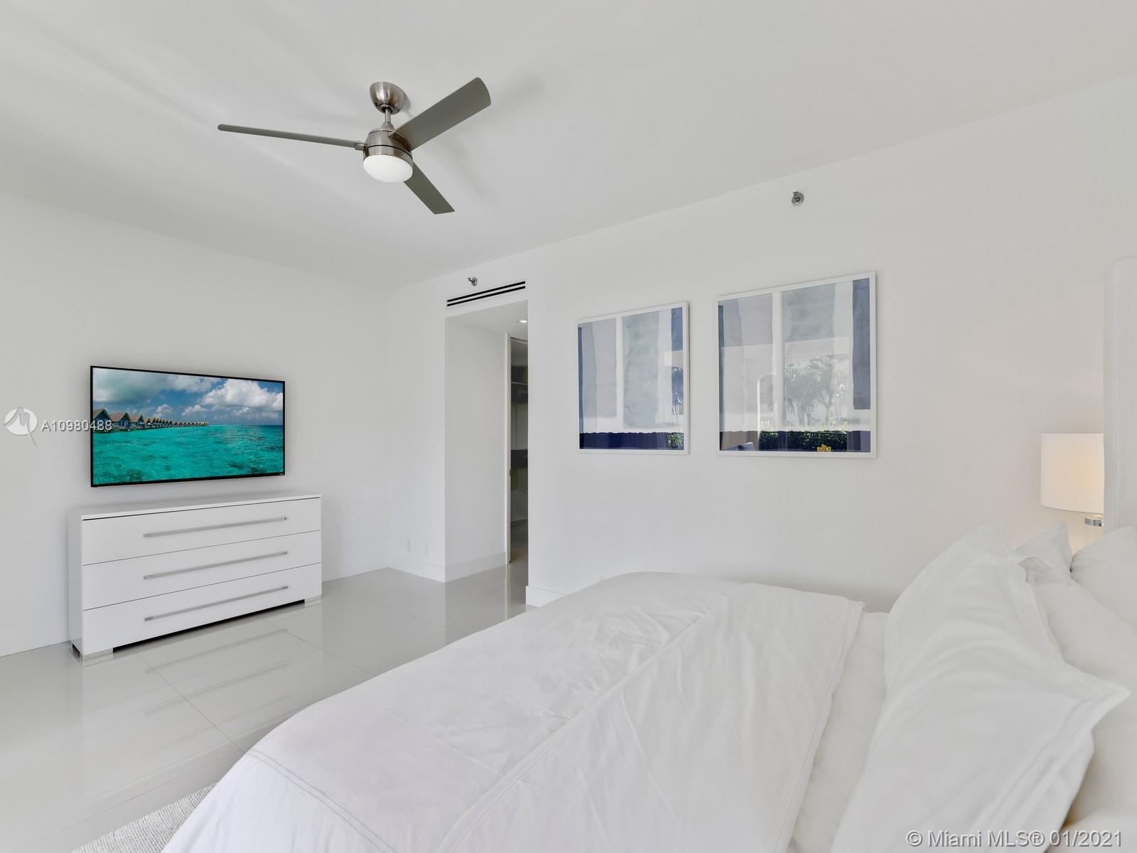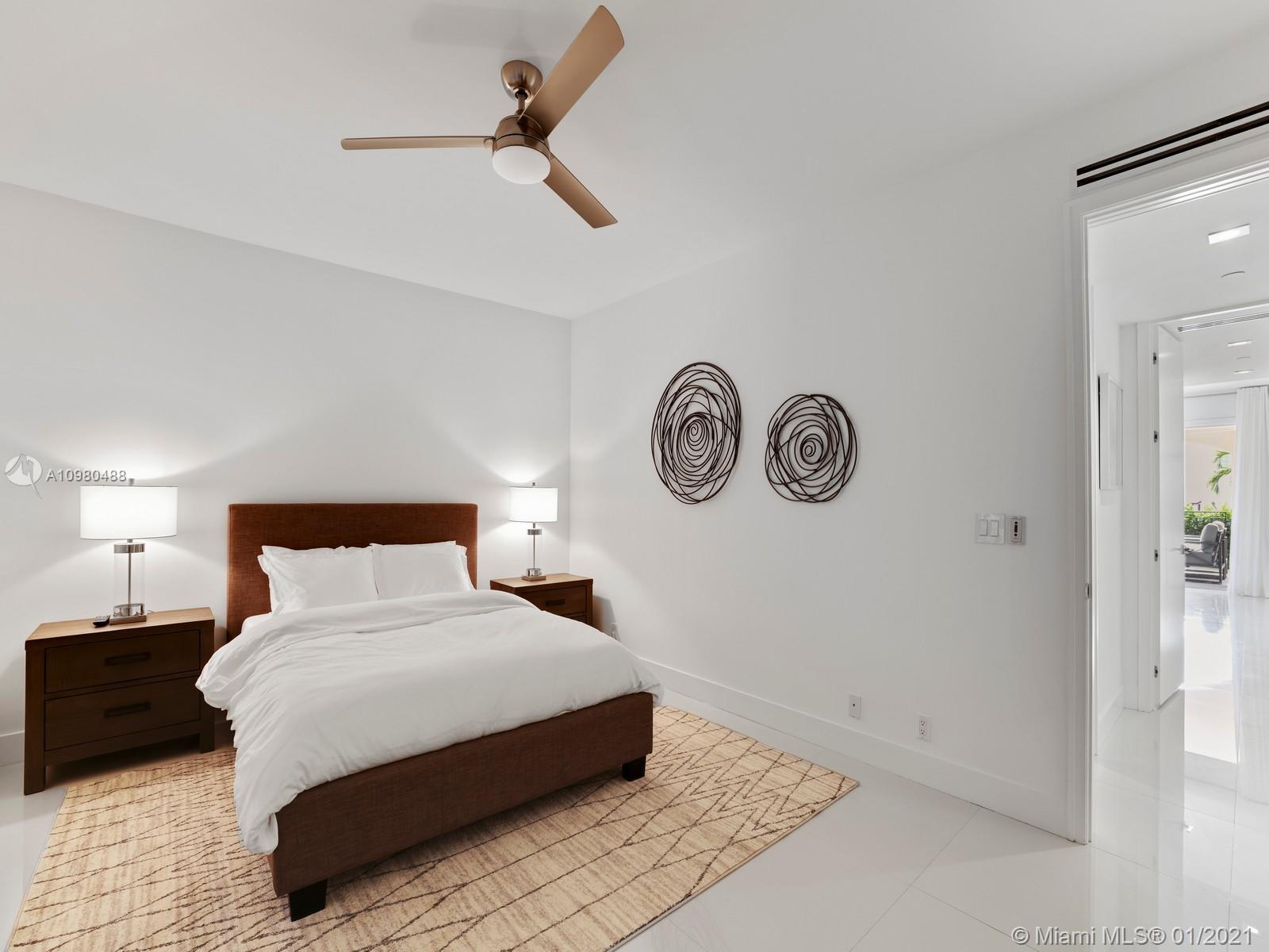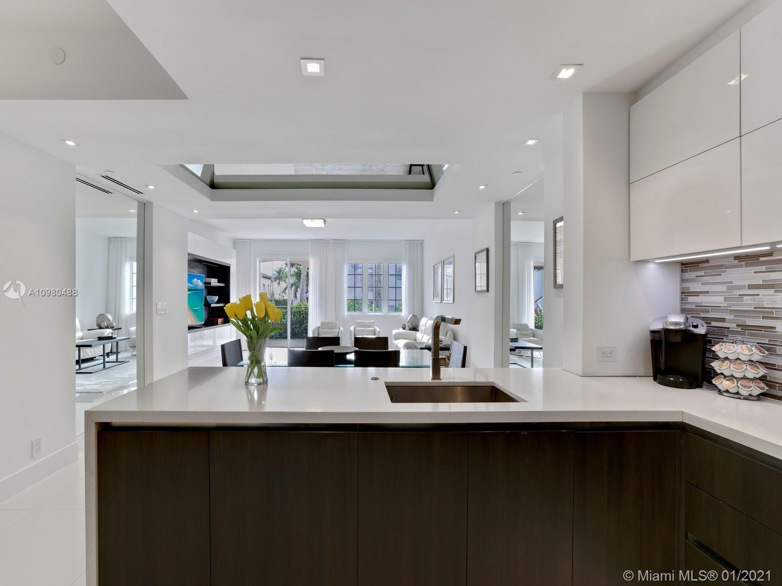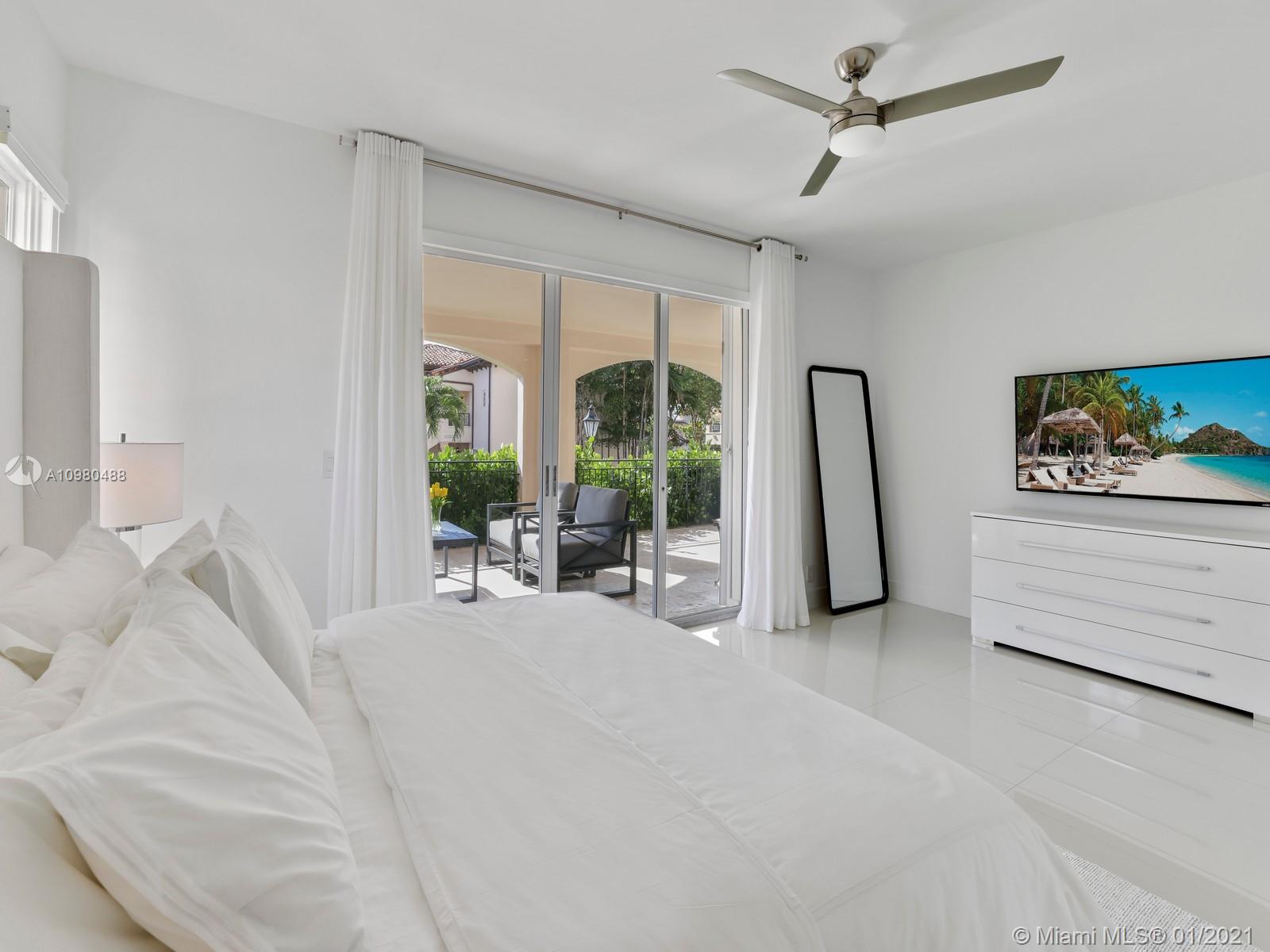 Modern renovation offered fully furnished w/ brand new contemporary décor. White, bright open floor plan w/ chic Italian kitchen and master bath. Desirable ground floor location next to the Beach Club, Spa, tennis courts and members’ beach. The ideal floor plan in this pied-a-mer for personal occupancy and short or long term rental. Boasts 1 garage parking space, storage room & golf cart. Perfect move-in condition - start enjoying the lifestyle of Fisher Island immediately.