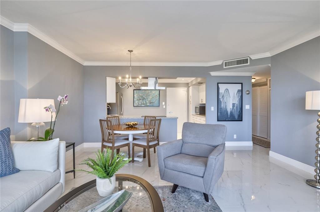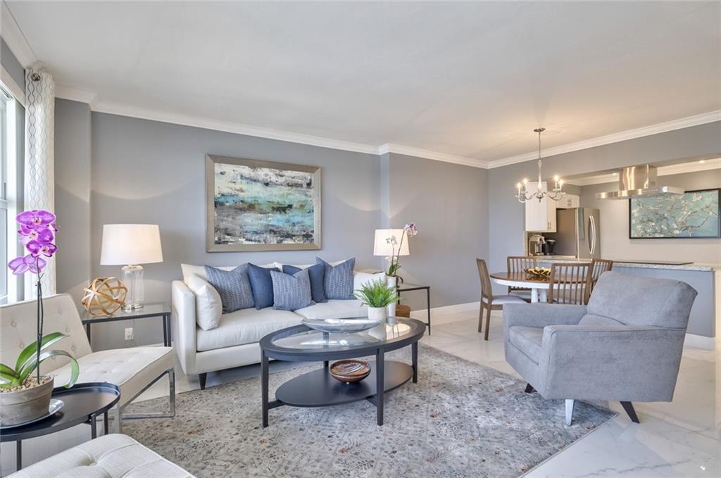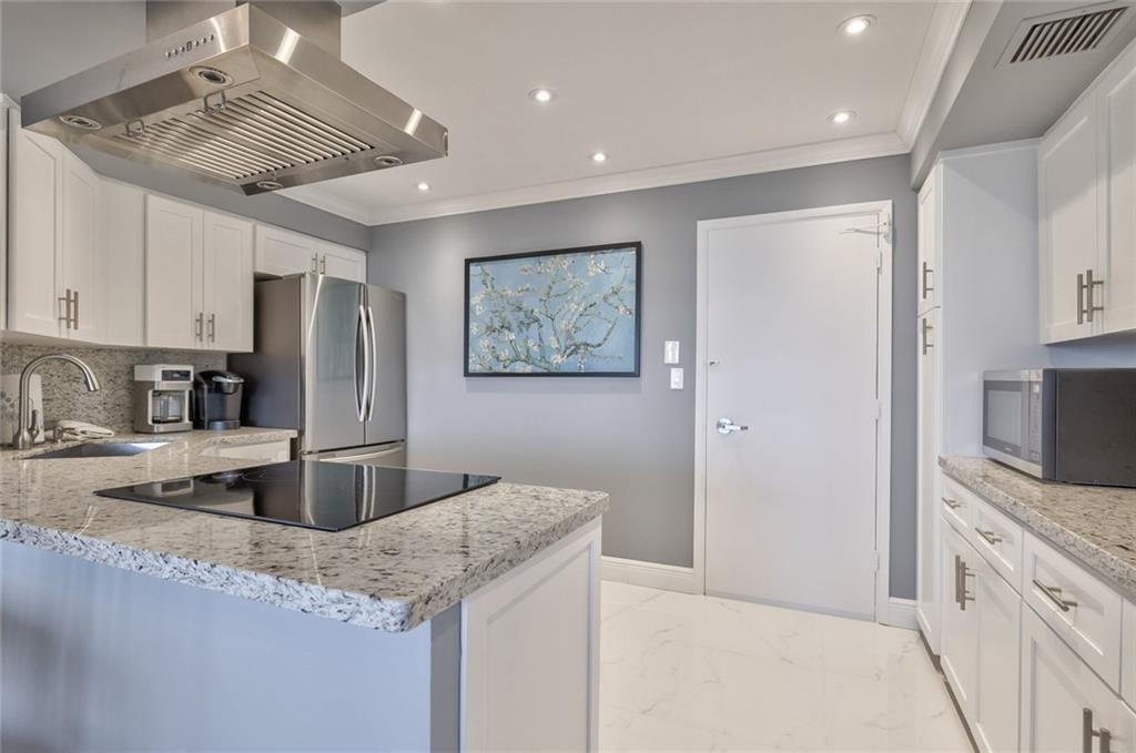 FABULOUS VIEWS, Gorgeous total remodel. 24x24 porcelain floors, crown & base molding. Open kitchen with Samsung stainless steel appliances, granite countertops & backsplash, shaker white cabinets. Modern bath features frameless glass shower, new comfort height commode & all new plumbing. Building upgrading to fresh white paint with blue trim & glass balconies. Hurricane windows, central a/c. Furniture included. Beautiful marble lobby, 24 hour guarded security & on site management. Huge pool gets sun all day & is open until 10 pm. On site gym, bocce ball, shuffleboard, extra storage, community room, bicycle storage, assigned parking, plenty of guest parking. Walk to beach, restaurants, shops. NO RENTING, CASH ONLY. Monthly maintenance includes water, sewer, trash, wifi & fiber optic cable.