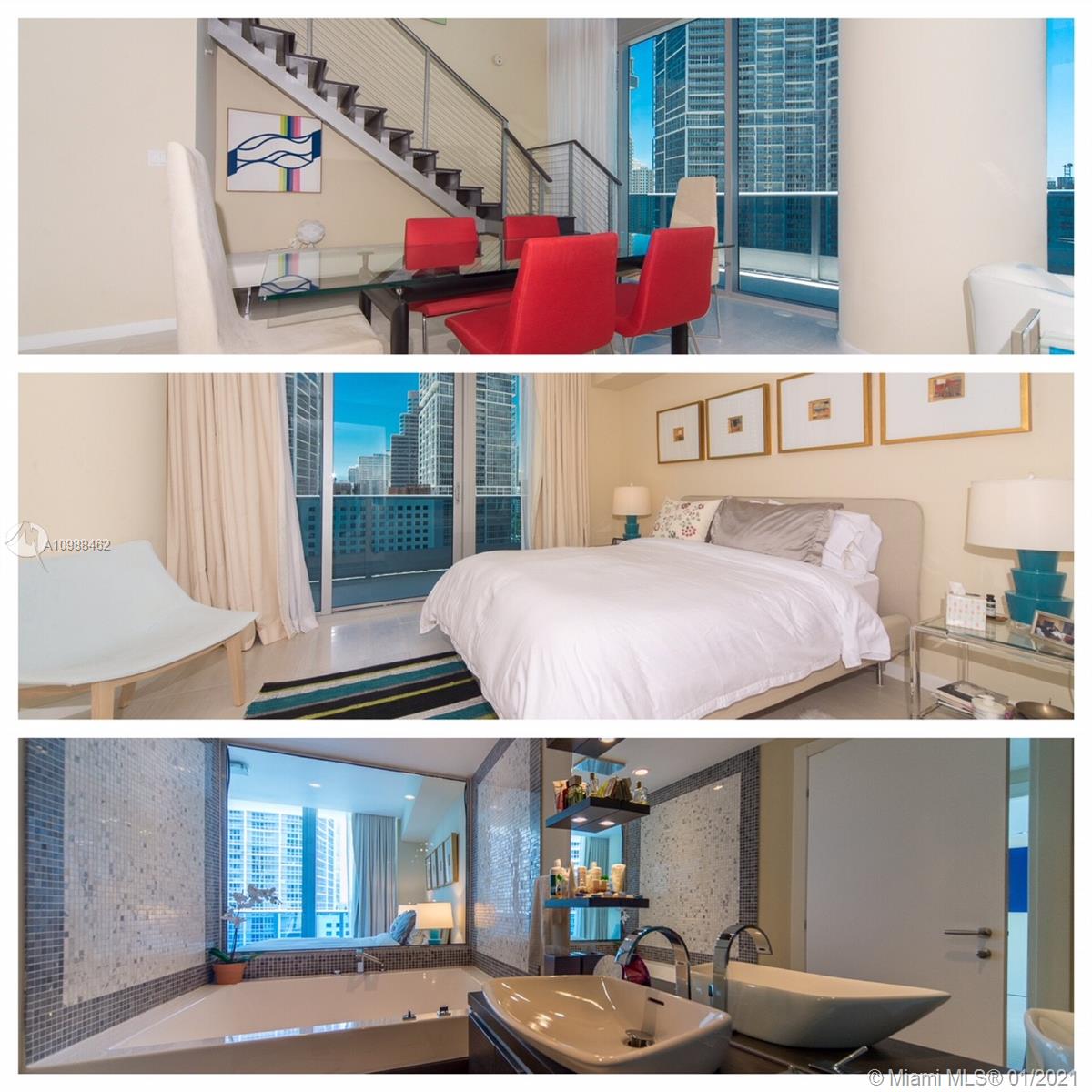 Exquisite 2BD / 2.5BTHS penthouse level townhouse with 2 balconies offering breathtaking views of Miami River and Biscayne Bay. Unit features large walk-in closets in both bedrooms, top of the line finishes, Snaidero kitchen, Miele appliances, porcelain floors, security alarm system, oversized Jacuzzi in the master bathroom, access to hotel amenities, a garage parking spot, 24 hour valet service and concierge, room services, Exhale Fitness center and spa, 2 infinity+3 residences pools, Marina Access, restaurants: Zuma and Area 31. Rented thru February 3, 2022.