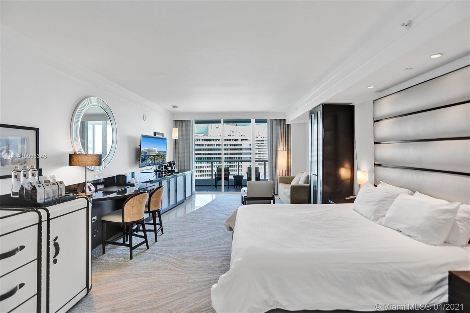 Beautiful just refurbished Jr Suite with 1 bath w/ocean & pool views at The Fontainebleau III. Enjoy full service, vacation-style living in a furnished turnkey unit with king bed, sleeper sofa & more. Enroll in hotel rental program & receive income while away! The Fontainebleau Resort offers luxury amenities on 22 oceanfront acres including award-winning restaurants, LIV night club, Lapis spa & state-of-the-art fitness center. Maintenance includes: AC, local calls, electricity, valet + daily free breakfast in the owners lounge.