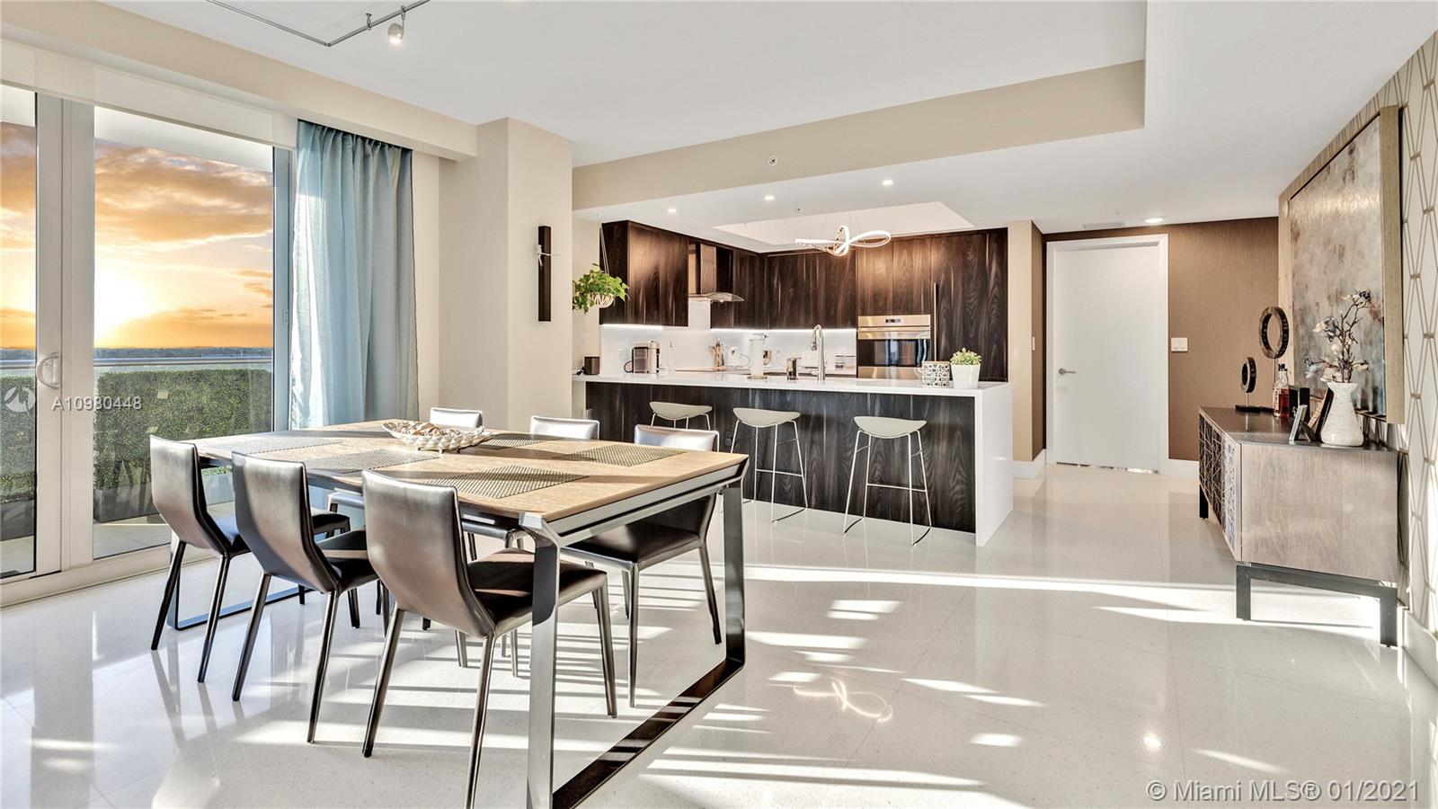 Exquisite 2 Bedroom, 2.5 Bathroom with Panoramic Skyline & Sunset Views, Open Concept, Custom Work Throughout & 72' Terrace with BBQ. Chef's Kitchen with Italian Cabinetry, Quartz Countertops, Wolf Oven & Induction Cooktop, Sub-Zero Fridge. The Open Living Room Includes Custom Storage, Entertainment Wall & Chic Lights. Spacious Primary Bedroom Includes Walk-In Closet, Combo Storage/Entertain Built-Ins & Primary Bathroom with Dual Backlit Vanities & Grandiose Shower. RIVA Residences Provides 40,000 SF of Amenities: Heated Lap Pool, 7,000 SqFt Gym with YOGA Studio, Resort Style SPA with Sauna, Steam & Treatment Rooms, Resident's Lounge, Sunset Deck & Jacuzzi, Cucina to Entertain, 24/7 Front Desk Attendant, Valet, 2 Dog Walks & Central Location. Private, 2 Car Garage for Additional $150k.
