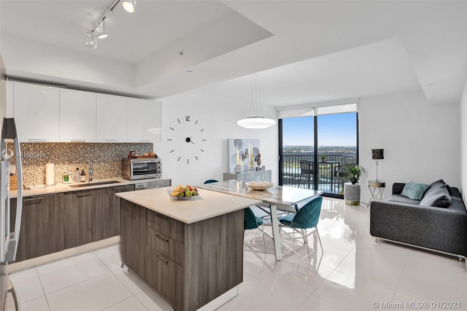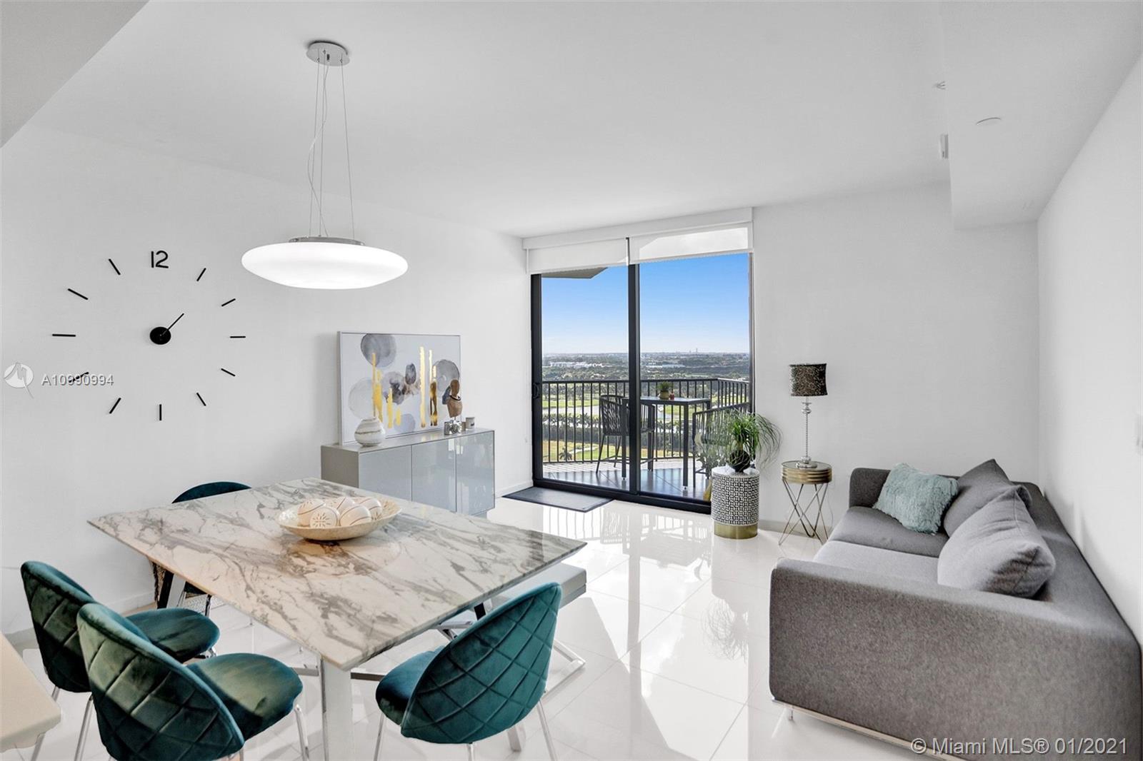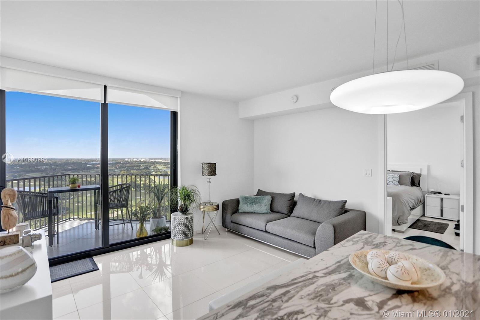 Unobstructed panoramic golf course views and skyline from every room of this high end condo in Downtown Doral. Blackout curtains, top of the line finishes, open concept kitchen with quartz countertops . Washer and dryer IN UNIT. Fantastic building amenities: pool, sauna, locker room, massage room, fitness center, cycling, valet. Be a part of the renaissance of Doral and live within walking distance of fine dining shopping and entertainment. The ultimate urban experience in the suburbs.