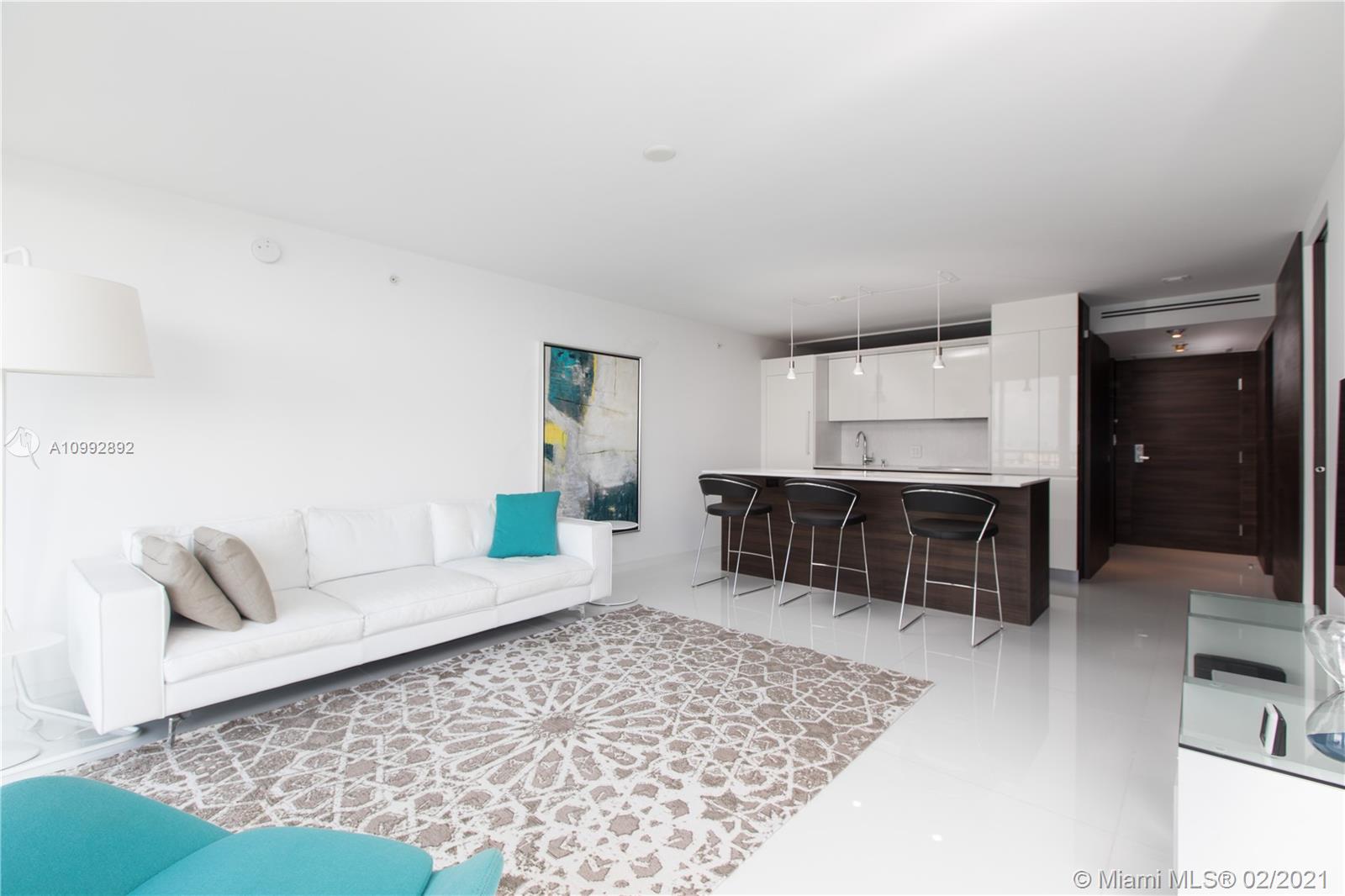 One of a kind renovation to create 2 BR, 2 full baths. Unit has been reconfigured to maximize living space and views. White glass marble floors throughout. Open living and kitchen area. Kitchen features Miele and Wolf appliances. Floor to ceiling impact windows with extended private balcony on the highest non penthouse floor. Magnificent open views of Govt Cut, Ocean, Fisher Island and the Miami skyline. All assessments paid by Seller. Must see to appreciate.