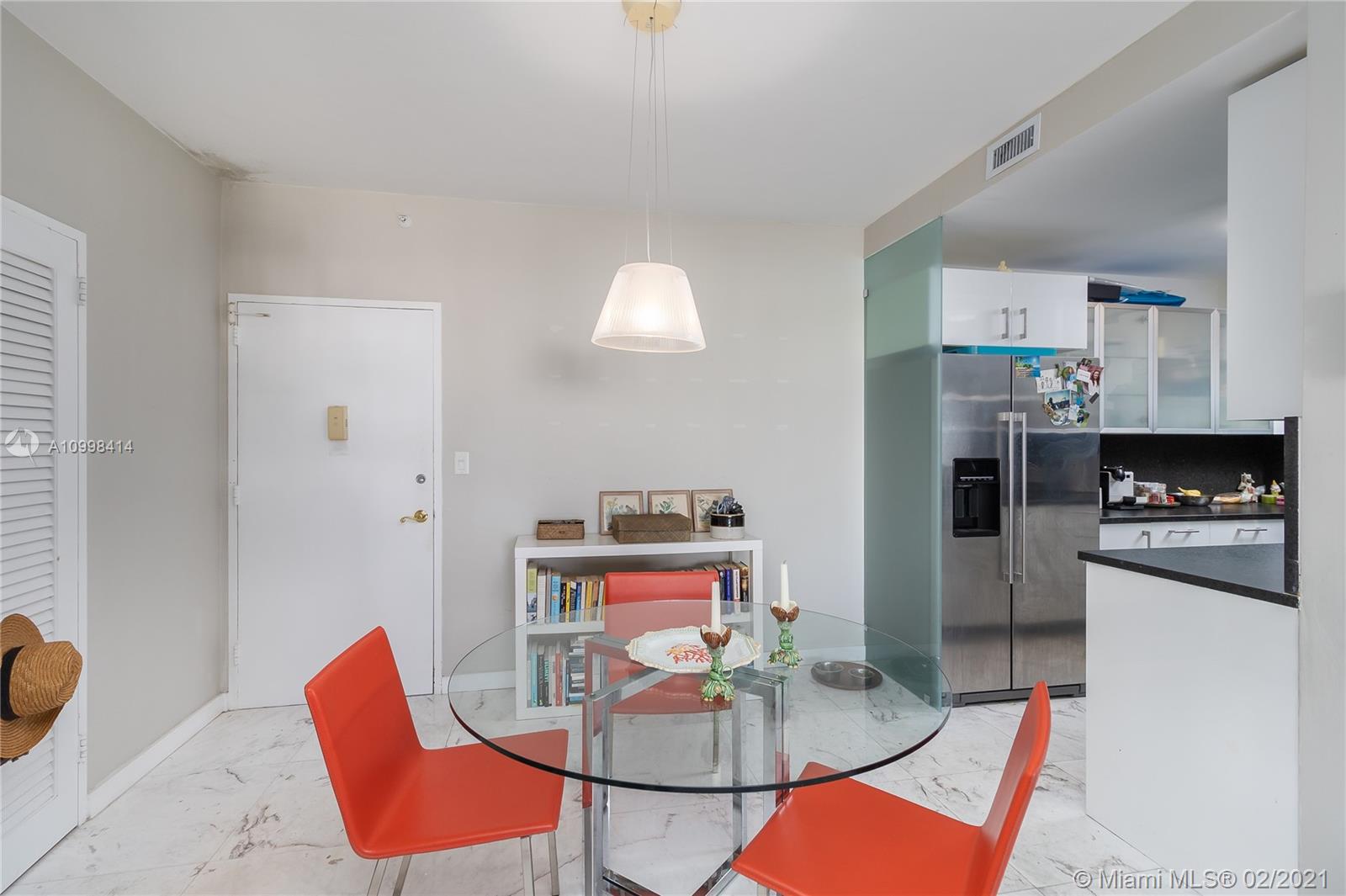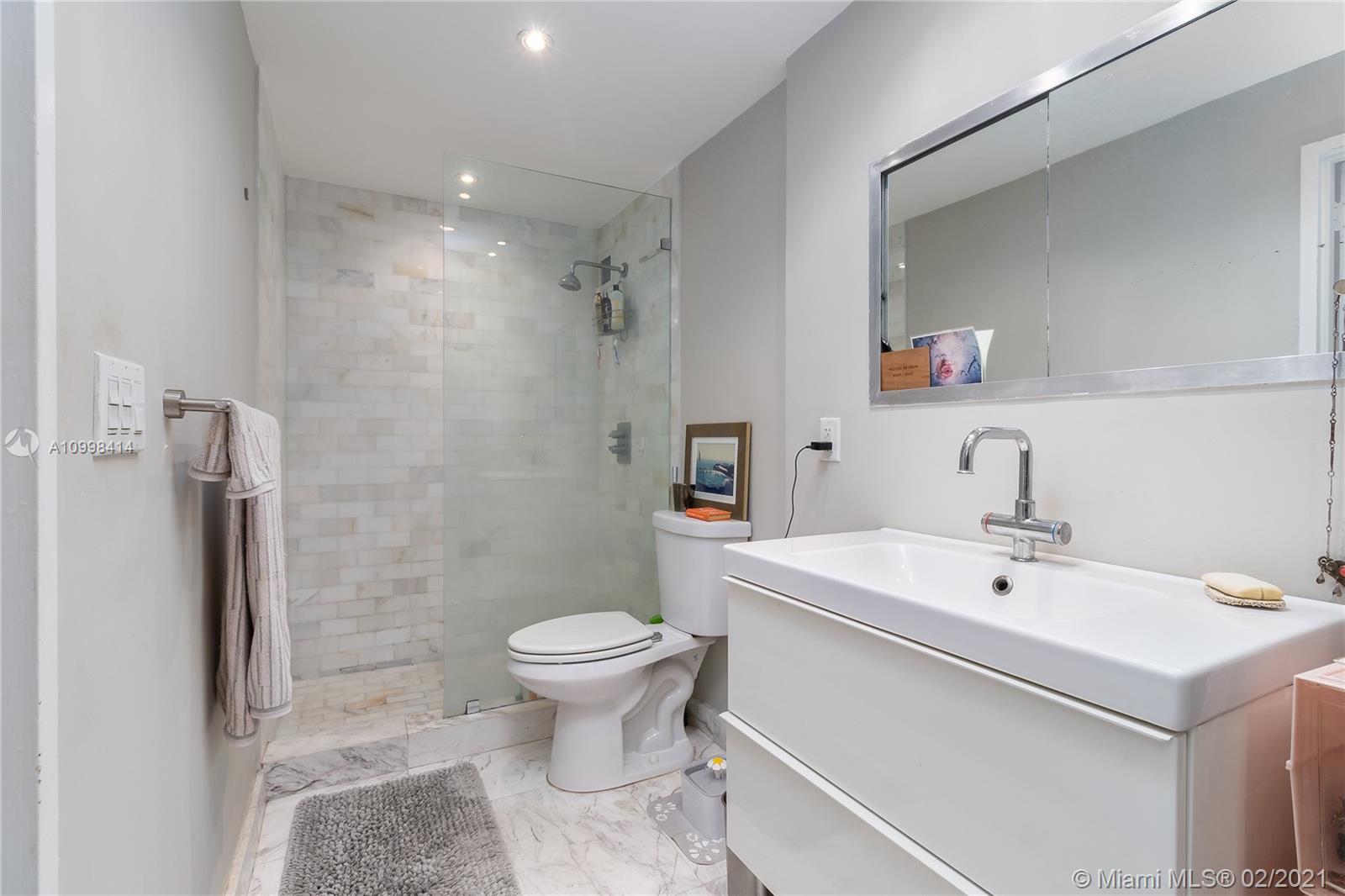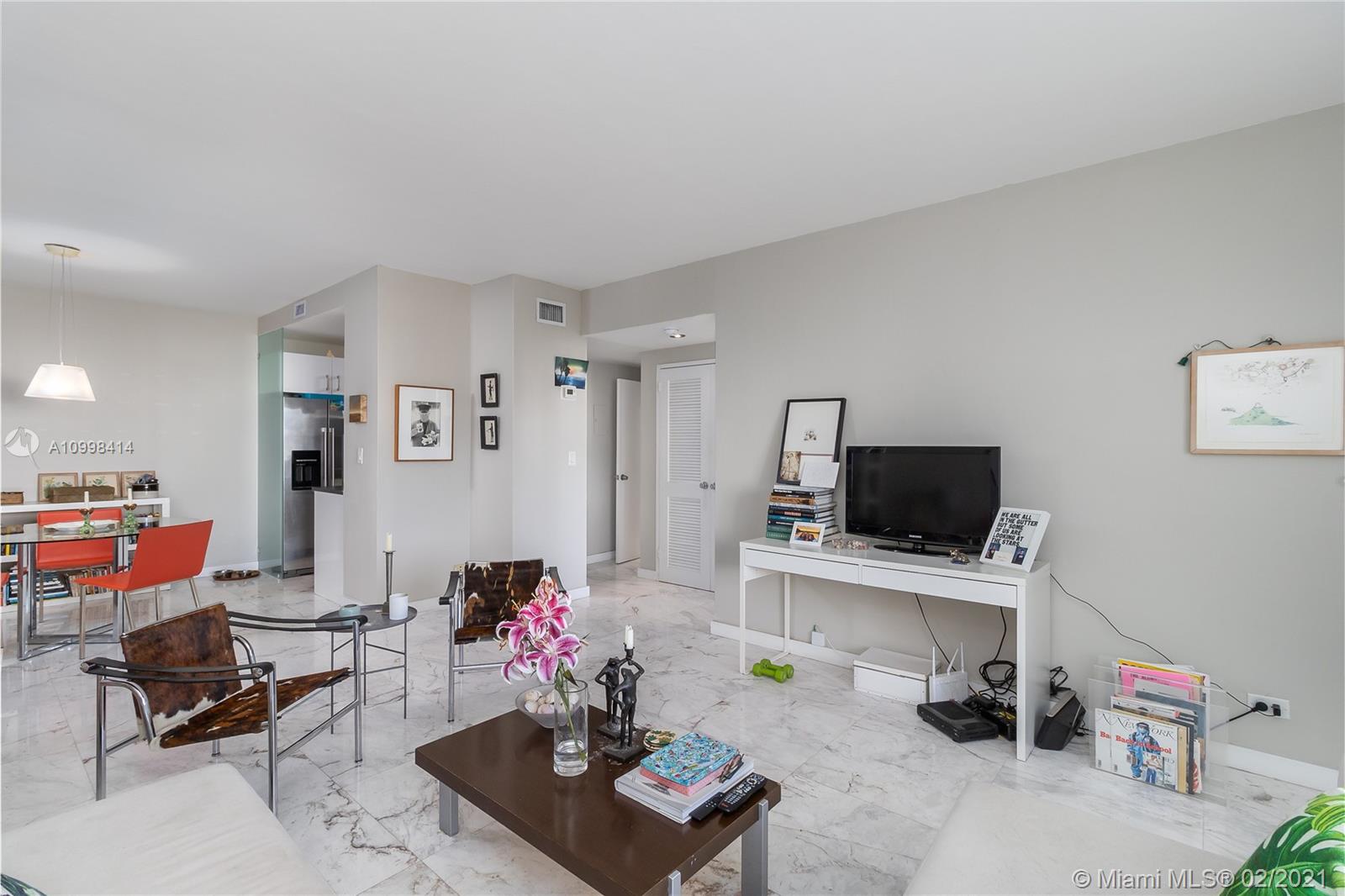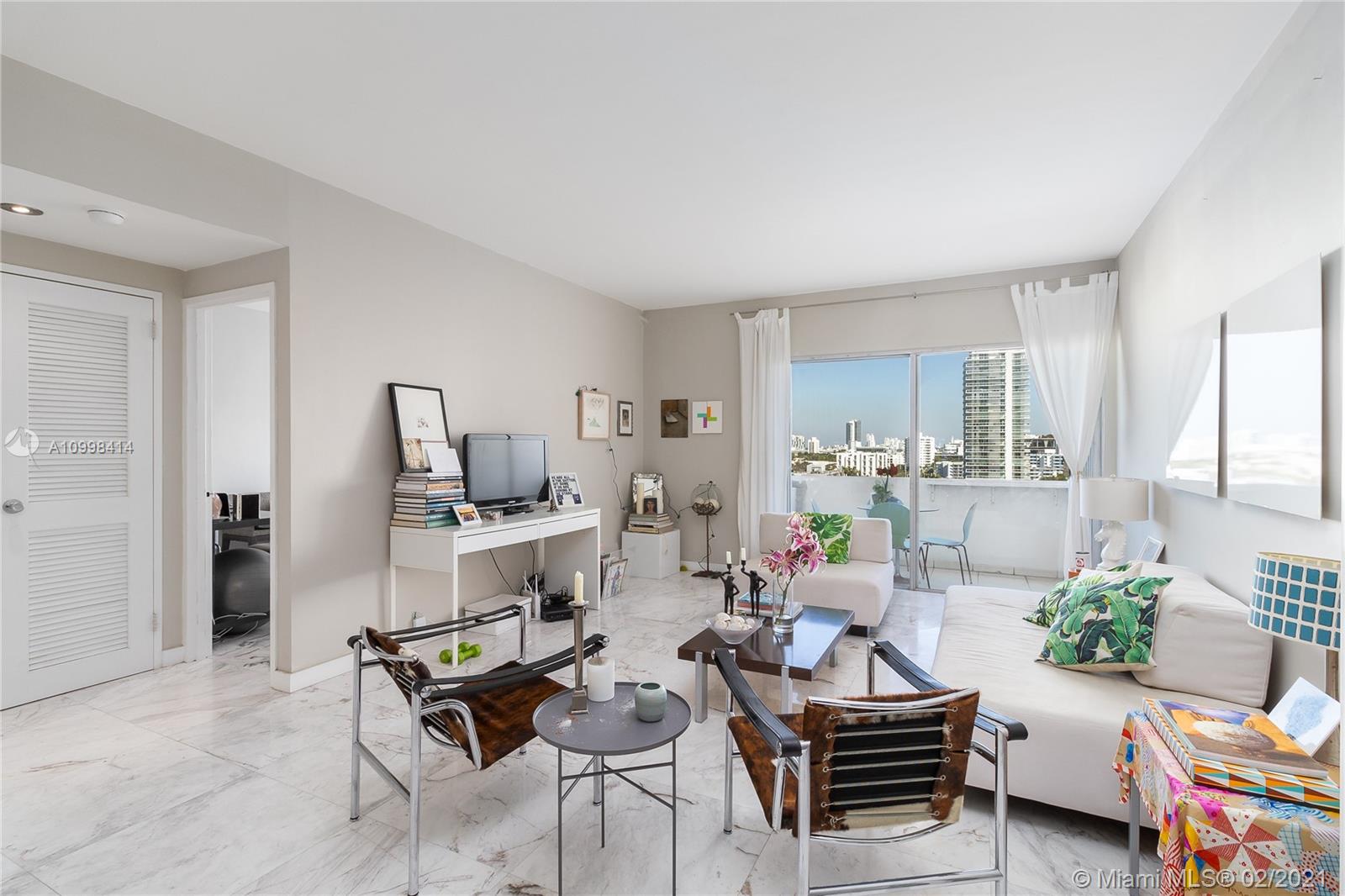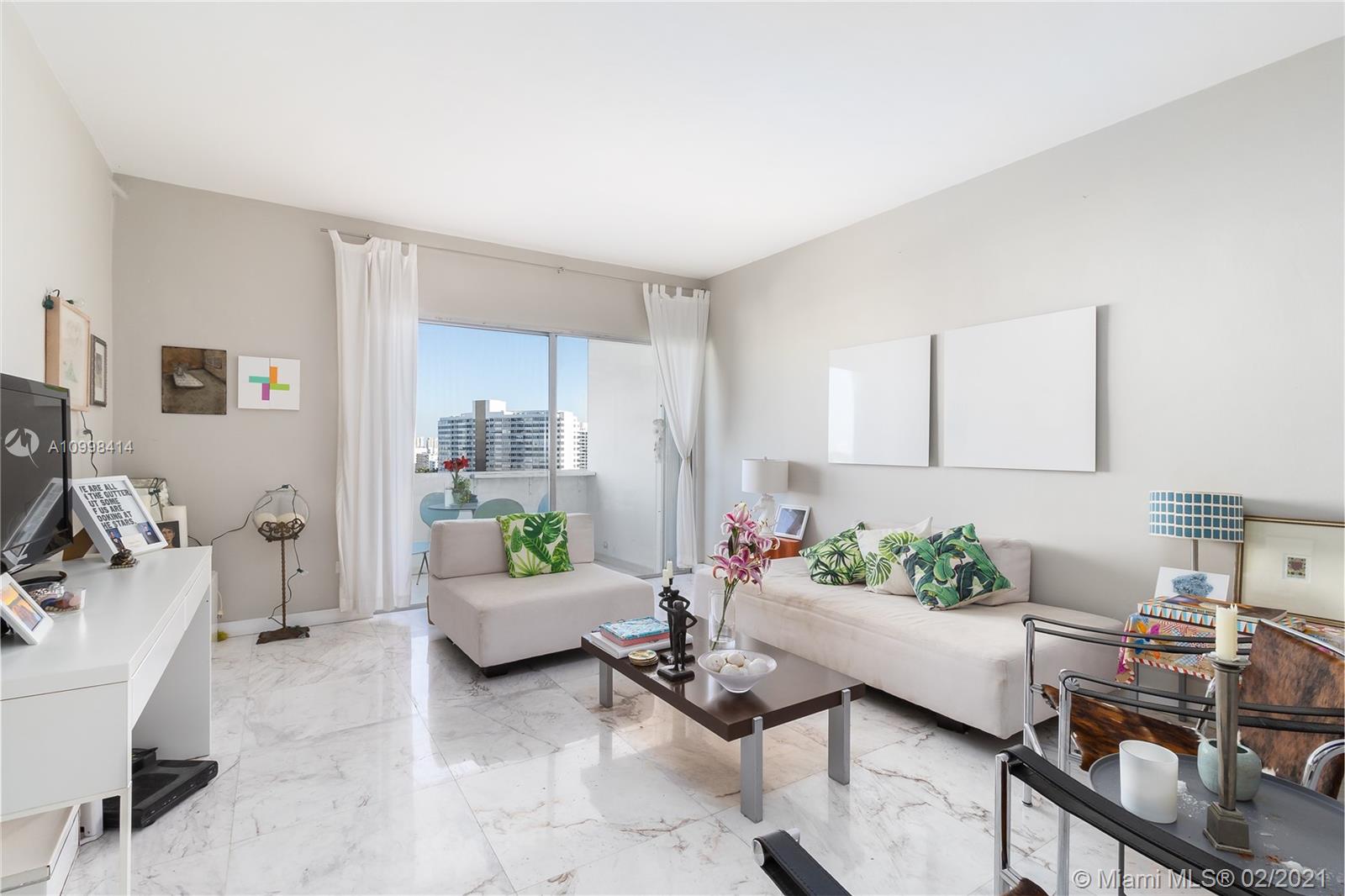 Bright and fresh 1 bedroom apartment in cool and newly condo converted Morris Lapidus building in Belle Isle. Renovated with sleek carrara marble floors throughout with semi-open kitchen. Spacious bathroom with opening to admire the views with natural light. Enjoy spectacular sunrises and soothing park and bay views. Condo has an spectacular pool on the bay with an enormous deck to appreciate unobstructed sunsets all year long. Fantastic location in the Venetian Causeway right across the Standard Hotel, walking distance to Lincoln Road and trendy Sunset Harbor area. Easy to show!