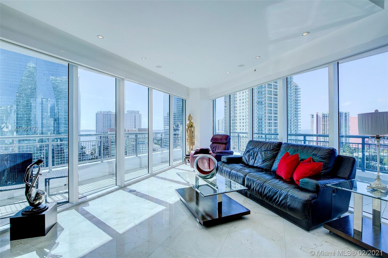Seller Motivated. Spectacular sought after ONE STORY corner unit at the Infinity at Brickell, with panoramic city/ocean views of Miami South, East, West, and pool areas. This stunning 2 bedroom, 2.5 bathroom unit has a wrap around balcony with door access from both rooms. The unit has marble floors, Bose surround speaker system, upgraded appliances, new washer/dryer, tray ceilings with dimmable lighting, kitchen island, upgraded closet doors, and a nest thermostat / security camera. A very quiet private floor with only one other unit on the south wing. Building amenities include, pool, jacuzzi, sauna, steam room, bike storage, 24 hr security, concierge, valet parking, a cafe / market in the lobby. Plus storage units are available in the building and a car wash on site!!!