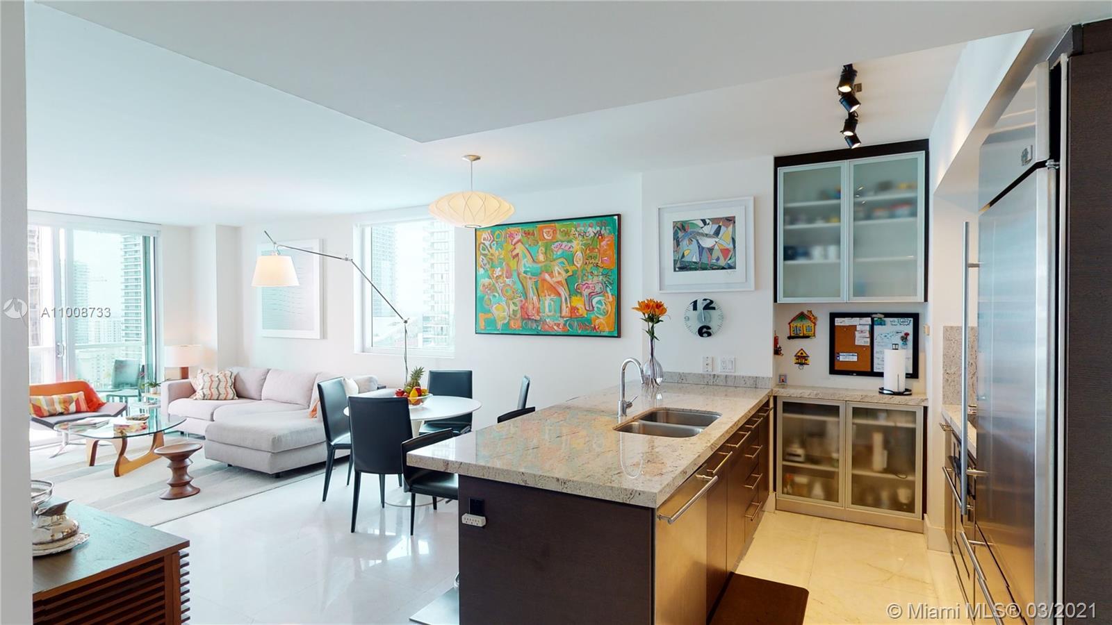 Sublime condo with South views of city skyline & Biscayne Bay. Located in the heart of bustling Brickell on the East Tower of trendy "500 Brickell" building. This 2bed / 2bath / 1 parking corner, offers upgraded kitchen with new & larger granite countertops & additional cabinet space. Beautiful marble floors throughout favors the openness of continuous impact doors & windows allowing the sun to play inside while giving open access to a large balcony. The master suite comes with spacious closets, balcony access, dual sinks, whirlpool tub & cozy shower. Featuring a split plan with the second bedroom & bathroom on neutral colors. This building amenities are meant to be thoroughly enjoyed. Pools, gym, entertaining areas, reception desk, valet & much more for a true Miami living experience!