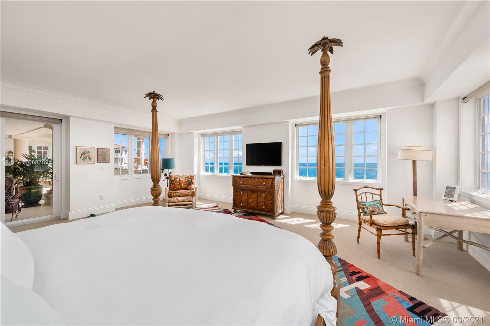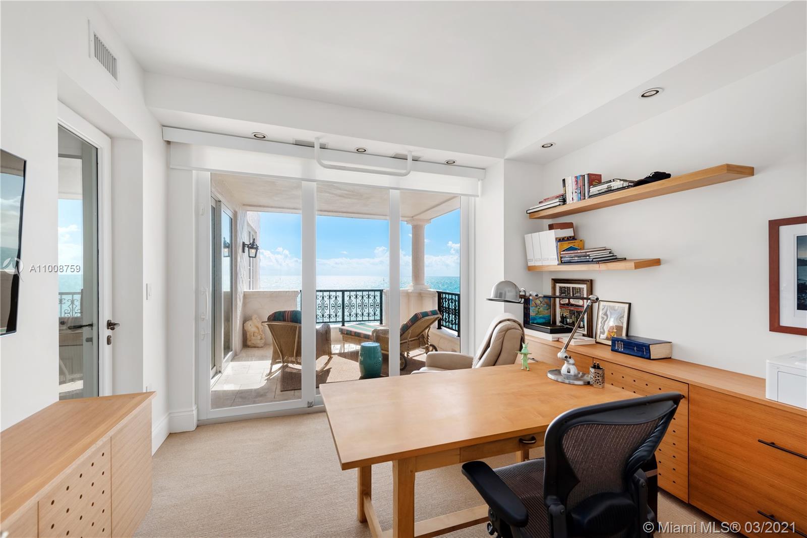 This stunning oceanside lower penthouse offers million-dollar direct ocean views. Enjoy the breathtaking Miami skyline, oceanfront views, and golf course views from every room and balcony. Boasting 5 bedrooms, 5 bathrooms, and 1 half bath, this 6,170 square foot residence offers custom features throughout. Intricate design details include a remarkable fireplace, exposed wooden beams, and custom carved wooden doors in the living room. Gourmet kitchen that features top-of-the-line Wolf and Miele appliances including a Wolf induction burner. Includes two covered garage parking spots and golf cart parking space. Wake up in your principal suite with sensational ocean views, dual closets and a private balcony. Live the ocean front lifestyle dream of Fisher Island.