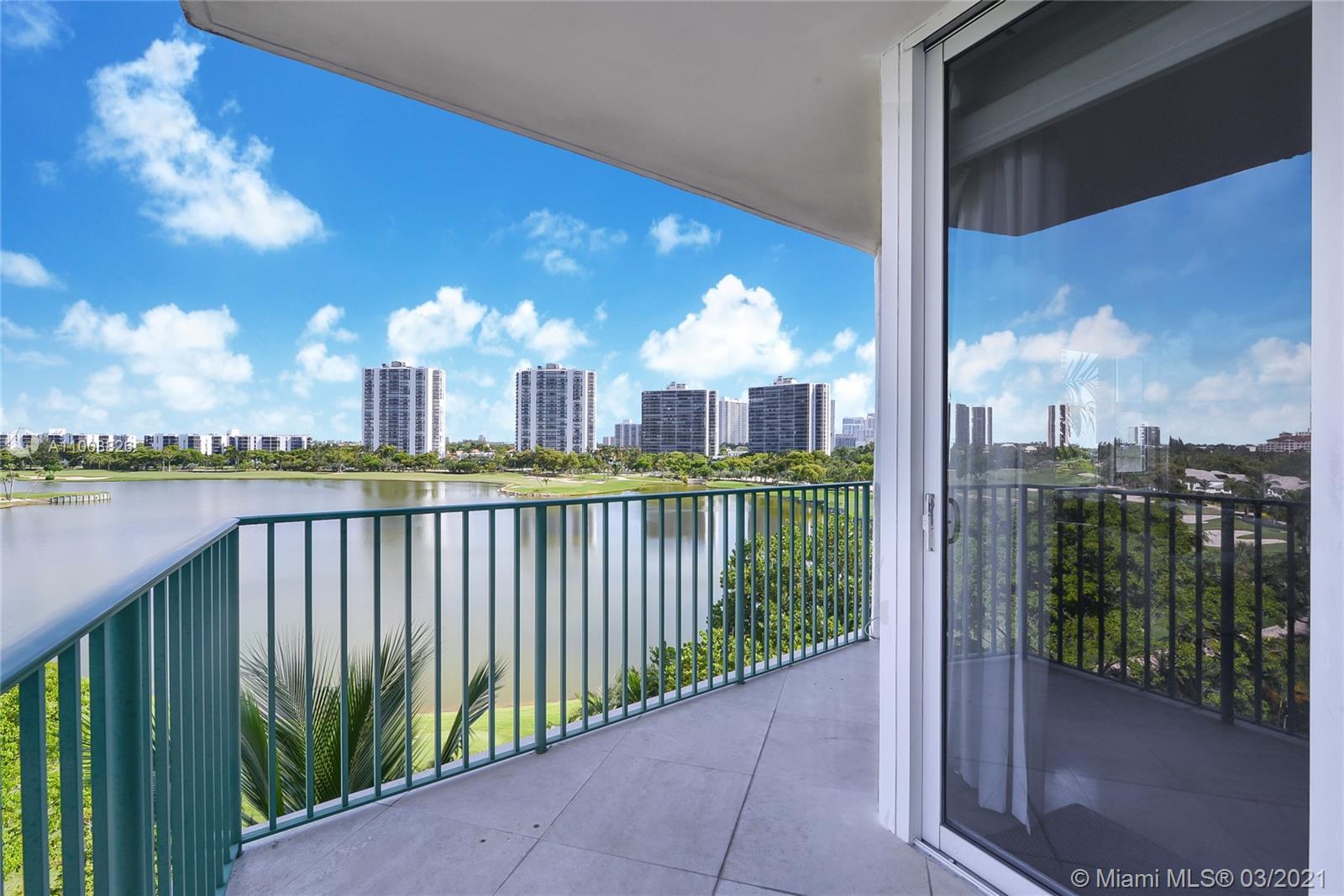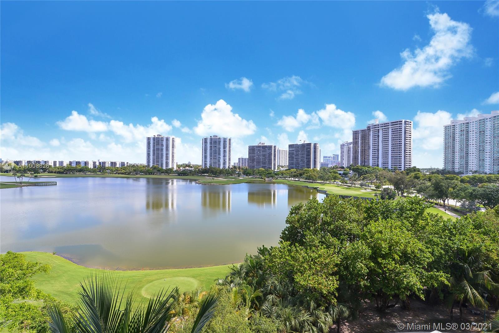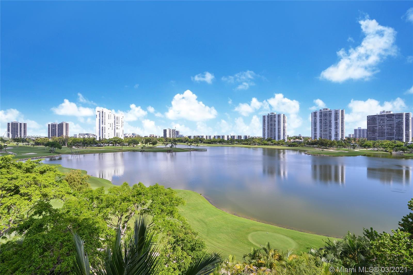 Amazing 1470 sq. ft. 2 beds, 2 full baths w/ breathtaking Golf and Lake Views. This corner unit is being offered furnished, 1 covered parking space #4-049 & 1 storage #3-018. Marble floor in living dining, bathrooms & kitchen area, carpet in bedrooms. Italian kitchen w/cherry wood cabinets, granite countertops & stainless-steel appliances. Exclusive full-service property w/24 hrs. valet & concierge, gated garage, spectacular pool area, fitness center, spa & playground. This building is located on famous Turnberry Golf Course.