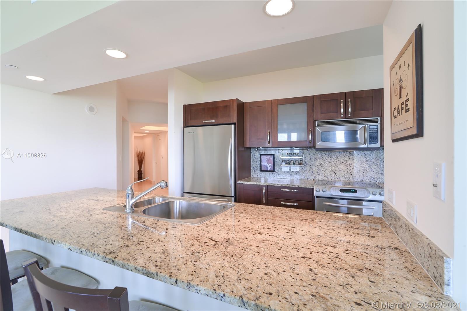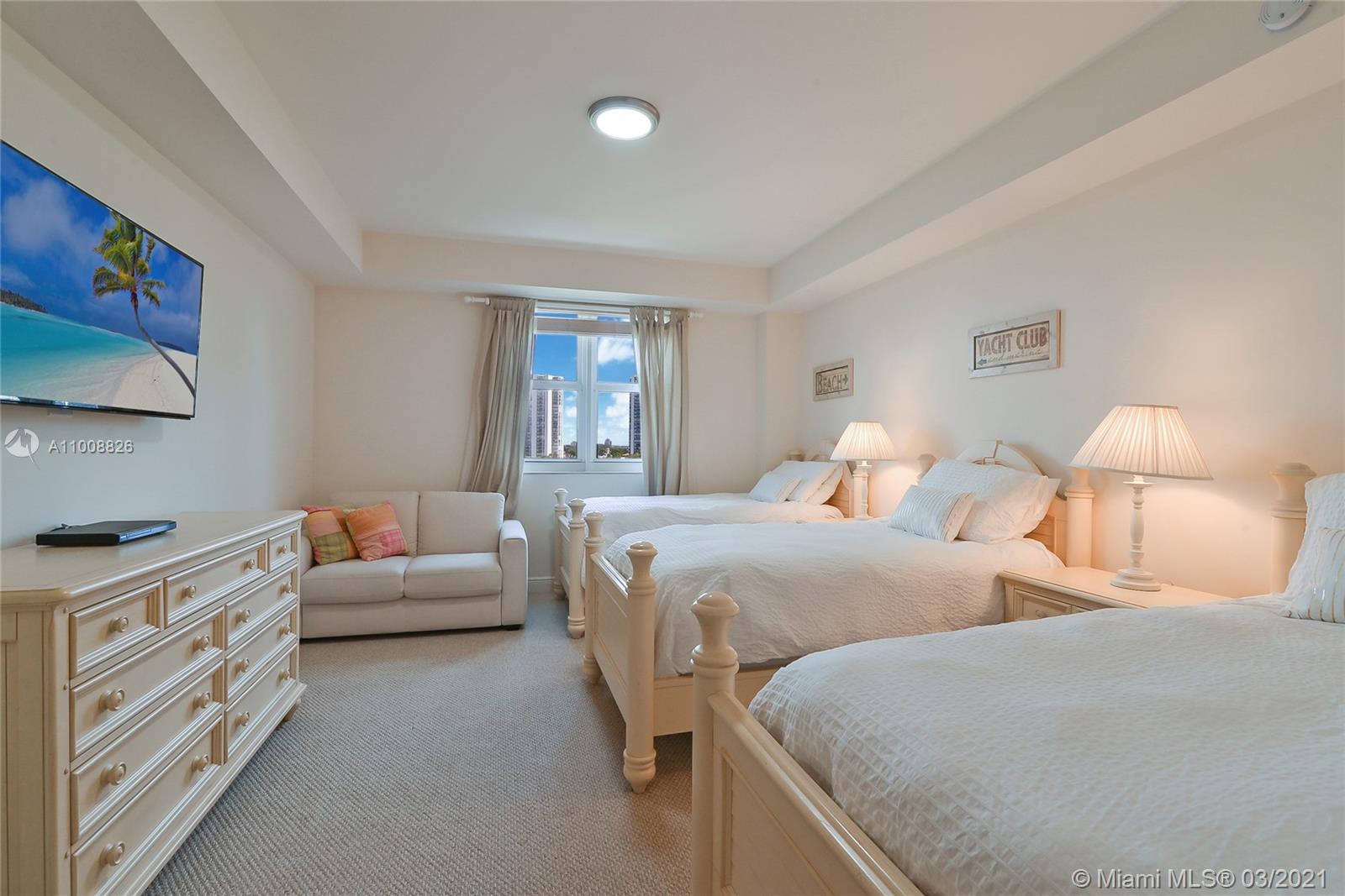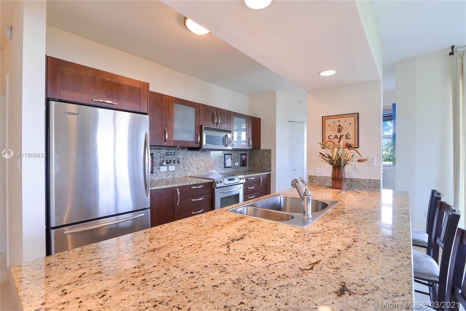 Amazing 1470 sq. ft. 2 beds, 2 full baths w/ breathtaking Golf and Lake Views. This corner unit is being offered furnished, 1 covered parking space #4-049 & 1 storage #3-018. Marble floor in living dining, bathrooms & kitchen area, carpet in bedrooms. Italian kitchen w/cherry wood cabinets, granite countertops & stainless-steel appliances. Exclusive full-service property w/24 hrs. valet & concierge, gated garage, spectacular pool area, fitness center, spa & playground. This building is located on famous Turnberry Golf Course.