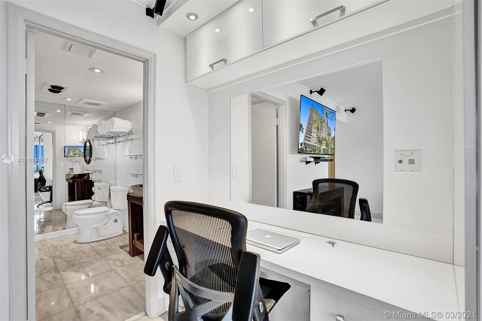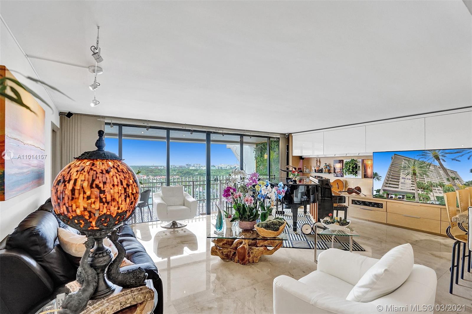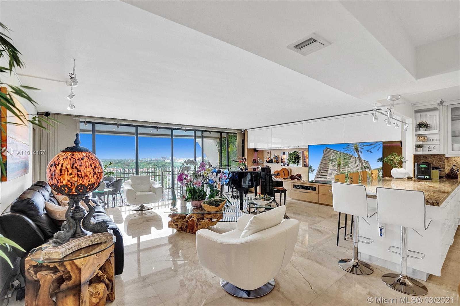 This spacious 2 bedroom, 2 bathroom offers incredible high floor views of the Bay, Grove Isle Marina, Dinner Key Marina, and all of Downtown Coconut Grove. Features include recently polished marble floors in the main living areas, a built-in bar with storage and glassware racks, recessed lighting, dining room with built-in credenza with top and bottom storage, open kitchen with granite countertops, white sleek cabinets and stainless-steel appliances. The living room has built-ins with plenty of storage space. The primary bedroom has a walk-in closet, built-in cabinets and workspace, and a beautifully updated bathroom. Watch the sailboats as you cook or enjoy sunsets from the beautifully decorated terrace. No matter what room you are in, the views will amaze you. Live at Grove Isle!