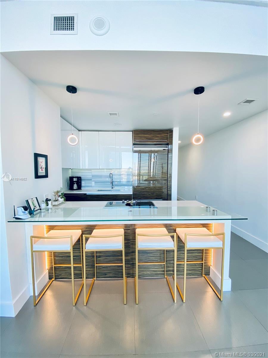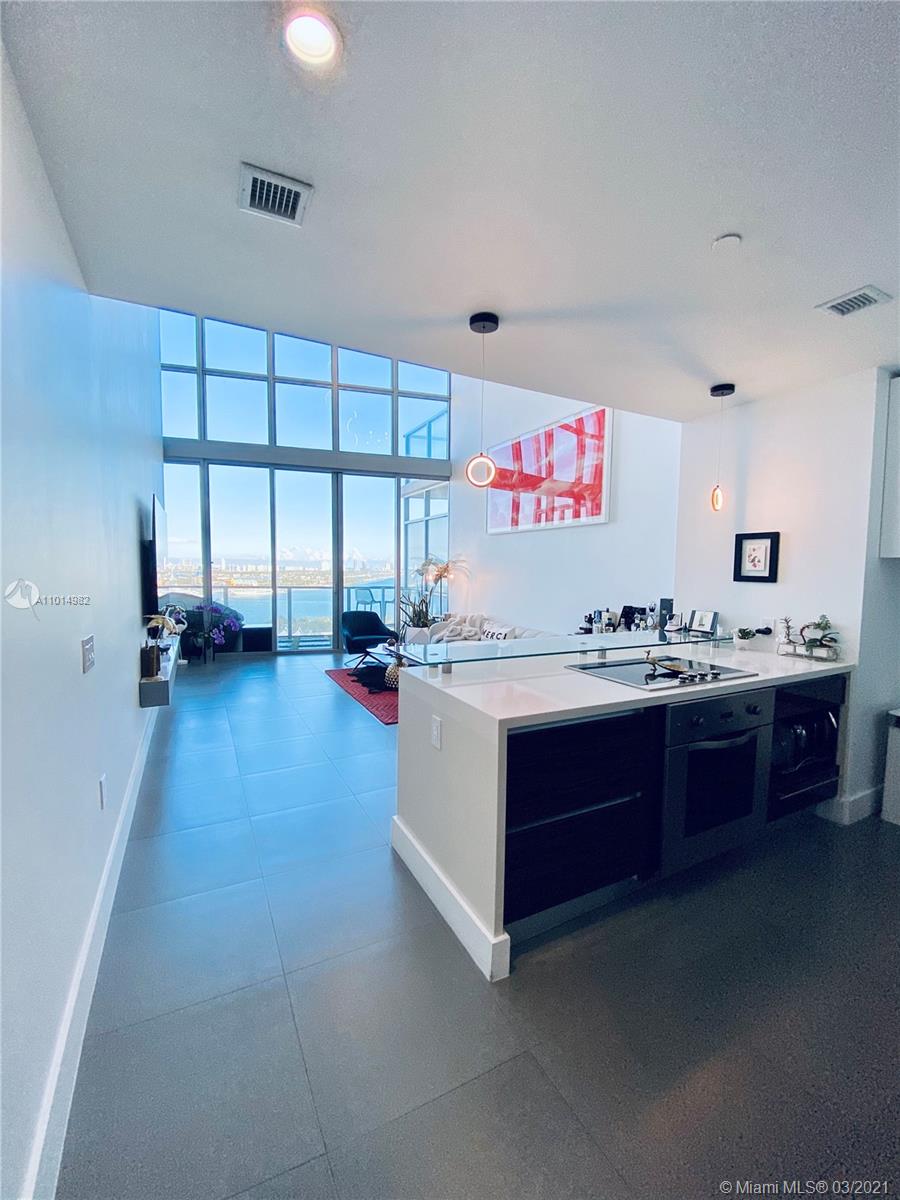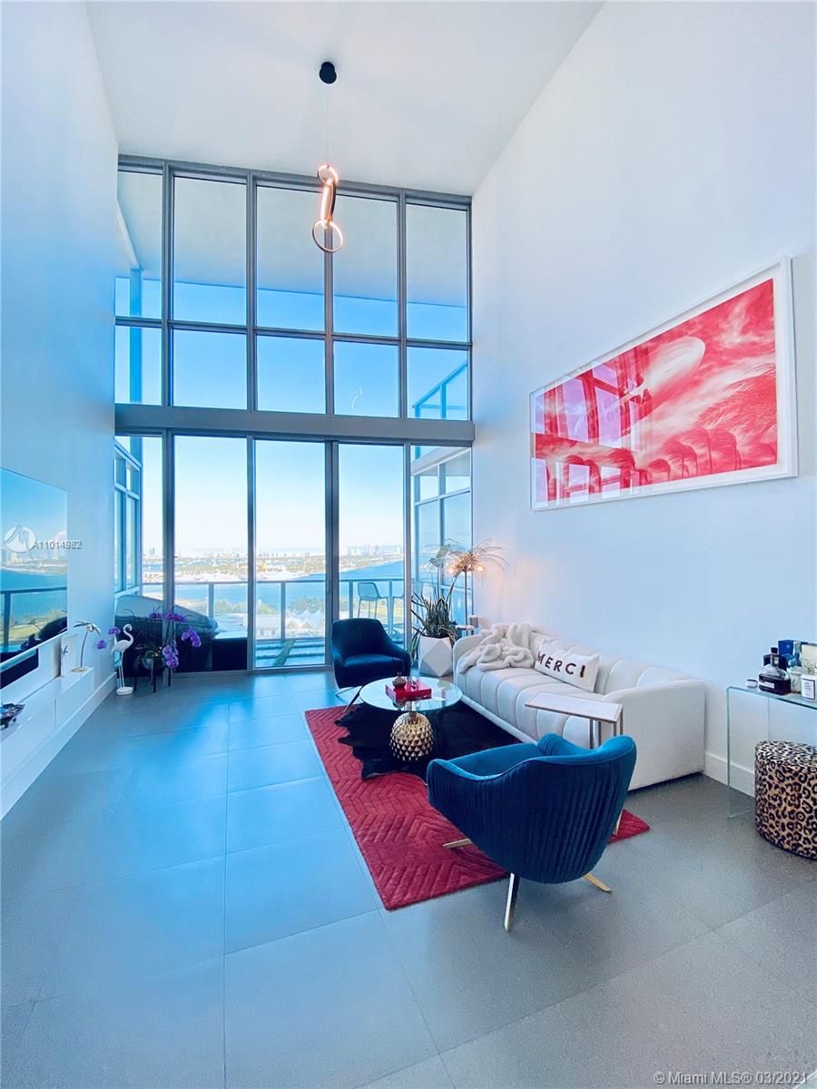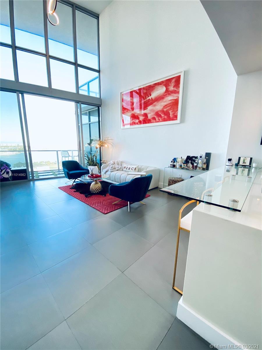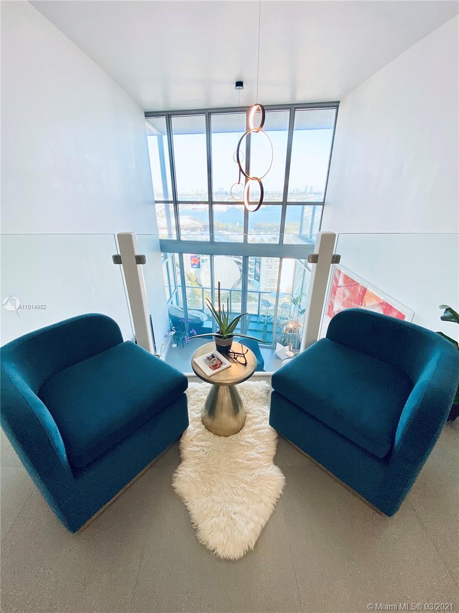 Stunning views of the Bay and Ocean from this spacious 03 line, impeccably cared for loft style 1/2 plus den/bedroom (23’ high ceiling) at the exclusive Marquis, a full service ultra luxury condo in the most dynamic area of Downtown. Kitchen boast Viking appliances & quartz countertops. Upgrades to this nearly 1,700sqft unit include brand new custom Italian kitchen upper cabinets, new custom master closet, sleek glass railing for loft and stairs, custom glass island countertop extension, modern LED lighting throughout, less than a year old high efficiency A/C unit, Custom wallpaper for a chic Miami vibe. Unit has so much more you must see. Option to purchase fully or partially furnished with just a year old modern-designer furniture. Tremendous value pricing for this home & easy to tour.