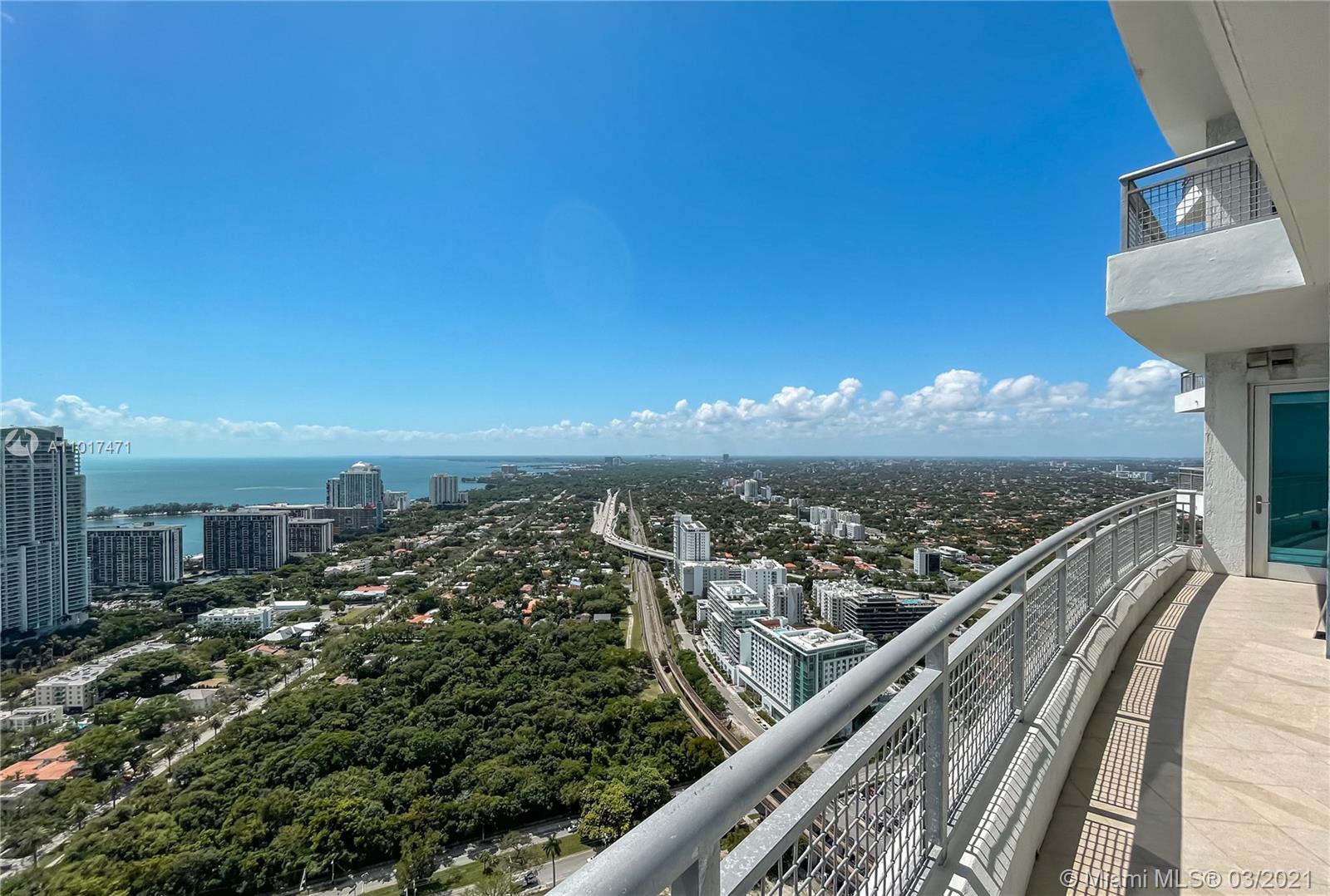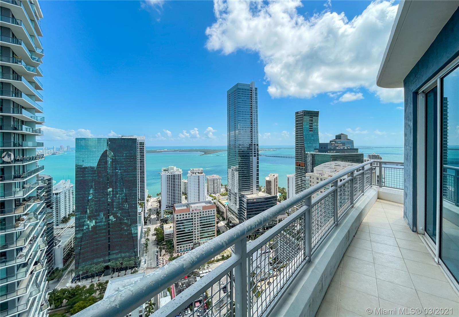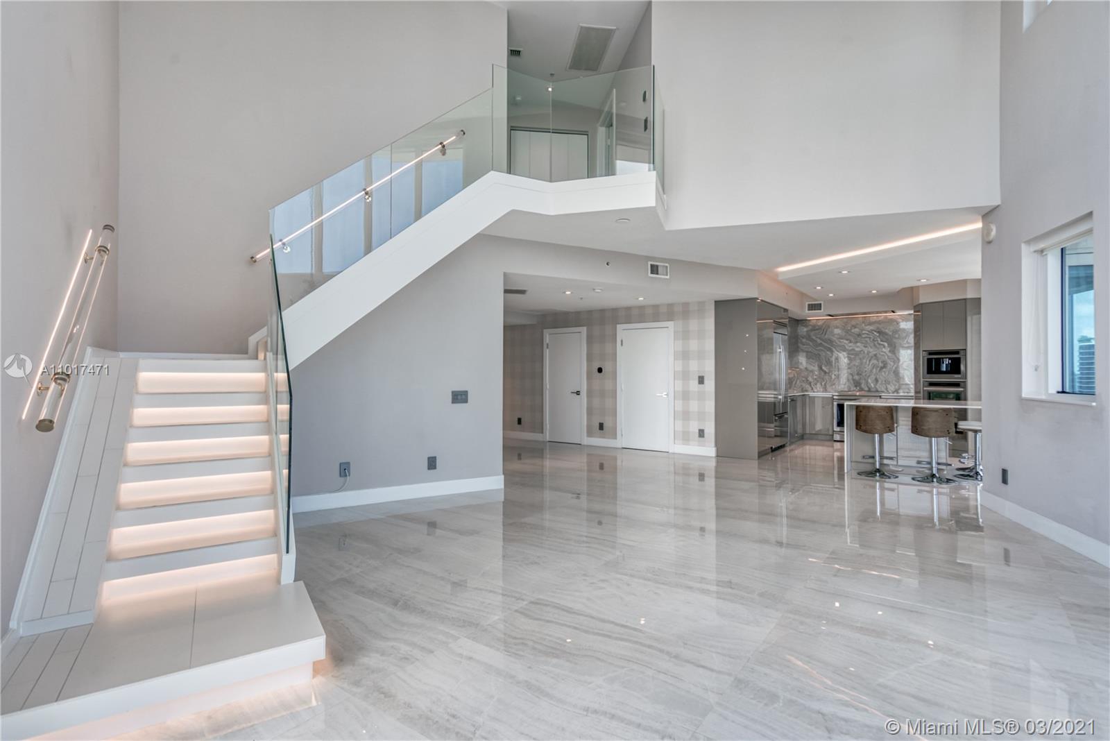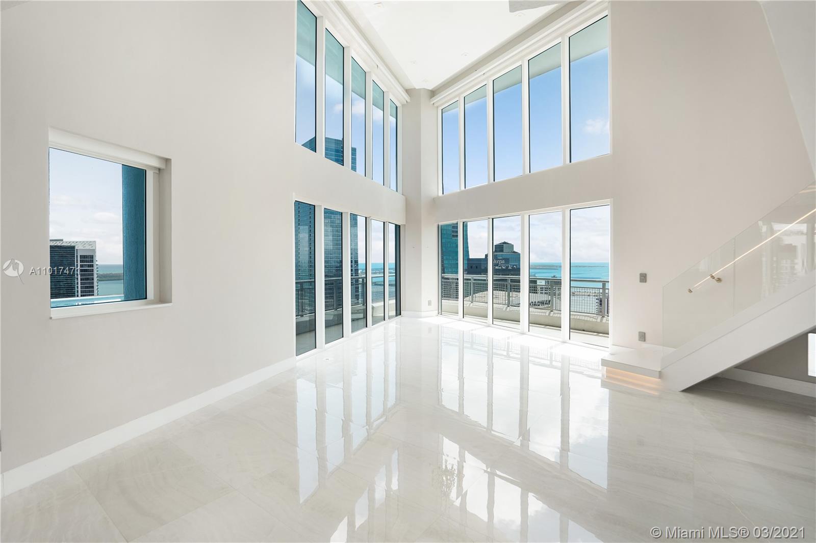 This stunning and visually dramatic 2 story residence at Infinity at Brickell is a one of a kind unit. Floating 42 floors up on the south east corner with expansive views of the Bay/ Ocean and the city. This unit will wow you from the very entrance with the double height ceilings and floor to ceiling glass windows that make you feel like you are in the clouds. Recently renovated and Inspired by Modern Italian design. Features include a custom floating staircase illuminated by LED lights, textured surfaces, wallpaper, entire marble slab backsplash in kitchen, and electronic shades. Building has resort style amenities and is extremely well located. Enjoy walking to everything Brickell has to offer. Easy to show call LA.