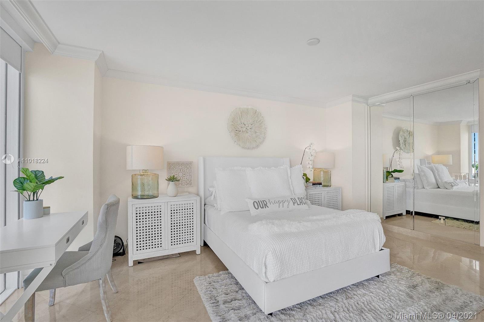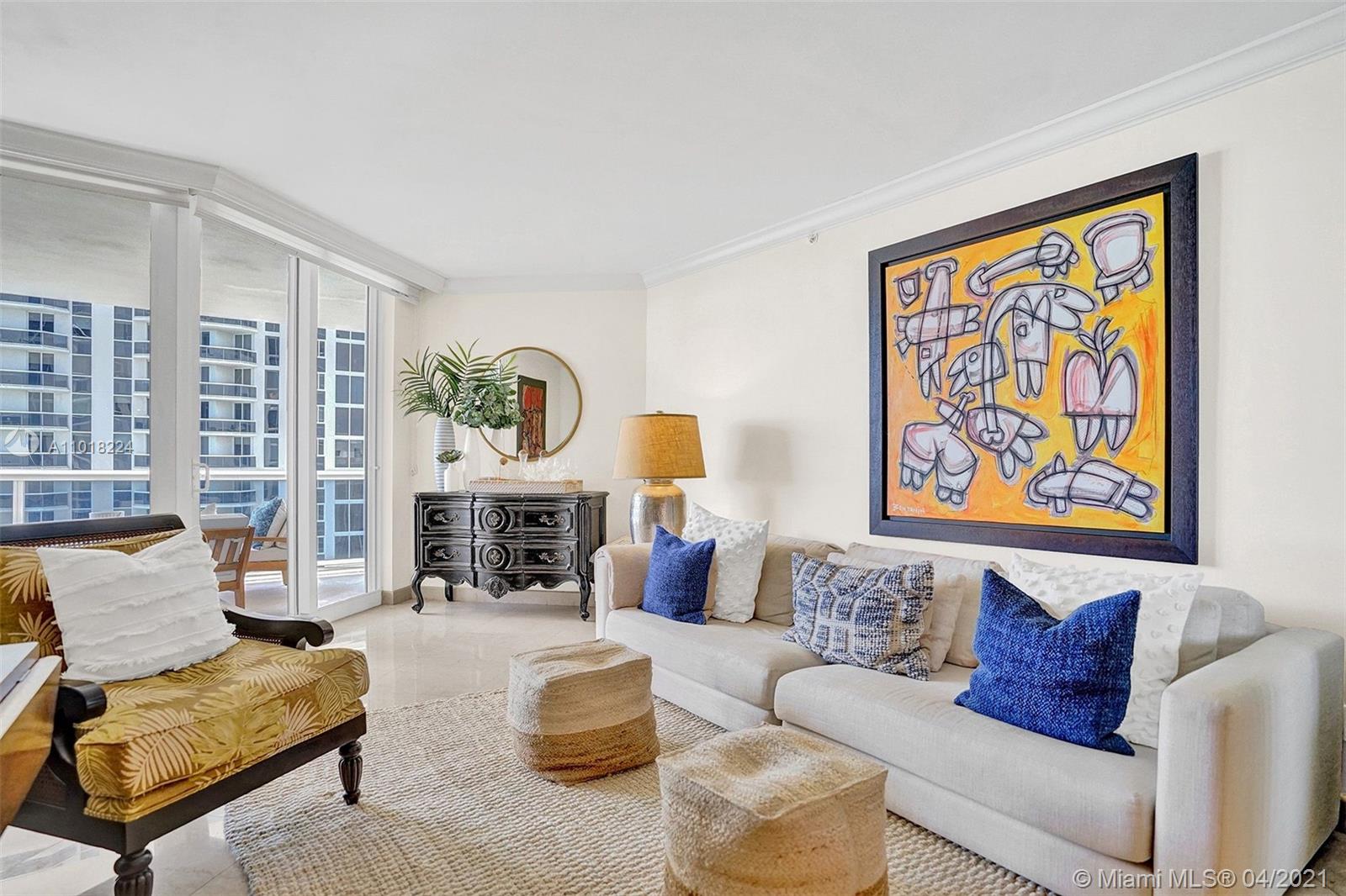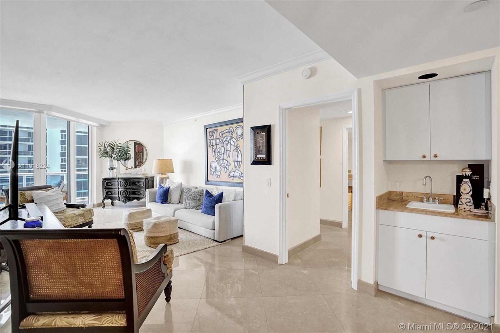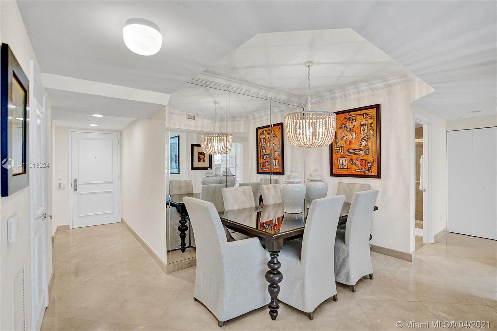 Perfect beach home! Two bedrooms plus den/office. 1550 square ft. Prestigious Blue Diamond Condominium is located on 500 feet of pristine beach, just minutes from the world-renowned South Beach, Miami International Airport, performing arts, Design District, full-service building, 16000 square feet of amenities, and 24-hr cardio gym. Dining room lamp displayed in photo not conveyed