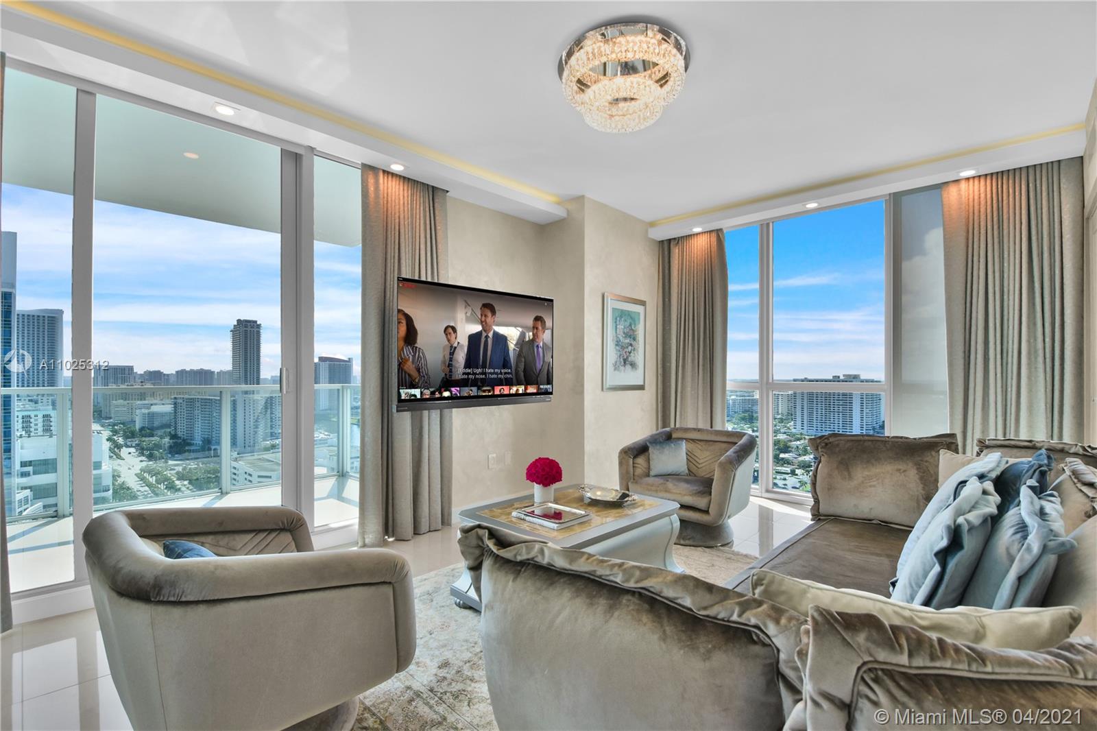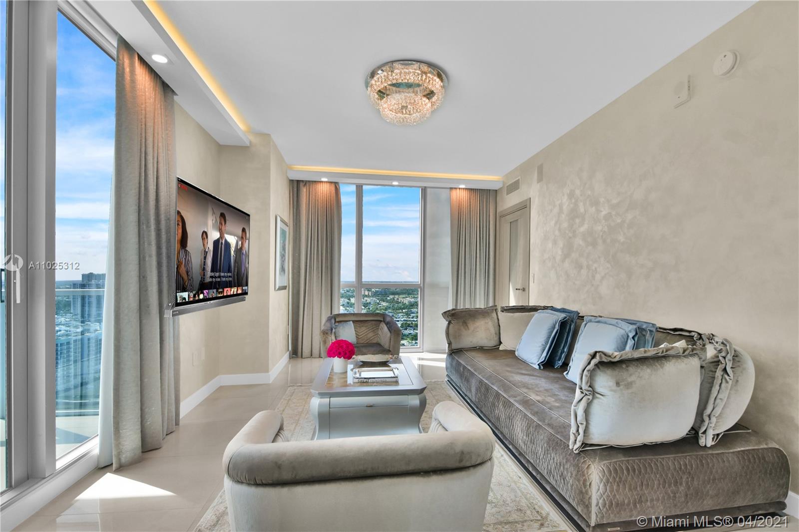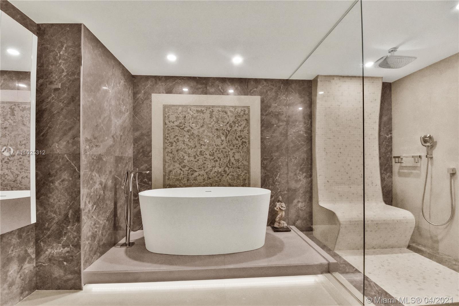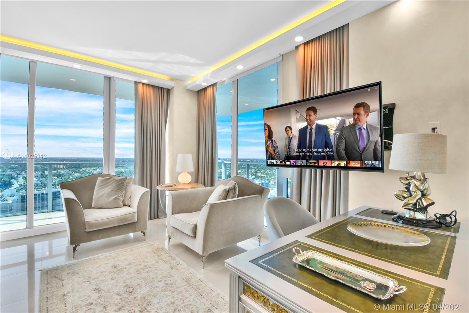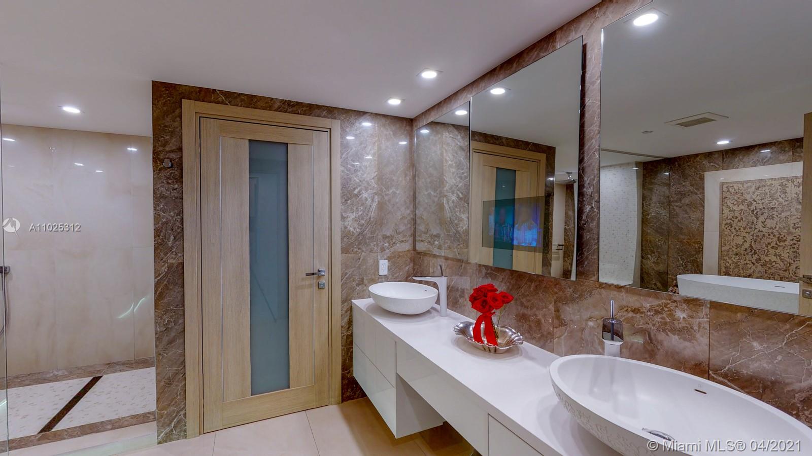 Luxuriously renovated apartment with no expense spared offering nearly 2,308 +-SF of interiors and +/-750-SF of wrap-around terraces. Wake up to panoramic views and sunrises and enjoy five-star amenities offered right here that will make every day feel like a vacation. This residence features a private foyer, floor-to-ceiling high impact windows, Italian “Versace” tiles on floors and walls, Versace wallpaper, new doors from Italdoors, Mirror TV in the master bedroom, LED/Lutron lighting, new A/C, Smart Home System, Soffits lighting, European style kitchen, upgraded European style luxurious baths with spa shower, and sumptuous master suite with hers/his Velart closets. Electric shades, Sound system, Italian Deco Painting on walls.Onyx Slab on the flooring at the foyer. New washer/dryer.