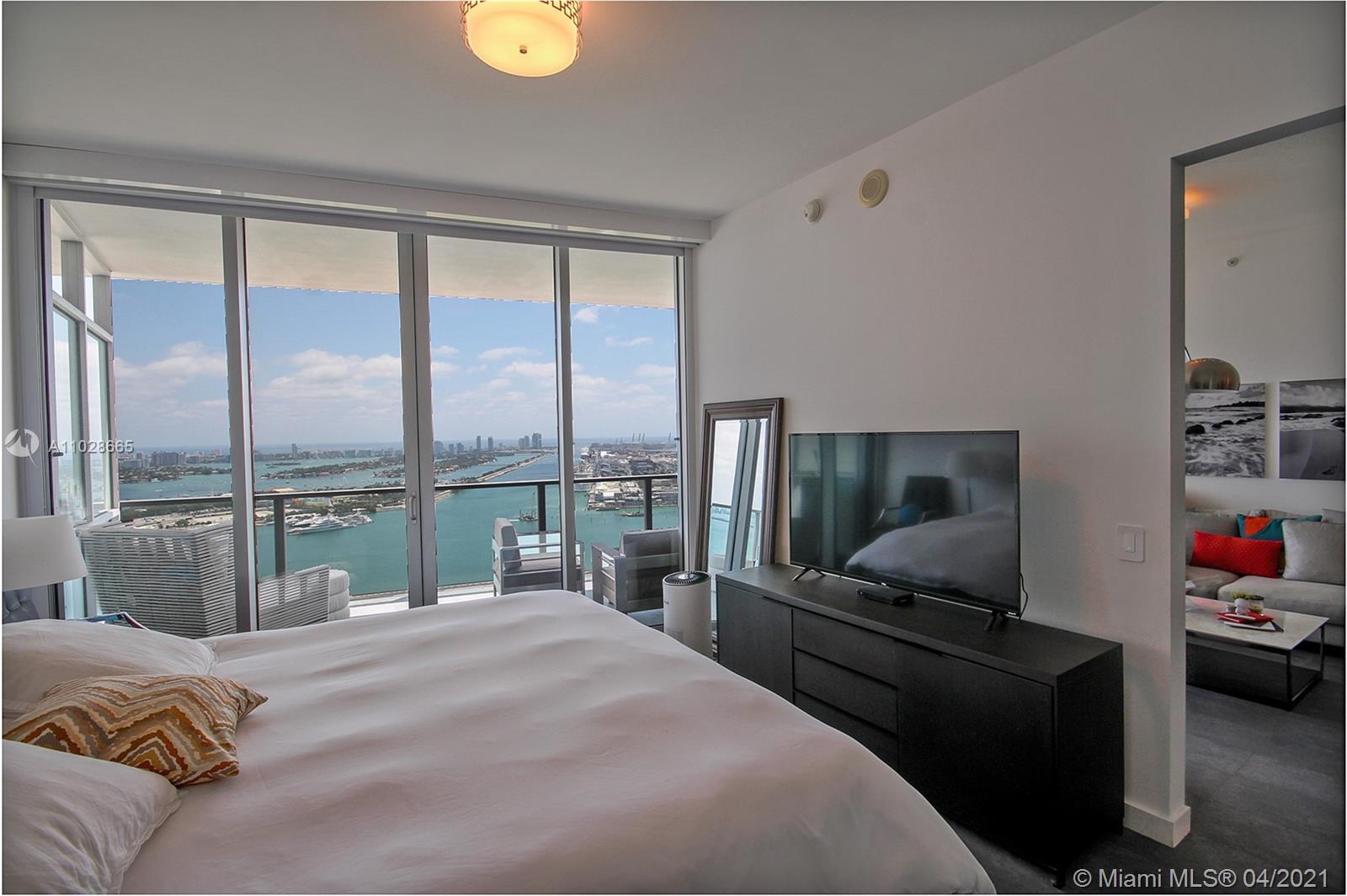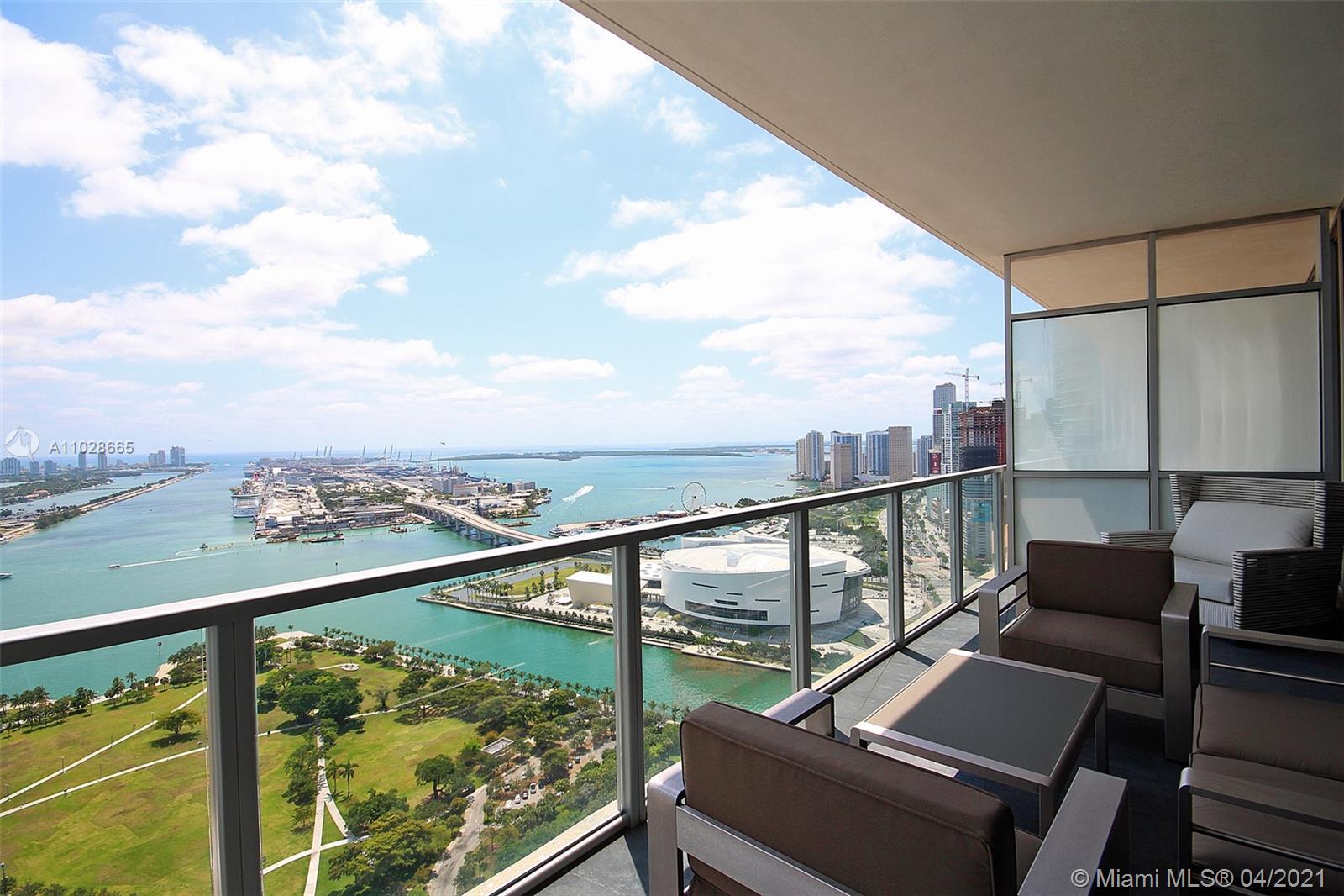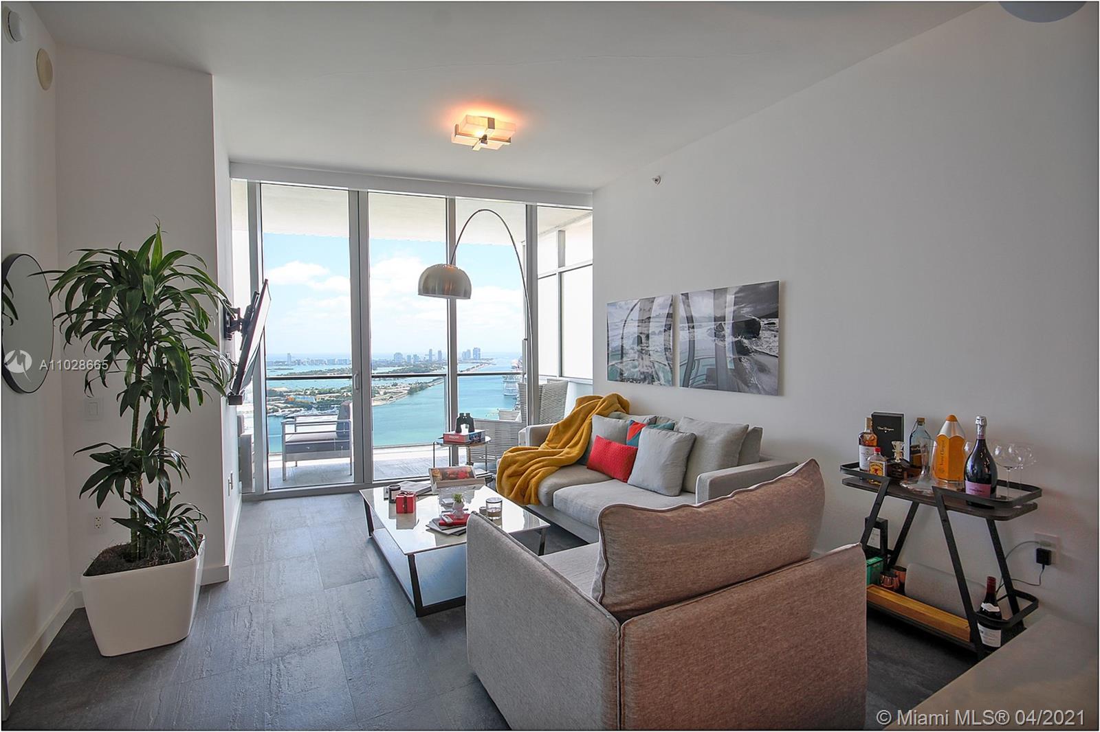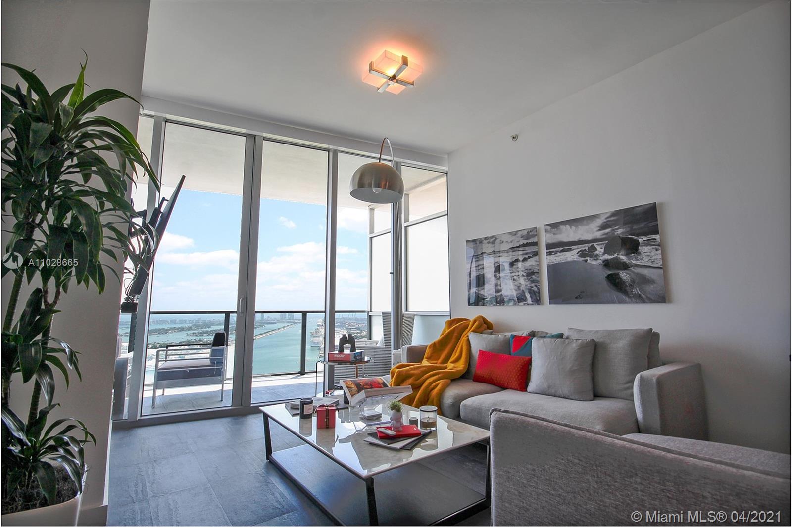 Fully furnished, move-in ready unit in best 2 bed line at Marquis w/direct bay, ocean, & Port views. 2 private elevators (recently renovated) open into your own foyer that is sure to impress. 10 ft ceilings in living/beds. Floor to ceiling impact glass spread across entire east side of the unit lead to a deep balcony, NO neighboring buildings for complete privacy. Electronic shades throughout. Second bathroom recently renovated (glass enclosure to be installed). Custom built-in wall and ceiling LED lighting. Custom elevator panels. Plug & play smart home: control your lighting and thermostat with Google or Alexa. Custom closets. Low density building w/best service & privacy. New gym, 2 pools, residents' lounge, poolside bar, basketball, & more. Storage and 1 parking. 1GB internet provided.