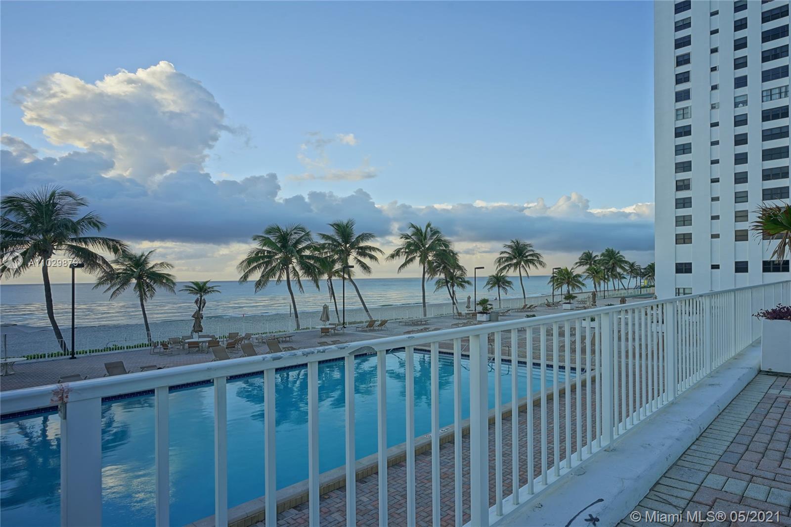 Beautiful ocean front beach condo near Hollywood Broadwalk & Hallandale Beach. See the ocean from your updated kitchen w/granite, SS appliances & wine fridge, & marble floors. Lots of counter & storage space! Oak hardwood floors, ocean views, & crown moulding in the living & dining. Split bedroom floor plan. Custom, LED, and recessed lighting throughout. Impact windows & doors. Watch the pool & beach activity from your elevated private balcony. Resort style amenities include 2 heated pools, library, golf room, 2 fitness ctrs, salon/sauna, billiards, card room, kid's room, business ctr, yoga/water aerobics, umbrella/beach chair service, on-site restaurants, valet, 24 hr security. Near downtown Ft Lauderdale, Miami, FLL airport, & more. Fee inc high speed internet. Assessment paid! See video