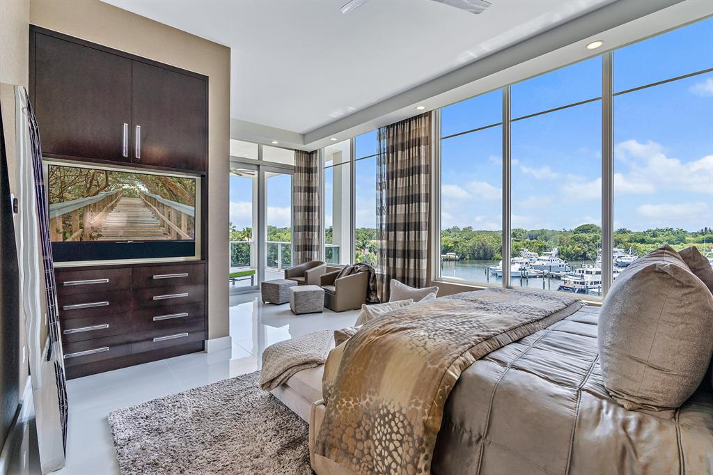 Magnificent intracoastal sunrise and sunset views from this one of a kind luxurious SOUTH FACING Penthouse just blocks from the ocean. Elegance begins as you step from your private keyed elevator to an open floor concept coupled with 12' Floor to ceiling windows FACING EAST SOUTH AND WEST allowing for intracoastal views from nearly every room AND the oversized balconies. This is the only intracoastal view in Azure. Luxury continues with high-end finishes, custom cabinetry, full size wine cuvee, walk-in closets, bonus room, fireplace, electric shades & more. 24/7 manned gate, full service marina, dock availability, business center, lockers & sauna, putting green & golf simulator. Temperature controlled garage, heated pool & spa, fitness center, club room & climate controlled wine room!