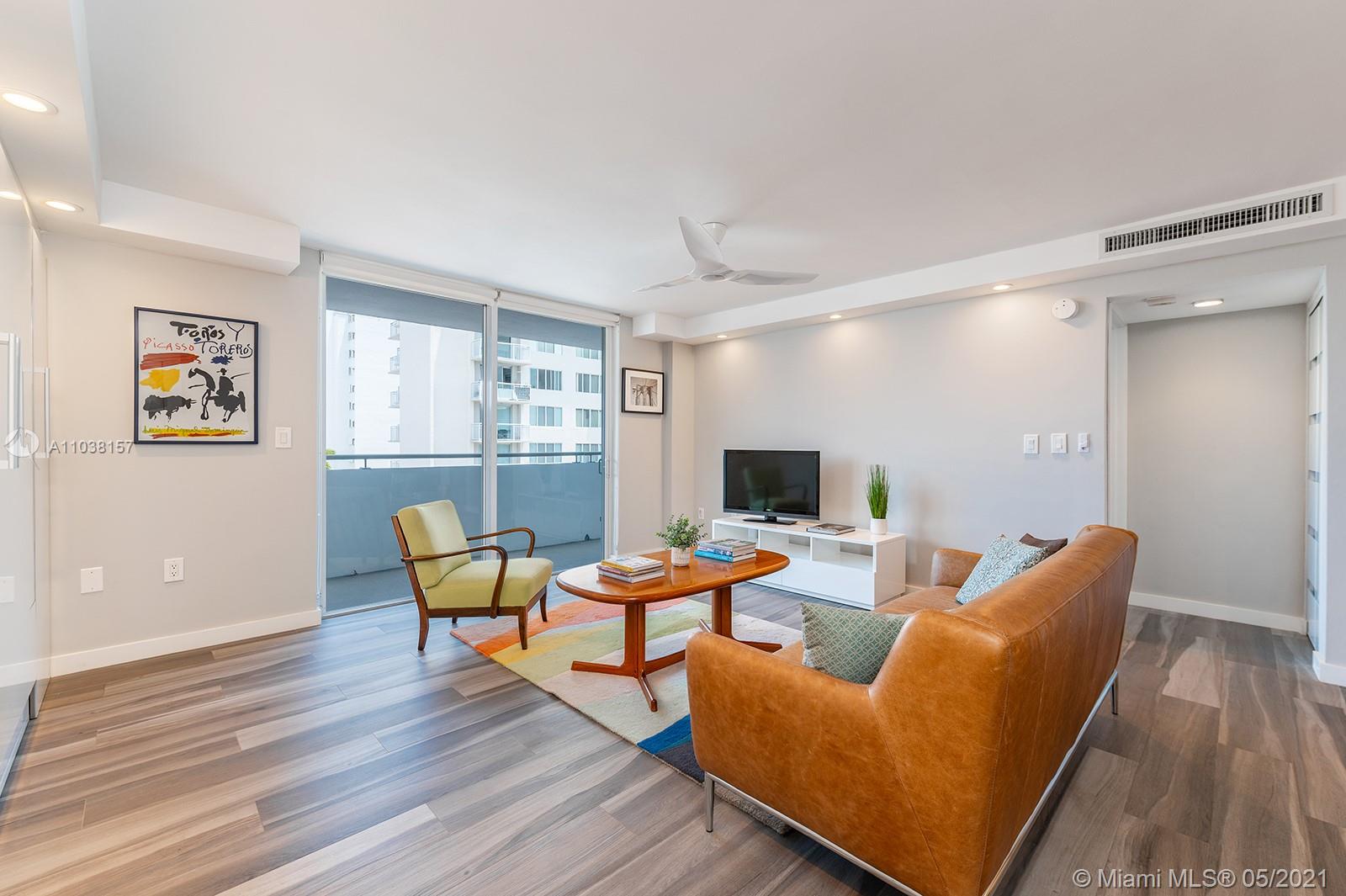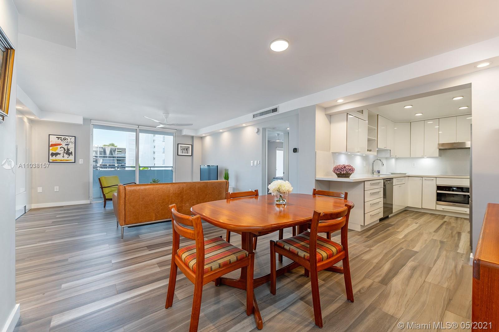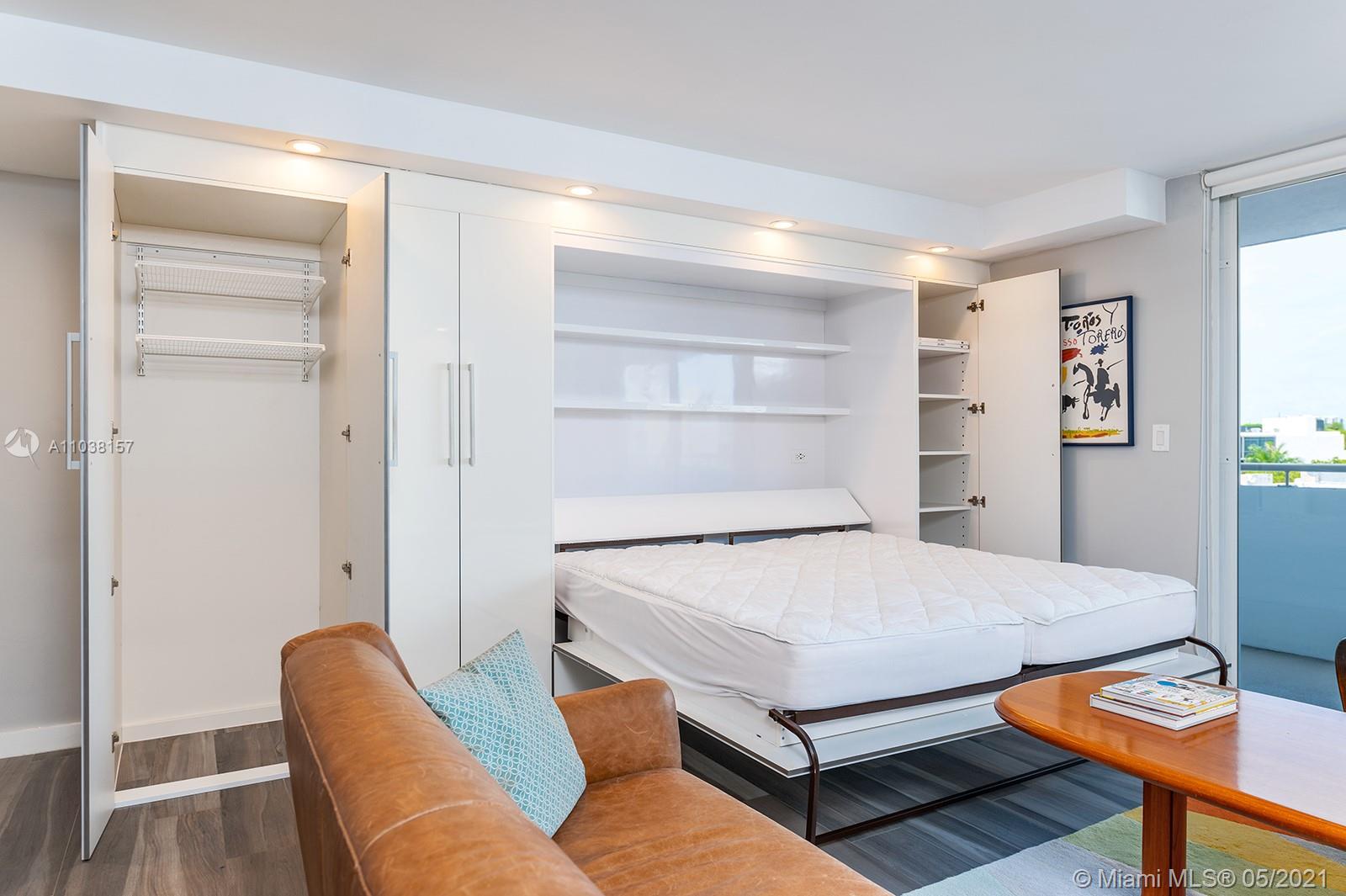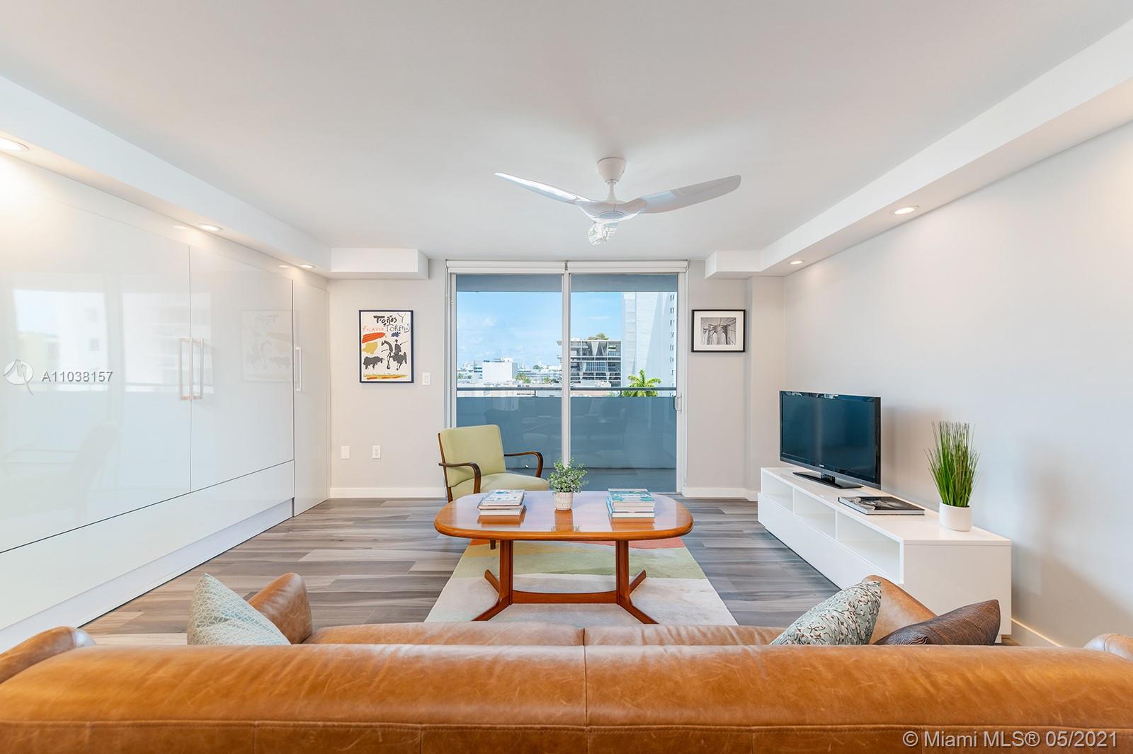 Everything you've been looking for: Space, light, completely renovated, steps to Lincoln Road! Oversized 868 sq ft 1BR/1.5BA residence has been carefully and completely renovated: Porcelain floors, modern open kitchen with custom cabinetry, quartz counters, top-of-line Miele and Fisher & Paykel appliances. Spacious walk-in shower in master bath, plus extra half-bath. Huge rooms, massive walk-in closet, built-in storage cabinets includes ultra-modern wall bed for overnight guests, custom finishes, washer/dryer in unit, new energy efficient A/C, tankless water heater, complete impact windows and doors, custom blinds. Oversized balcony with lovely views overlooking Lincoln Road West neighborhood. Pool, covered parking, low maintenance includes reserves, quiet street off Lincoln Road.